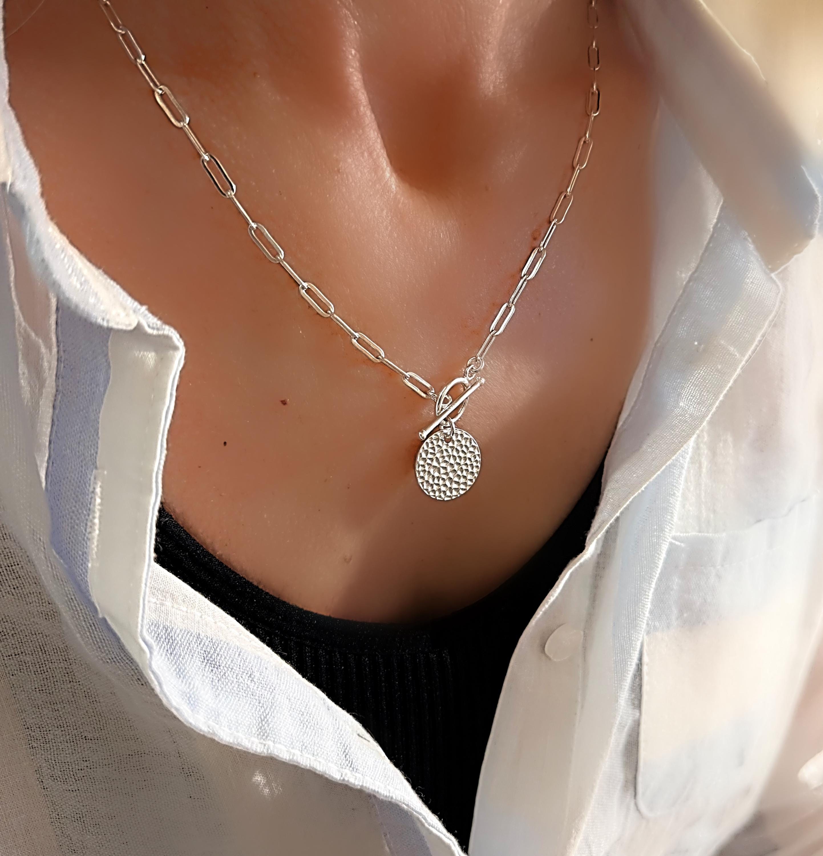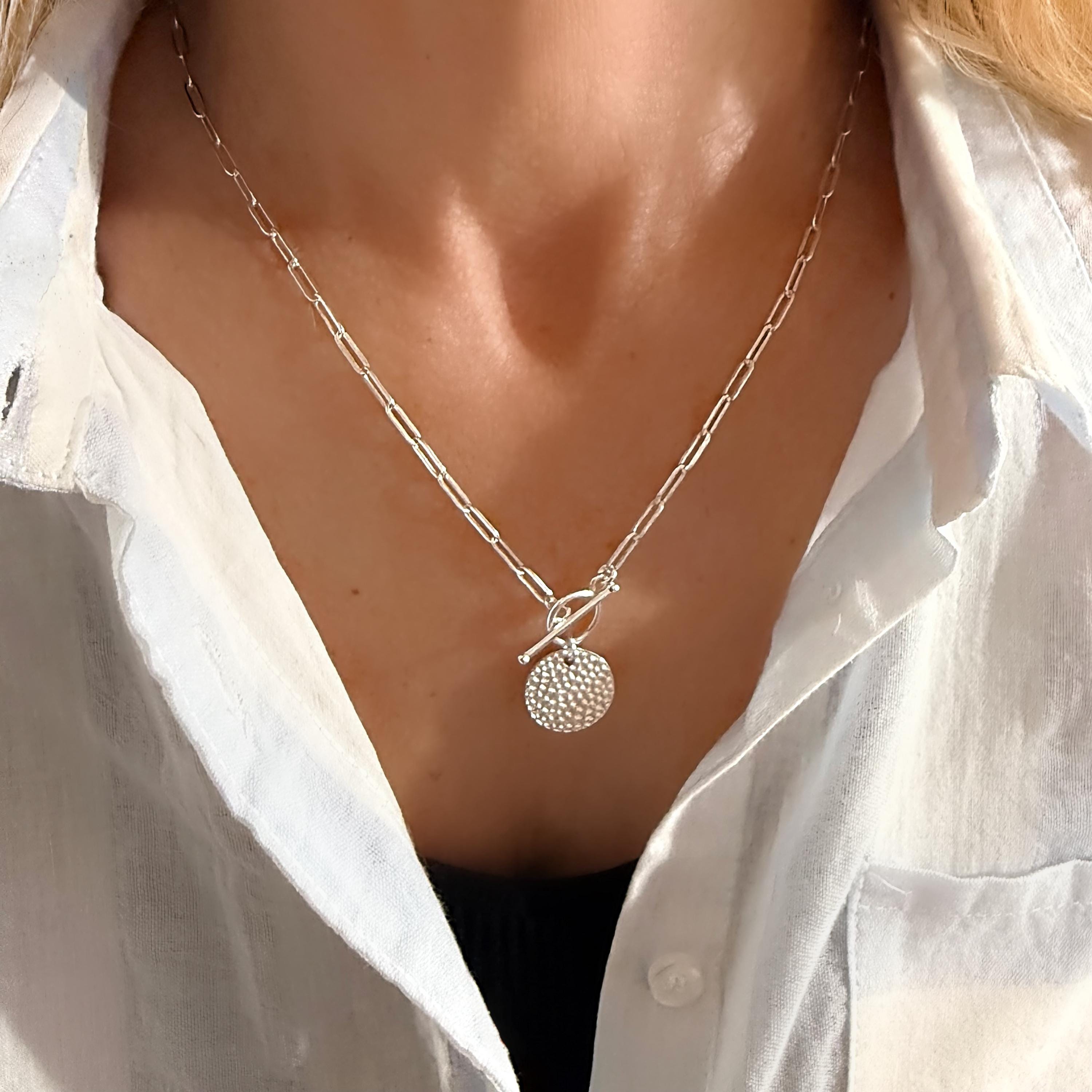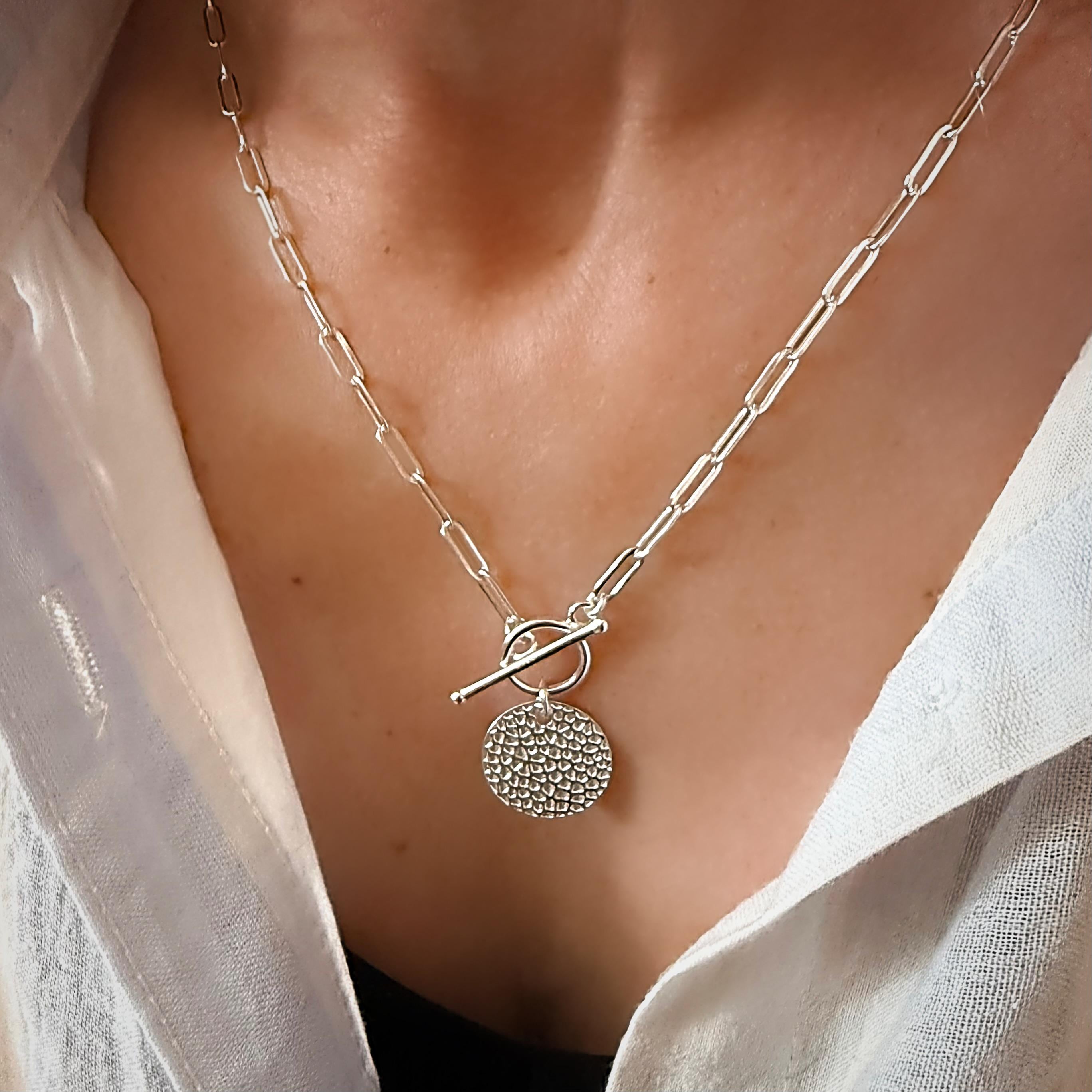 925 Silver Paperclip Chain with Toggle Clasp and round, textured, medallion pendant.