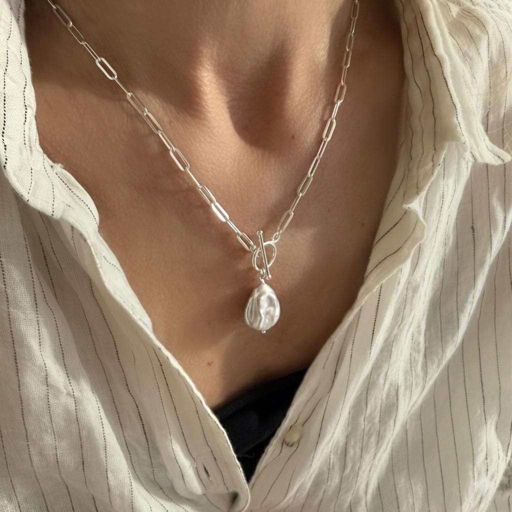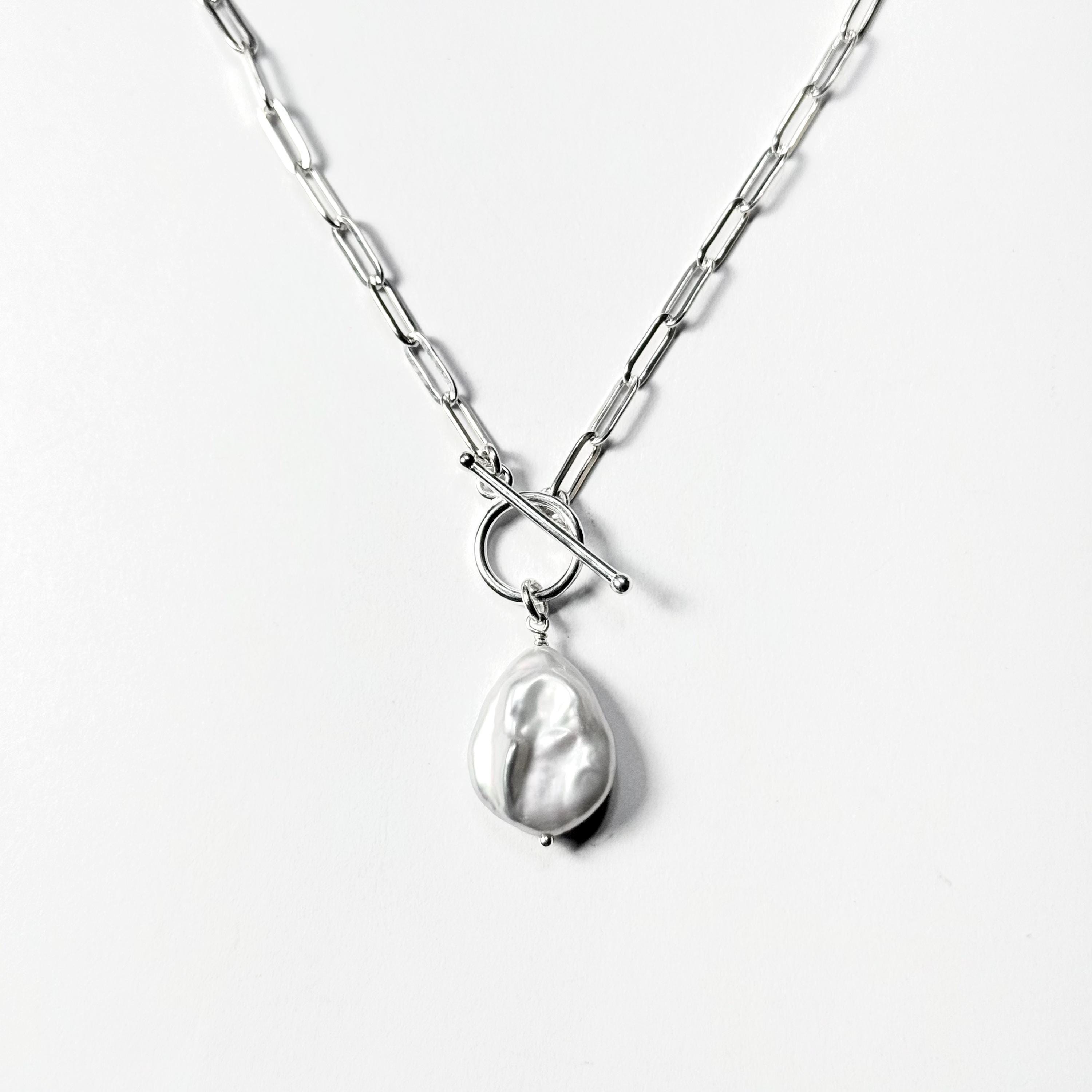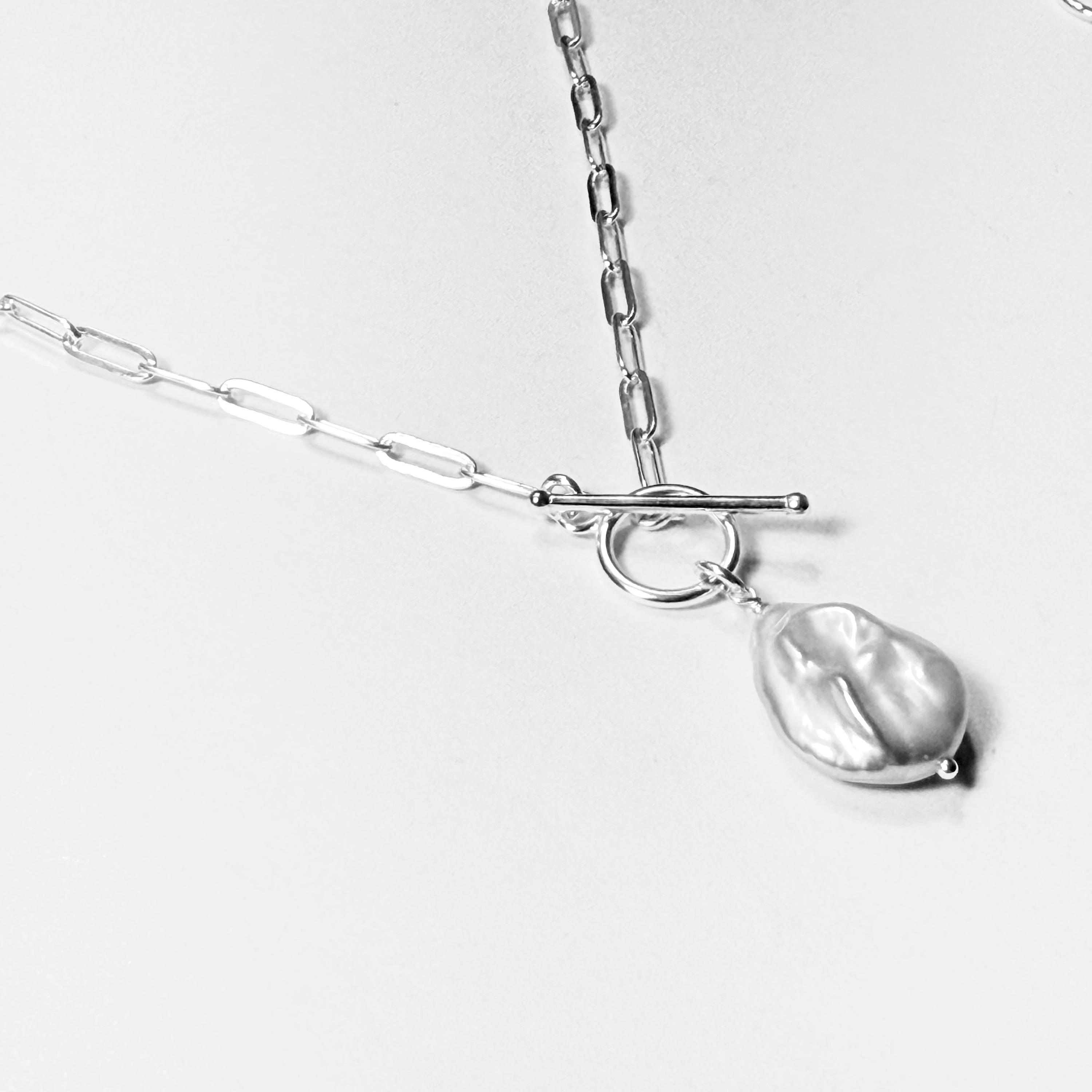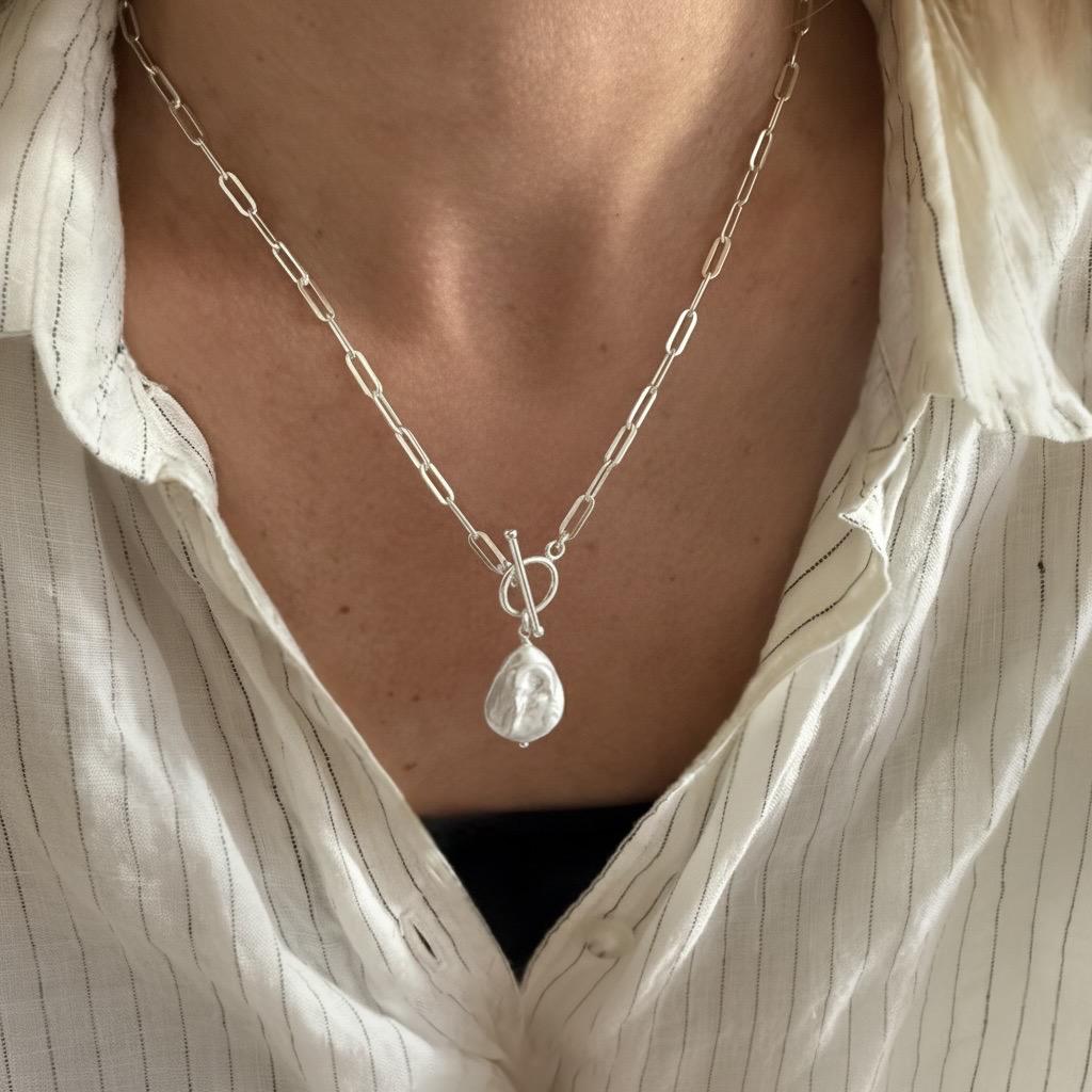 A toggle clasp and pear-shaped pearl are the focus of this classic sterling silver paperclip necklace.