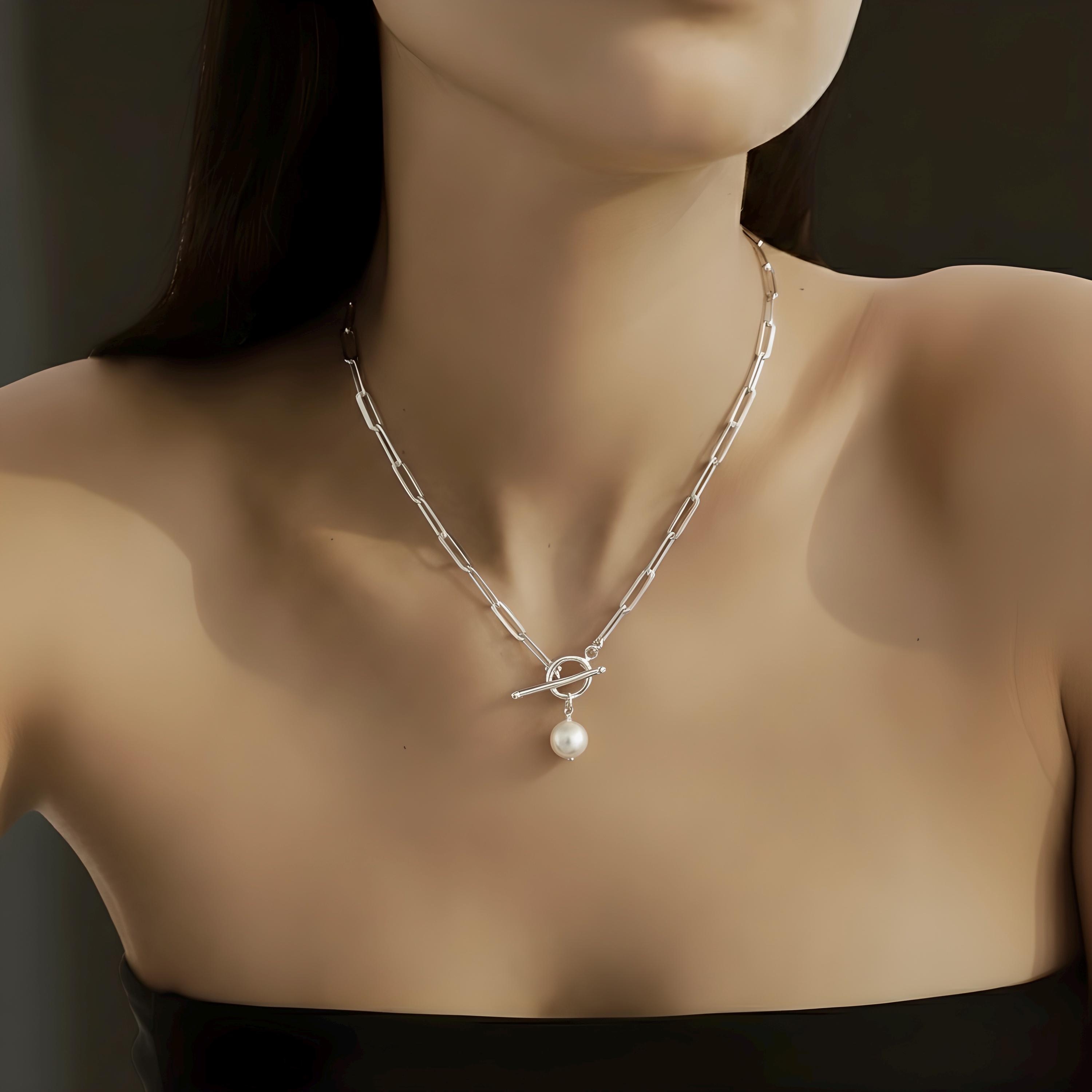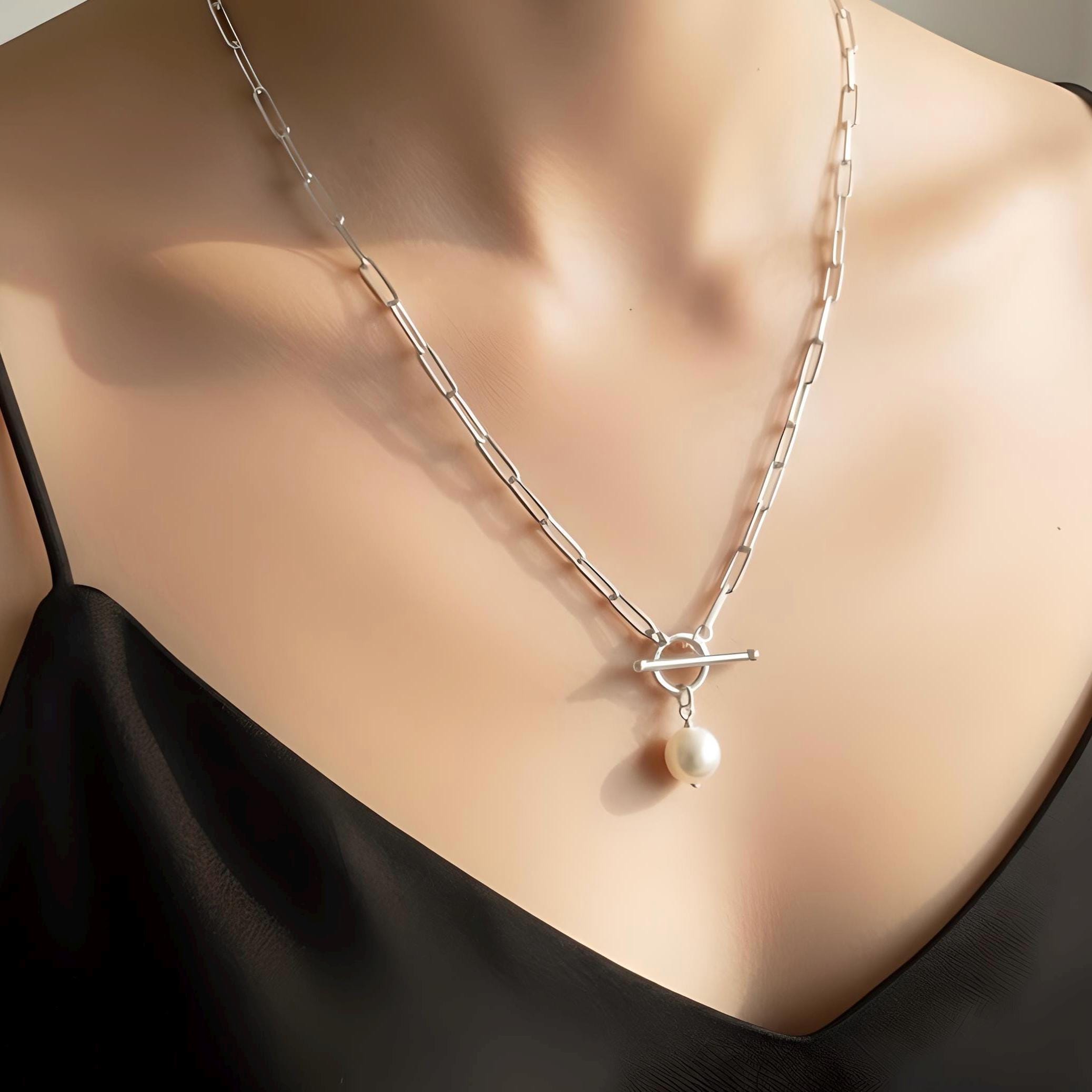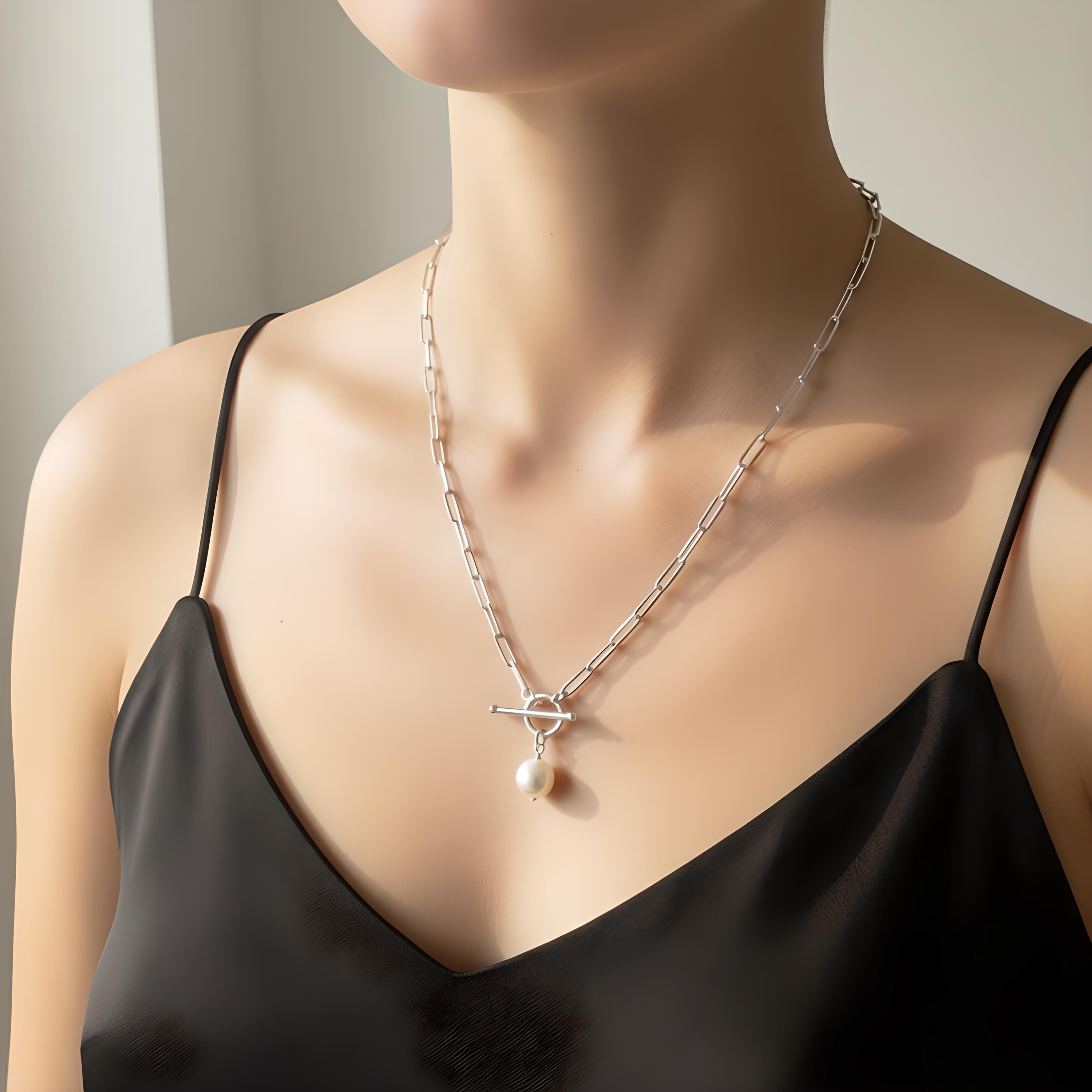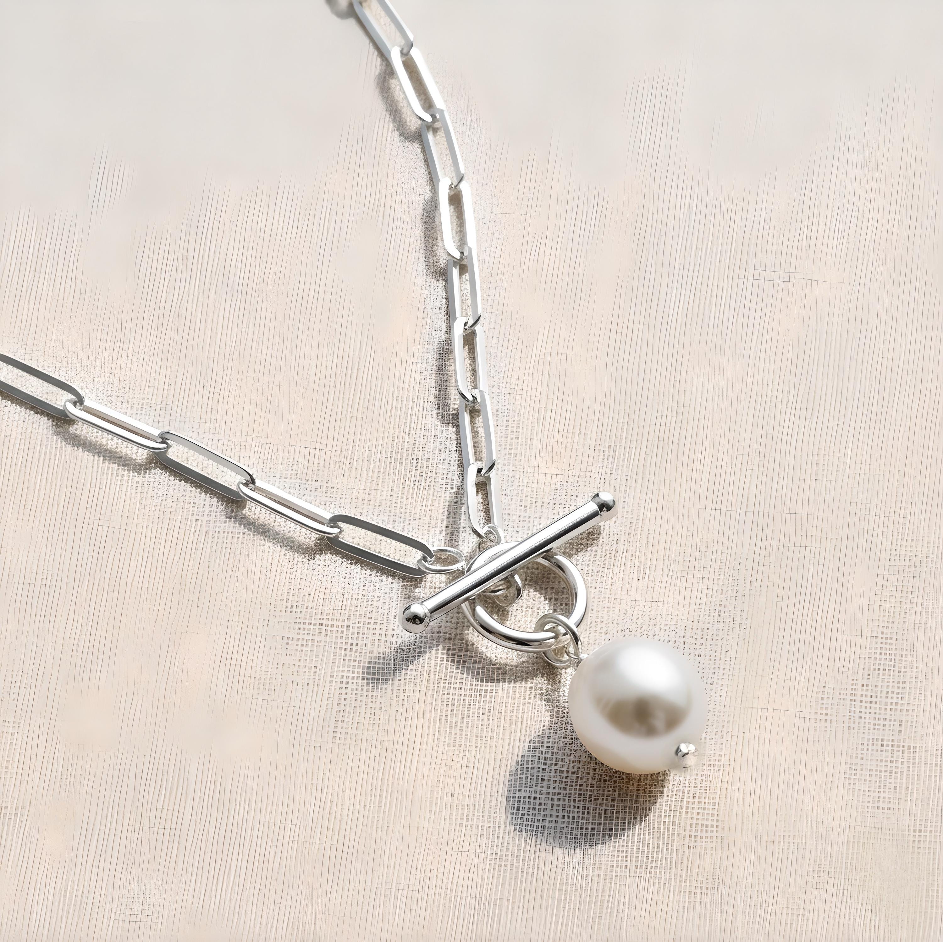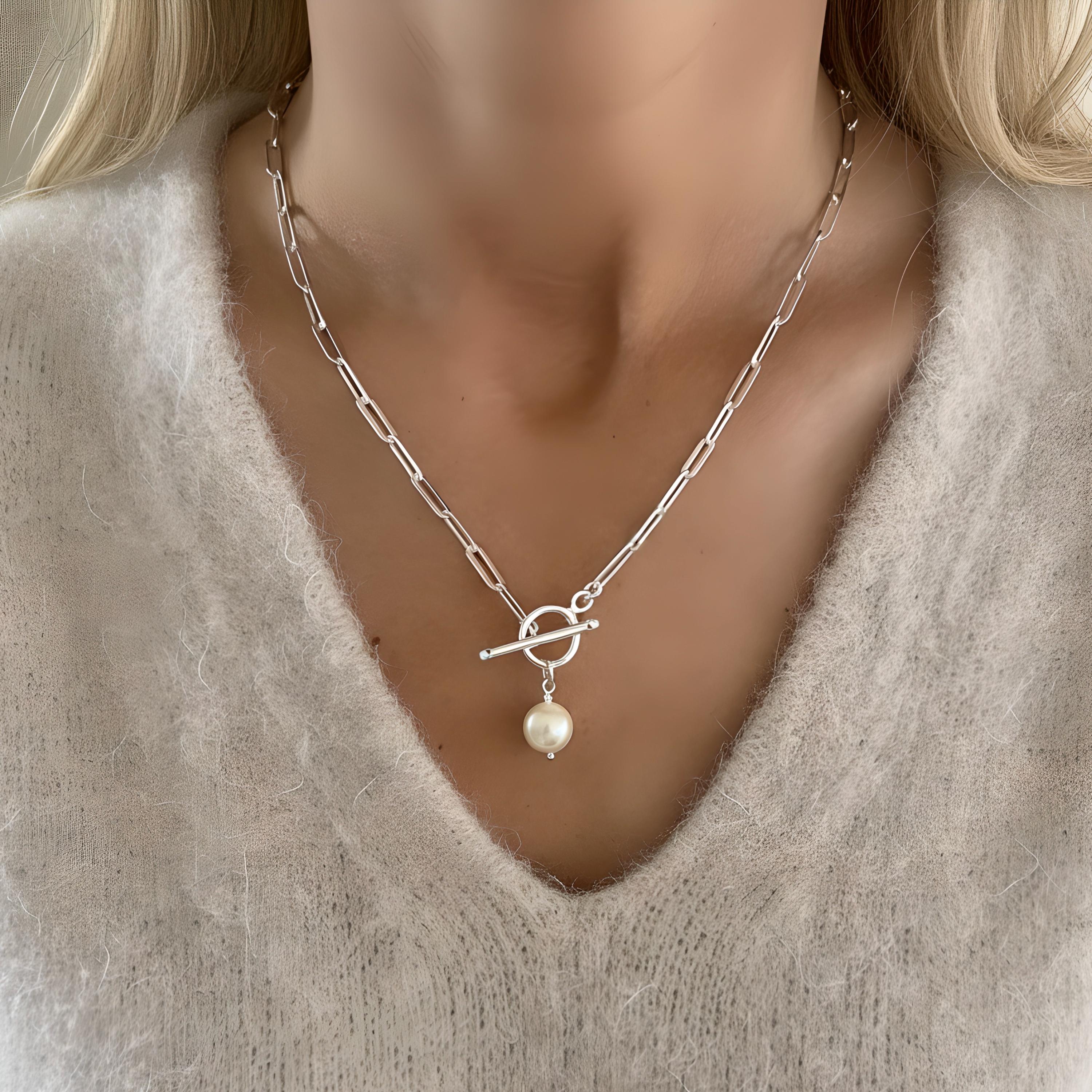 A silver paperclip chain necklace with a single genuine pearl pendant.