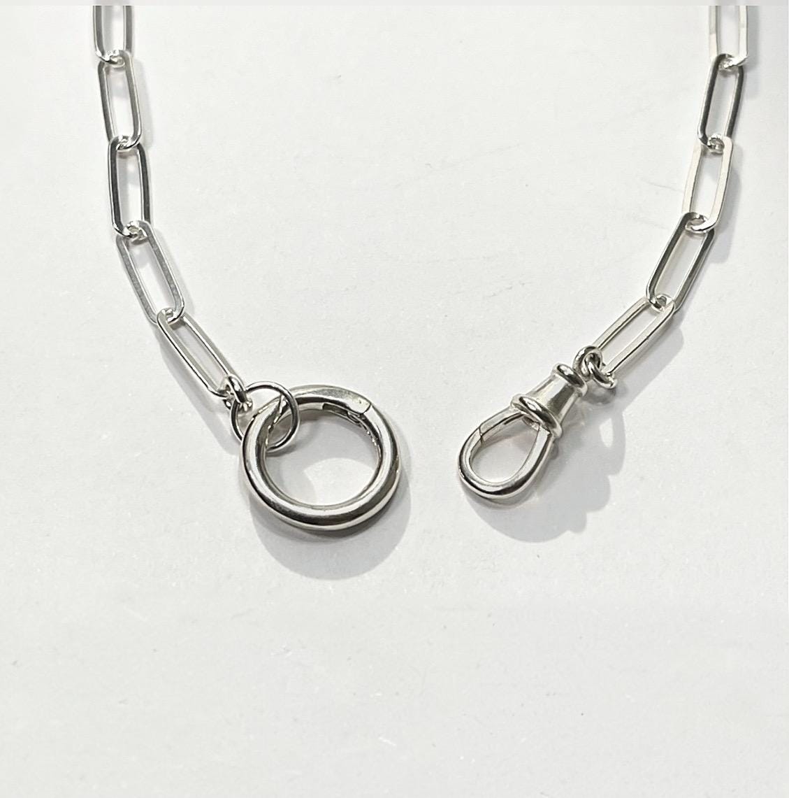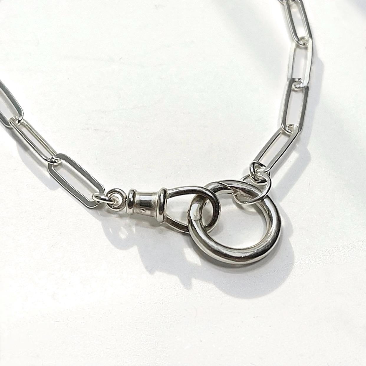 A modern sterling silver paperclip necklace with 2 interlocking clasps.