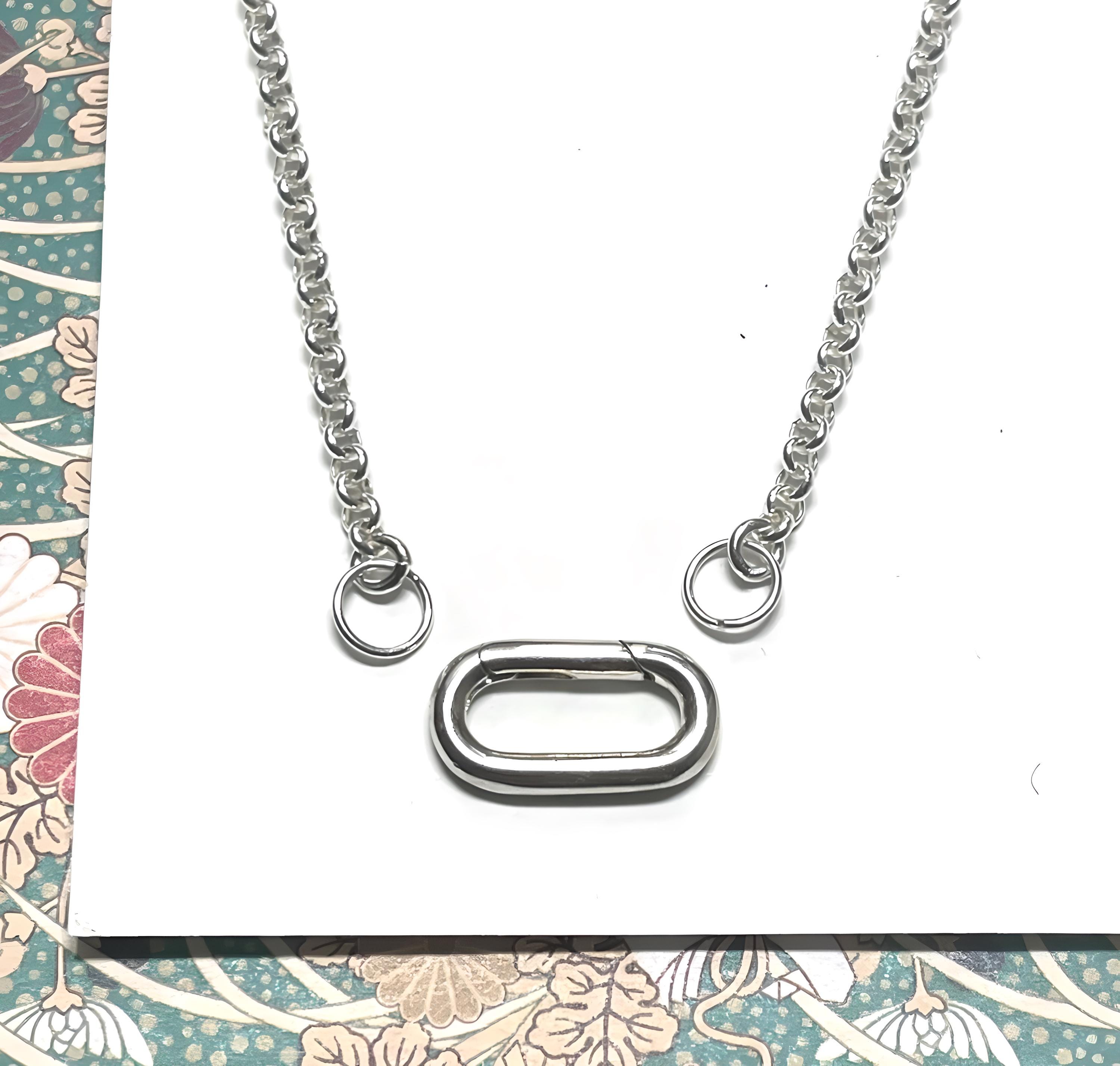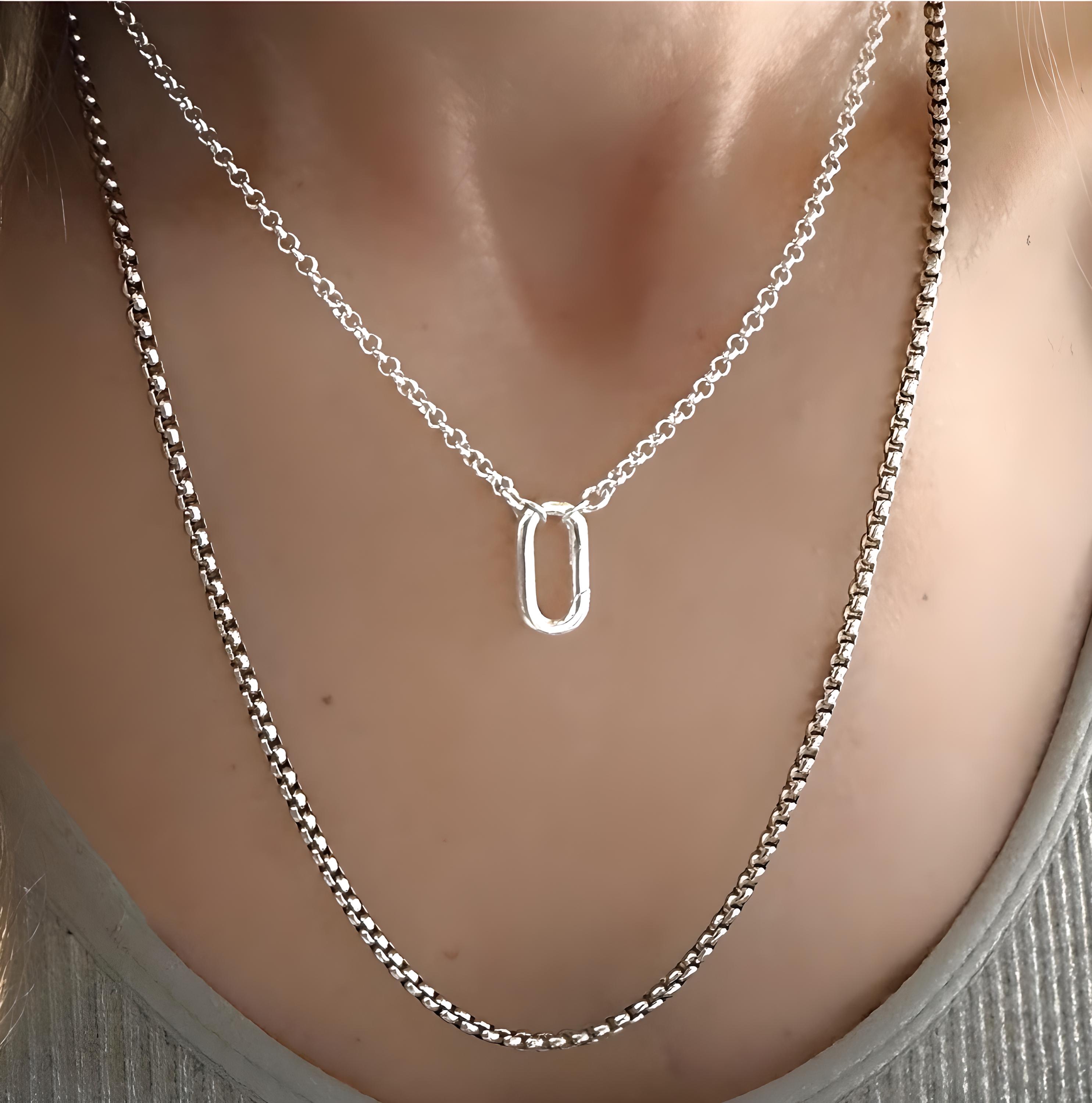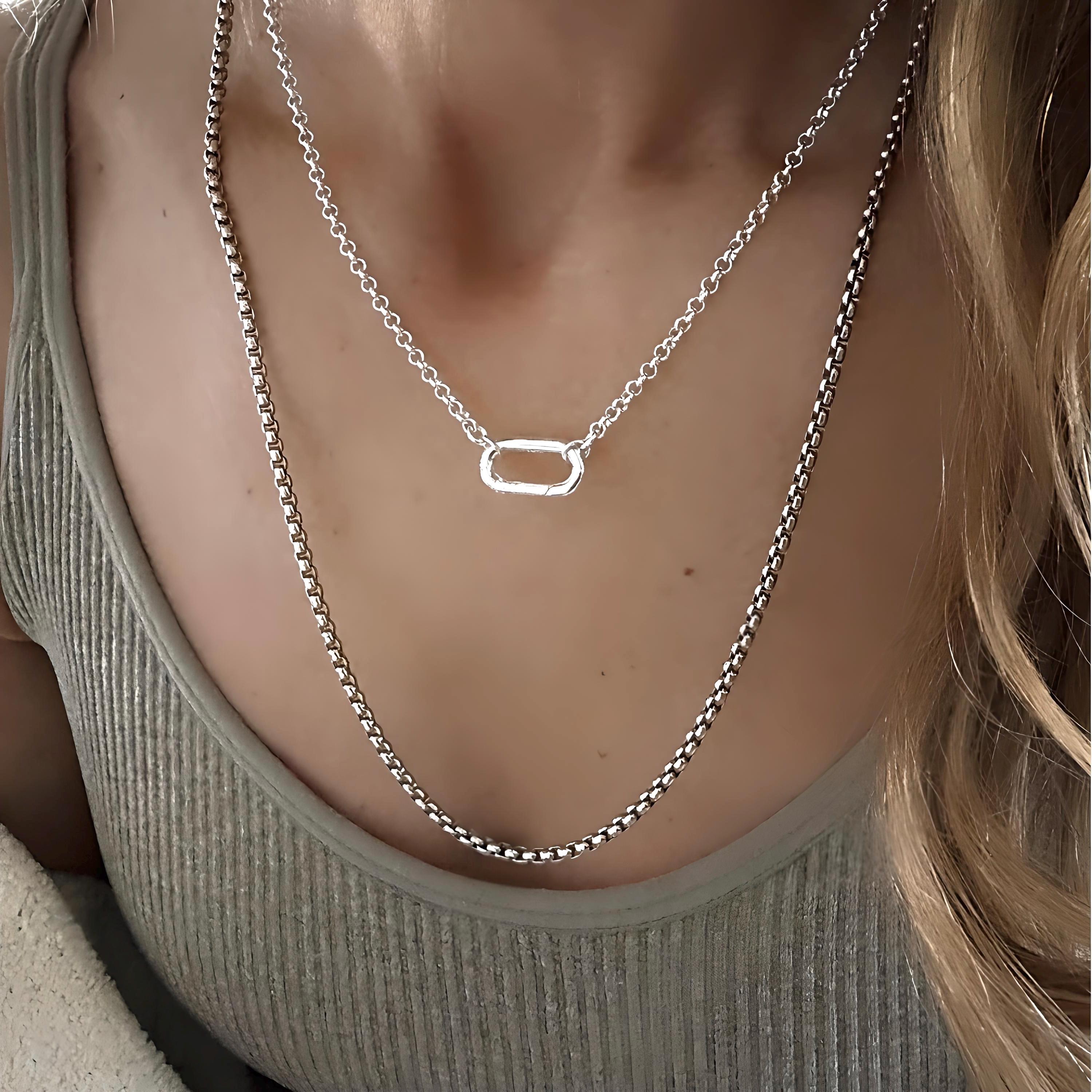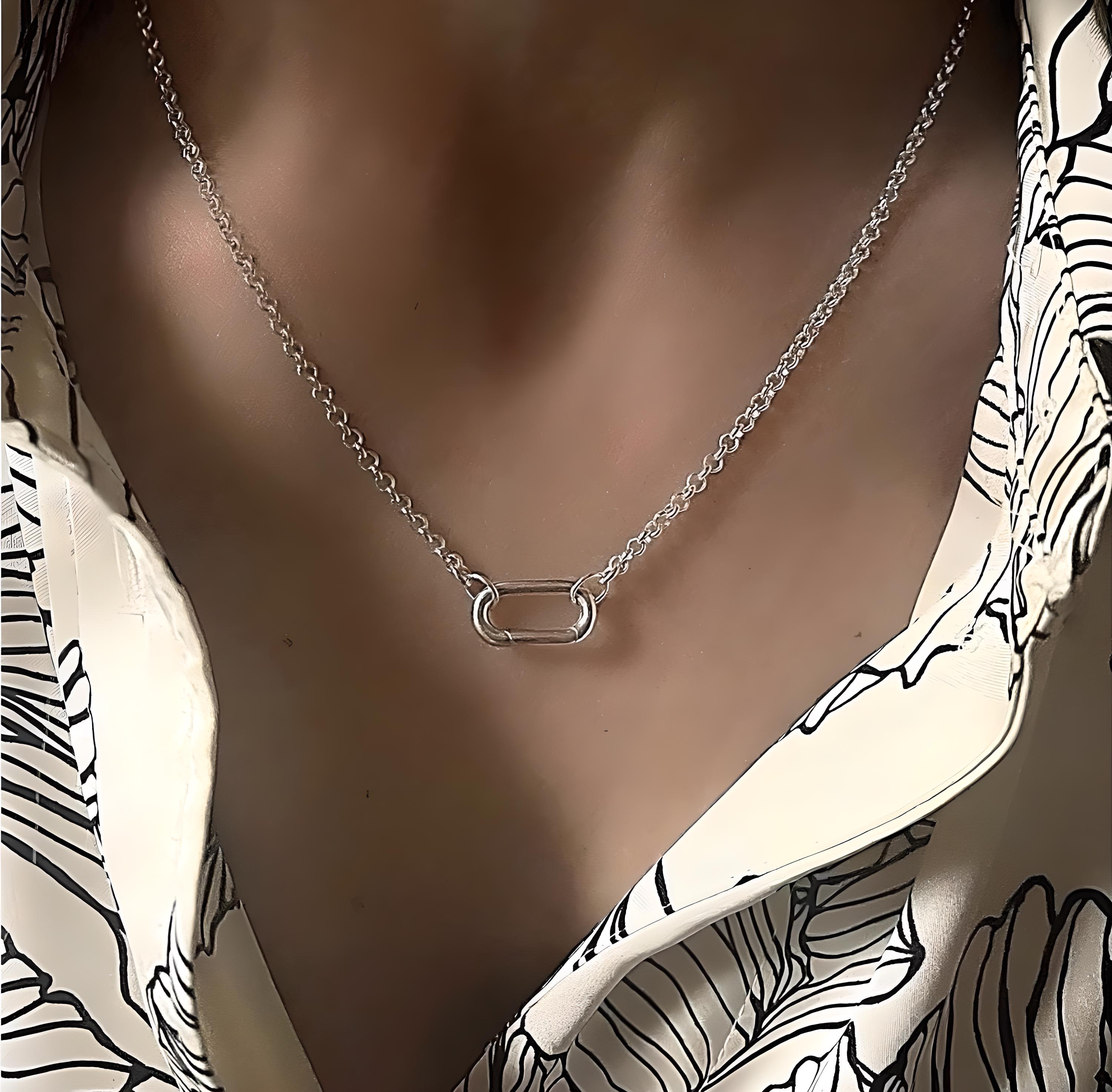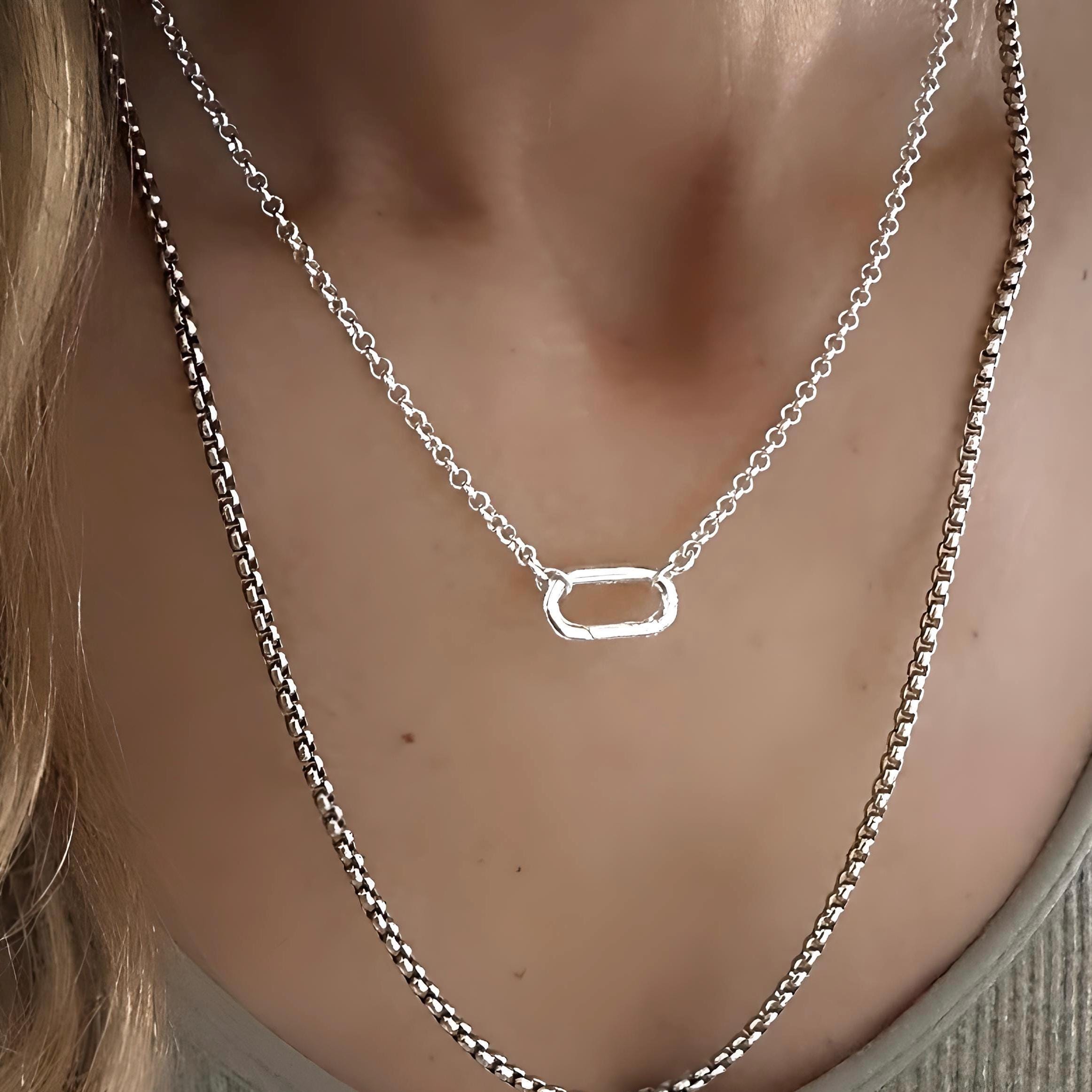A timeless rolo chain necklace with a modern twist, this piece features a front carabiner clasp designed for versatility.