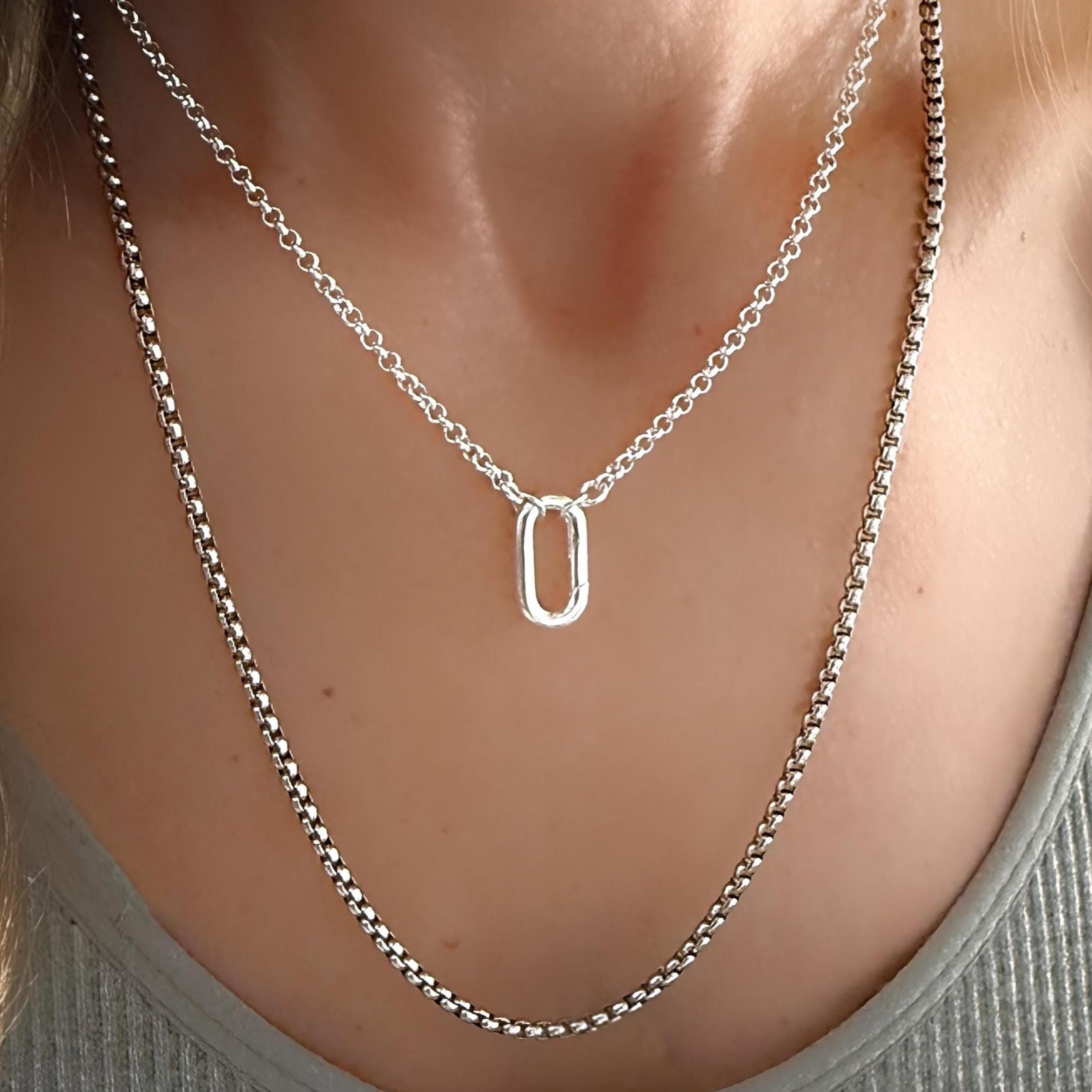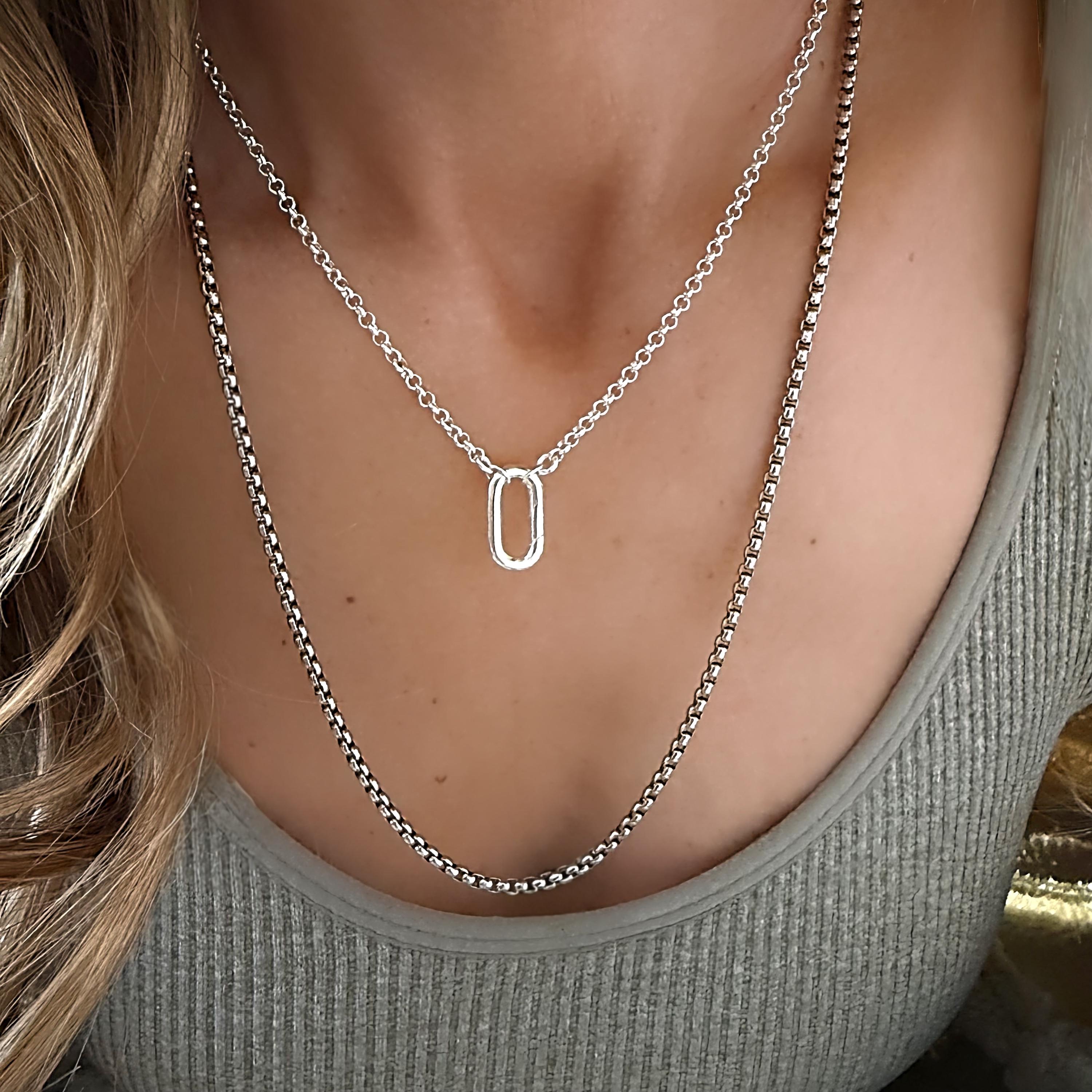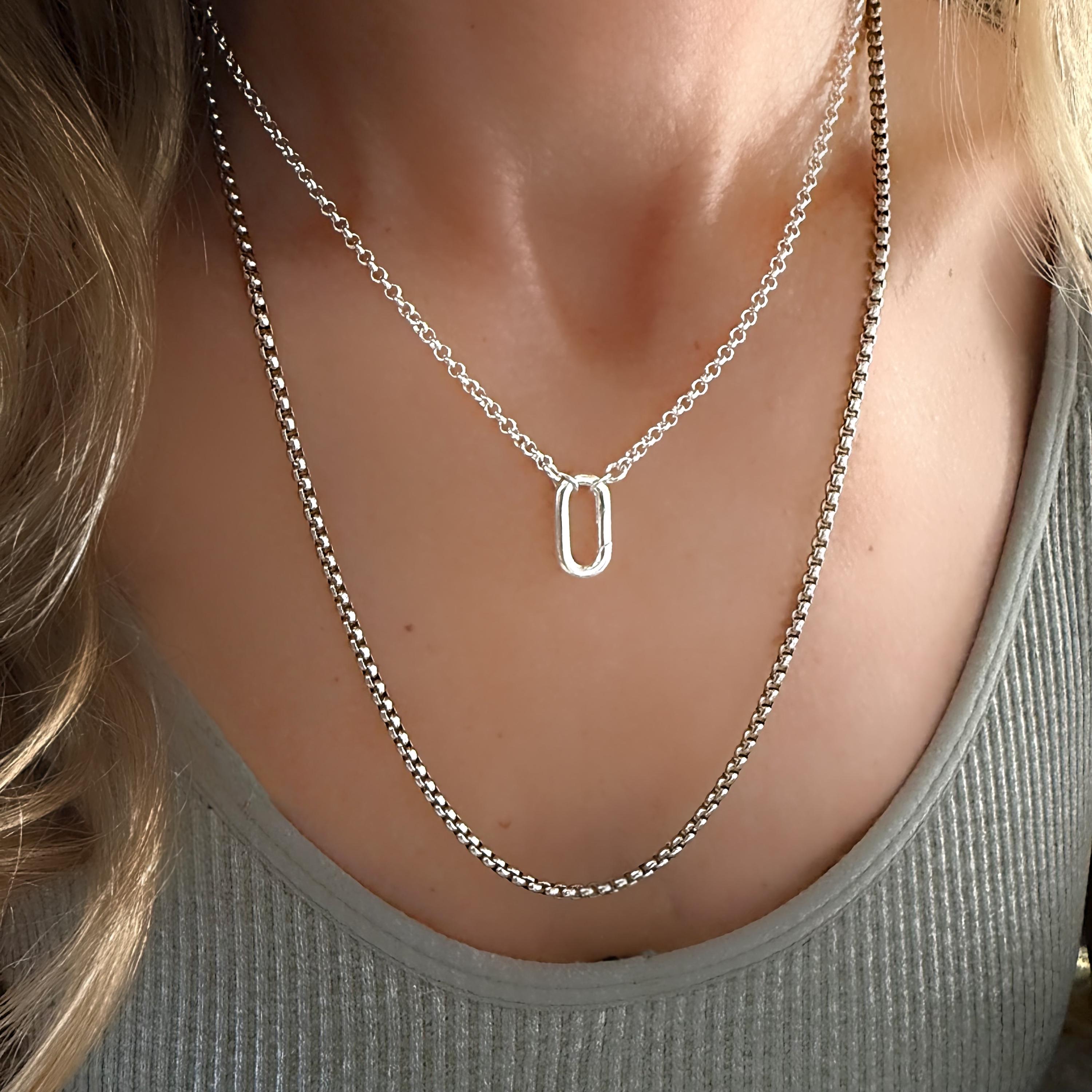 925 Sterling Silver Rolo Chain featuring a front carabiner clasp that opens inward allowing for pendants and charms to be added as you like.