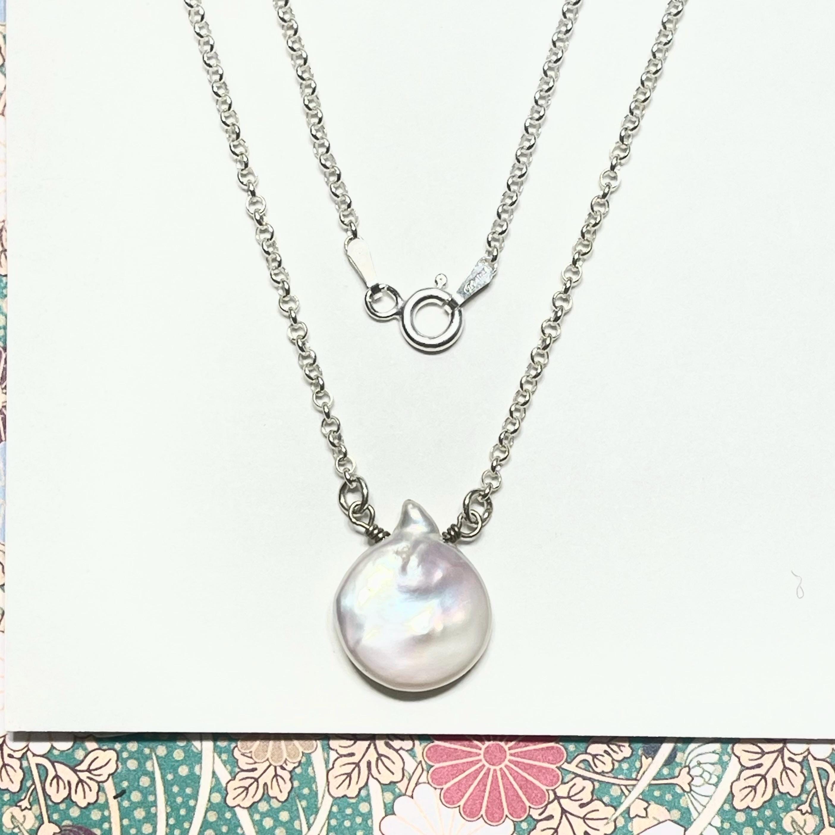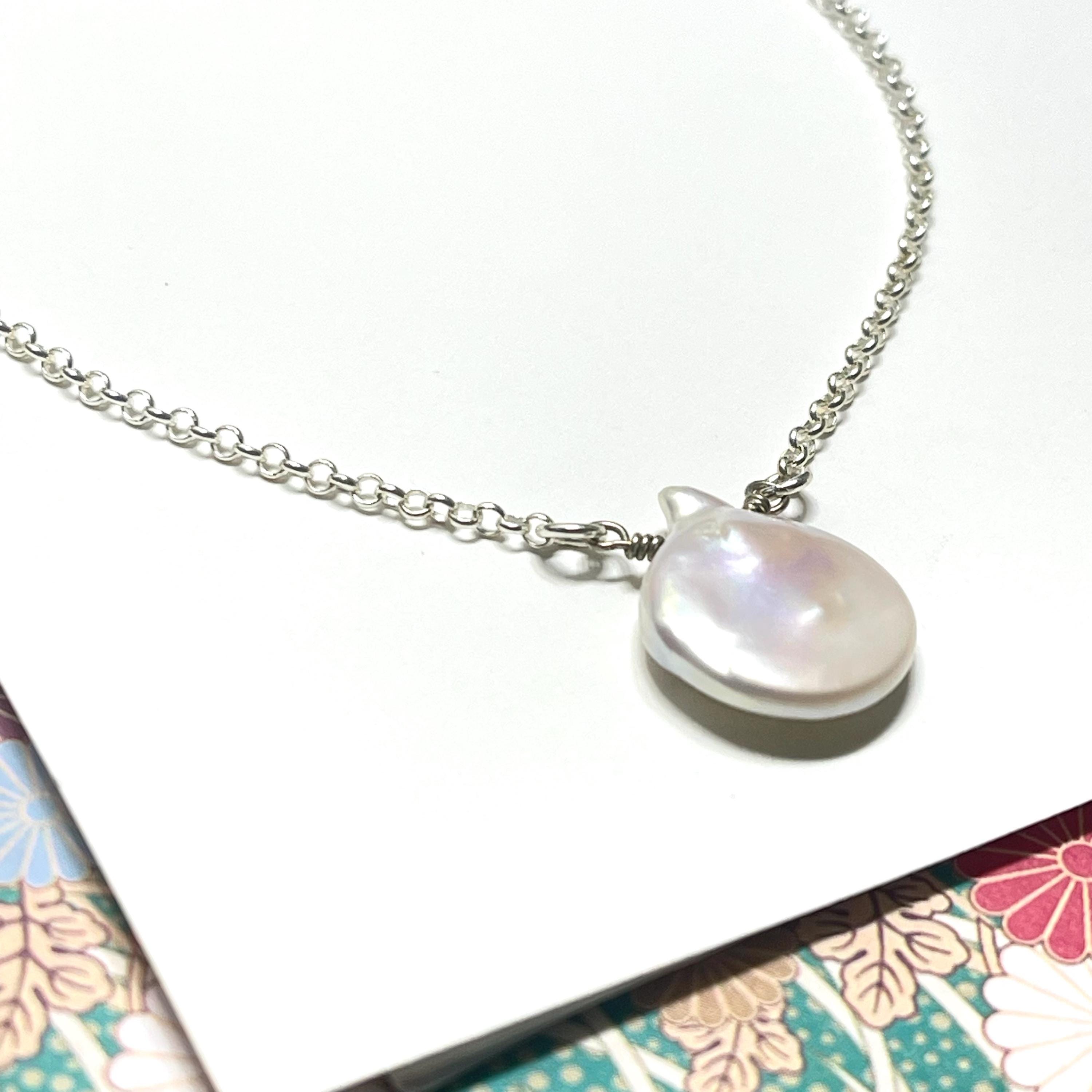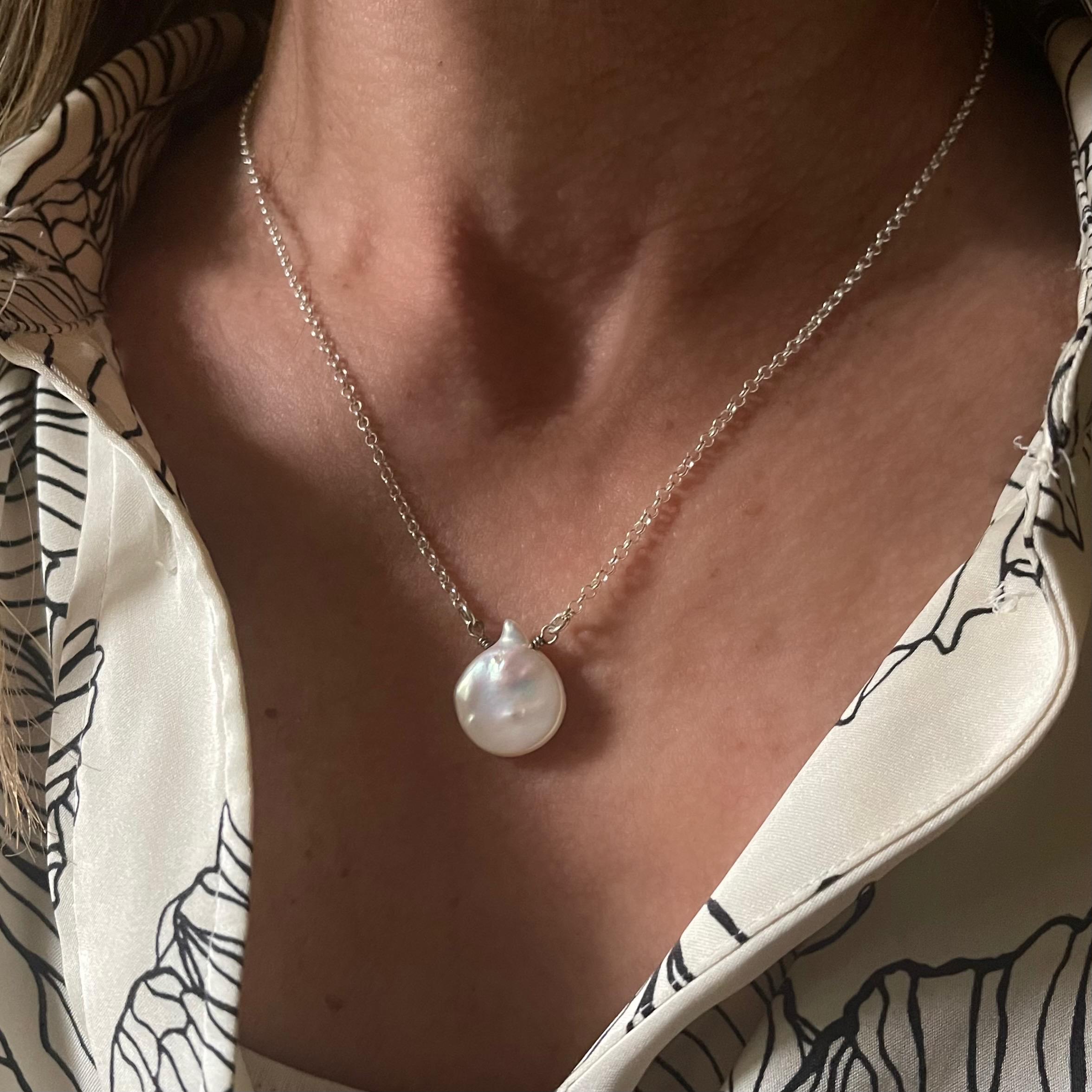 925 Silver Rolo Chain Necklace featuring a centred baroque coin pearl pendant.