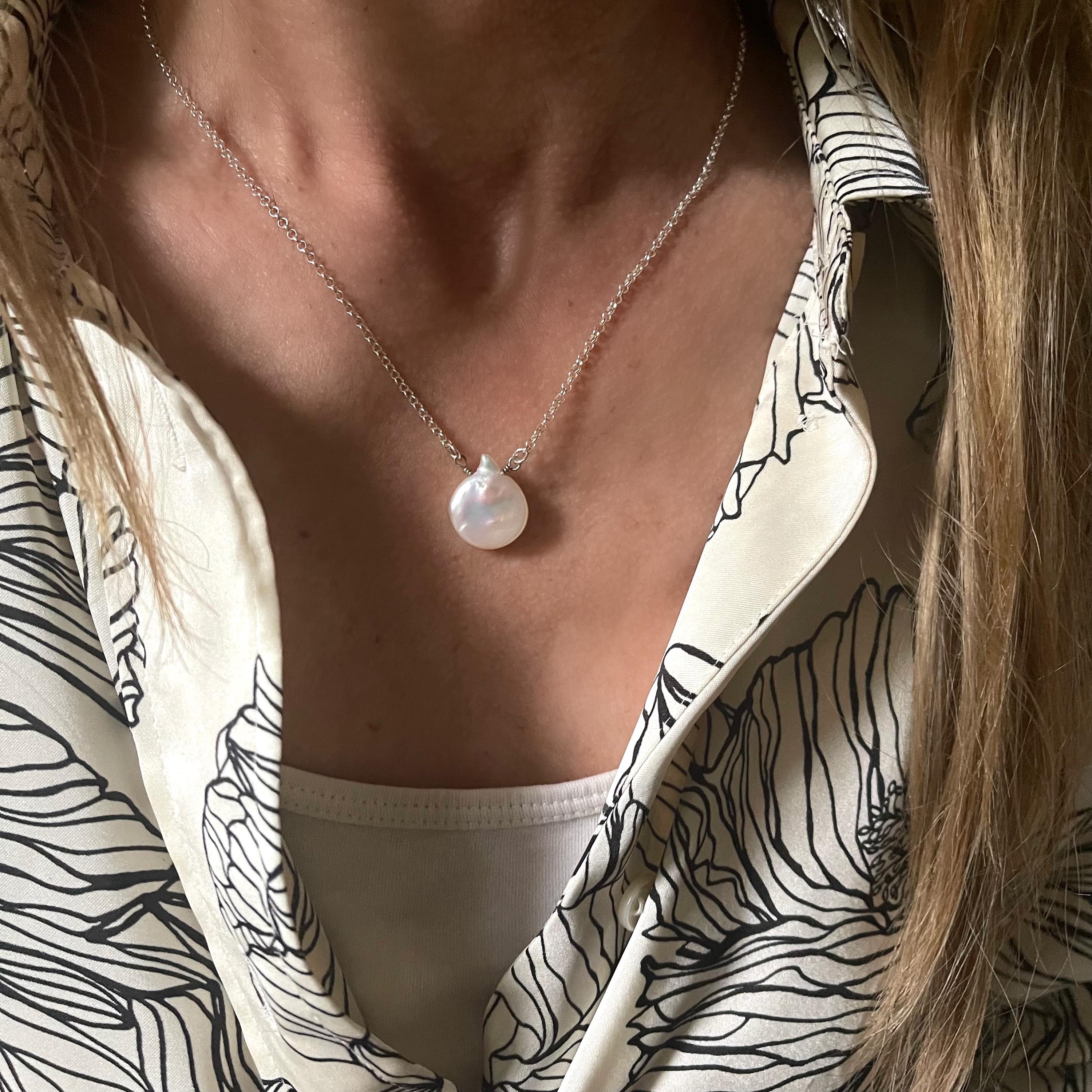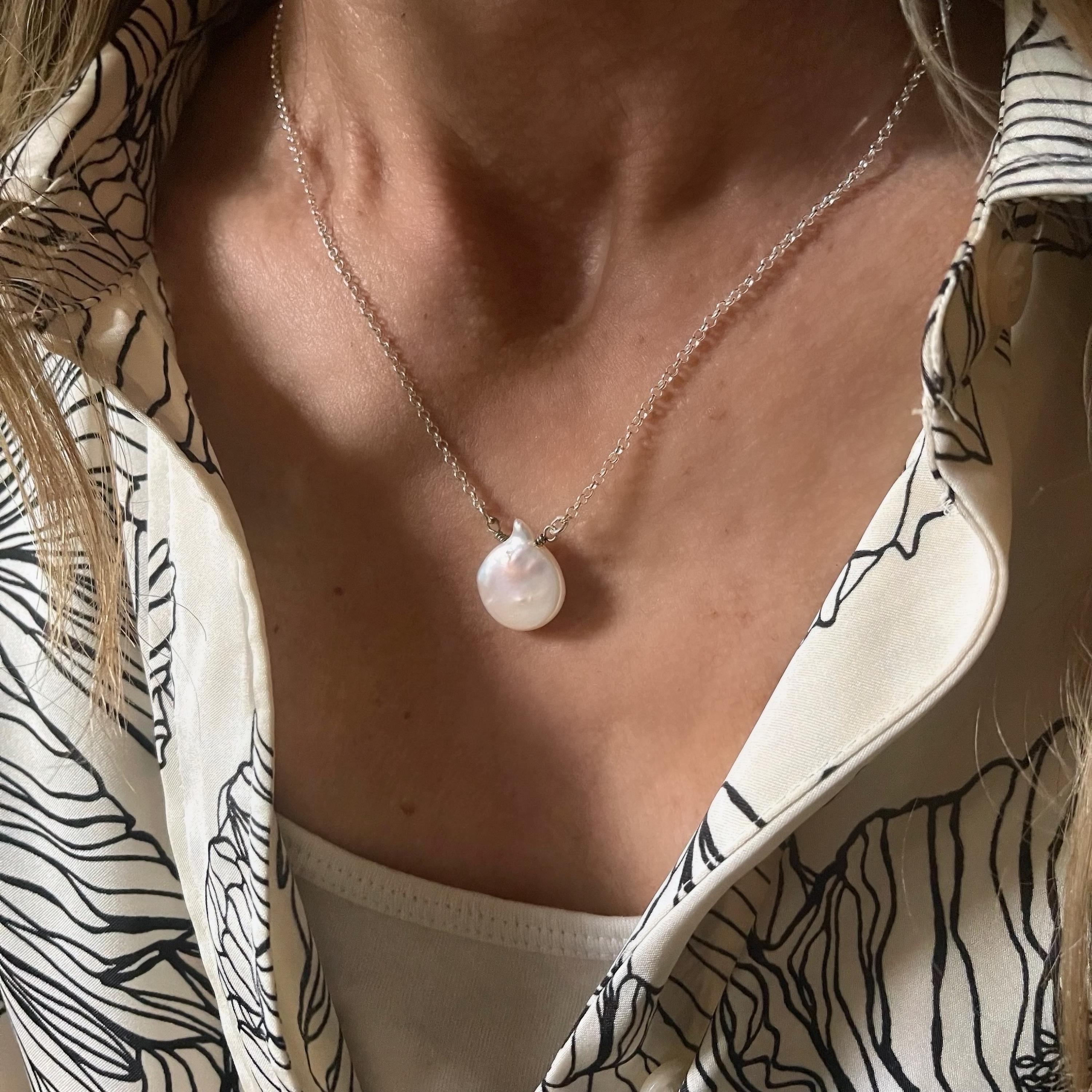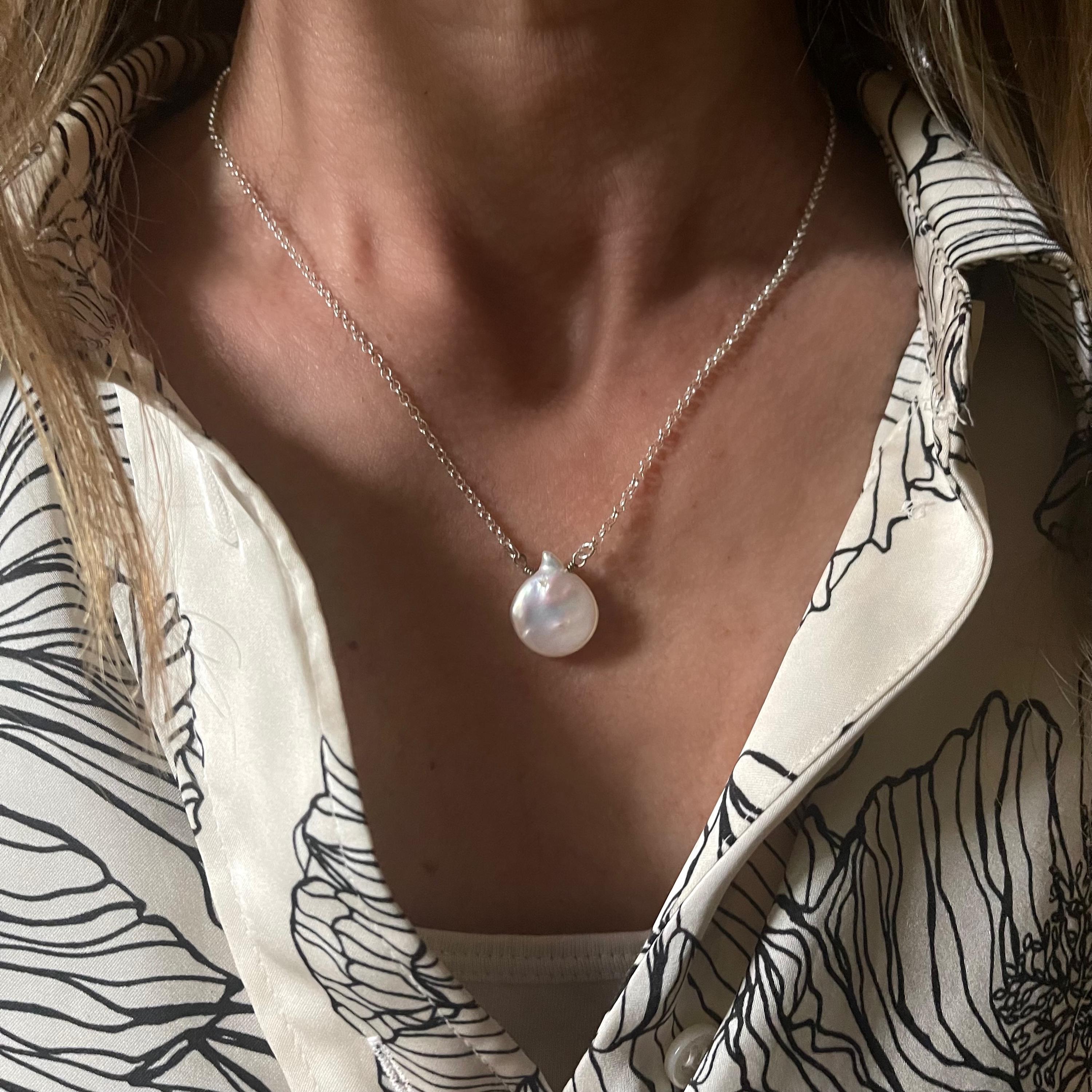 925 Silver Rolo Chain Necklace featuring a centred baroque coin pearl pendant.