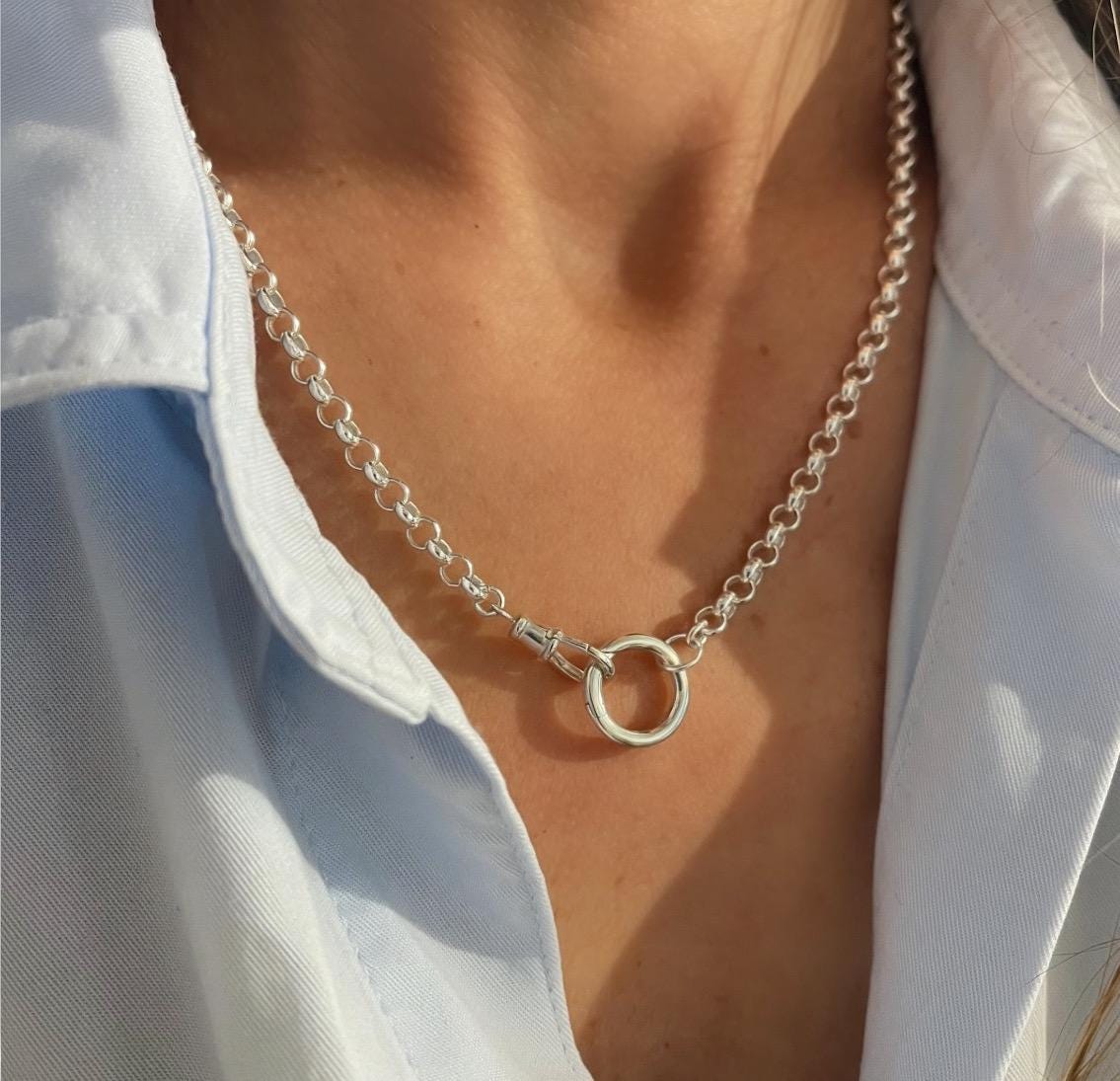Two front clasps are the focal point of this classic rolo chain necklace.