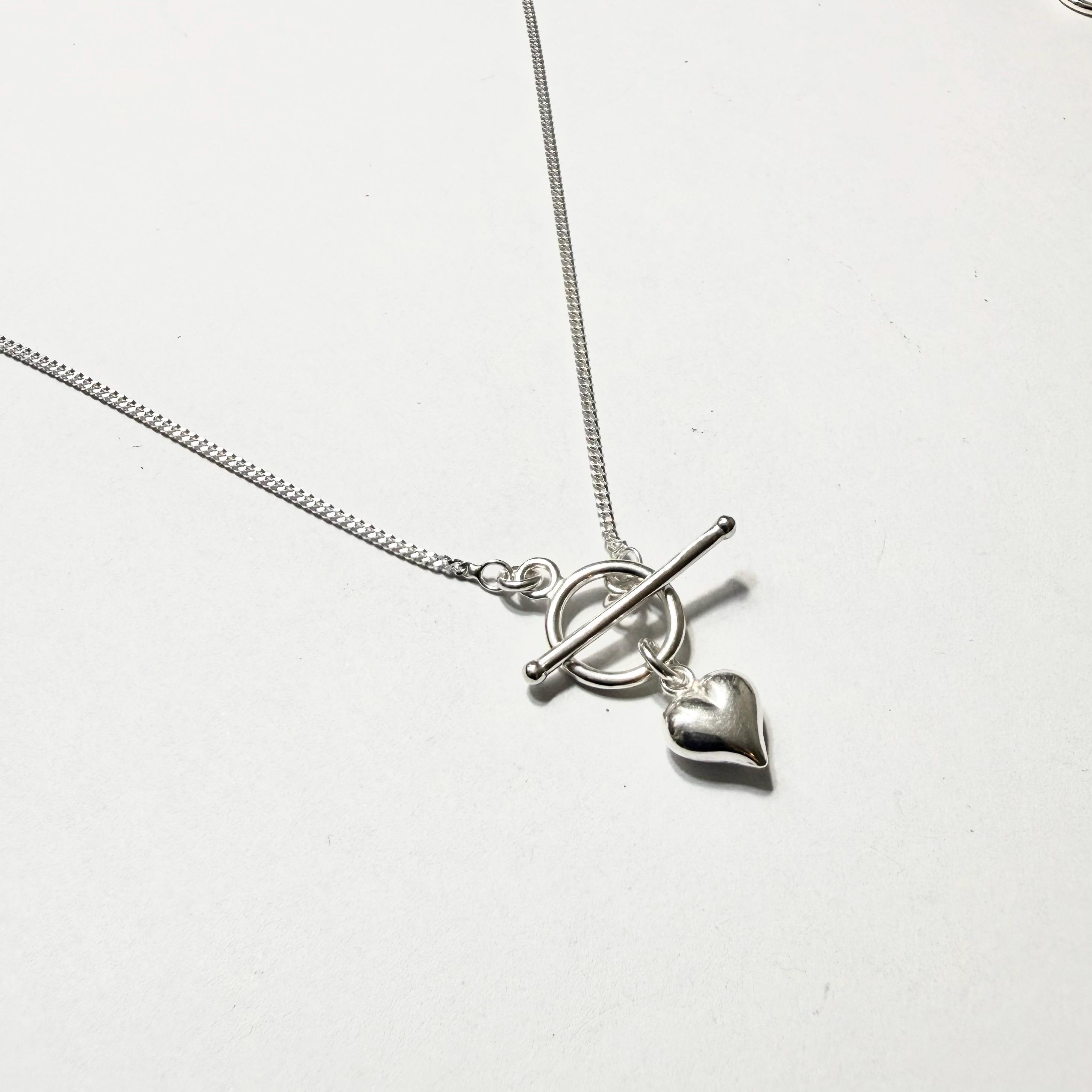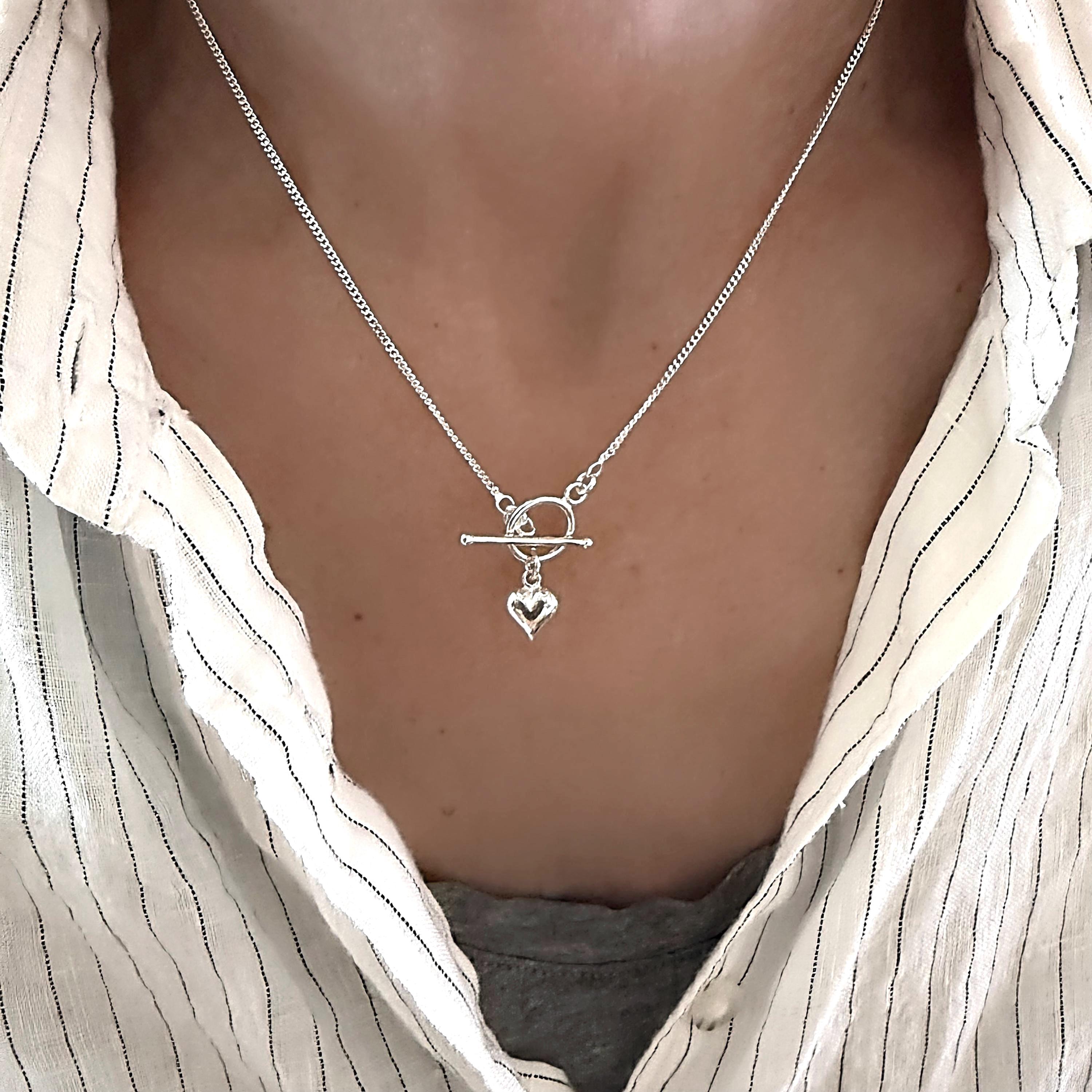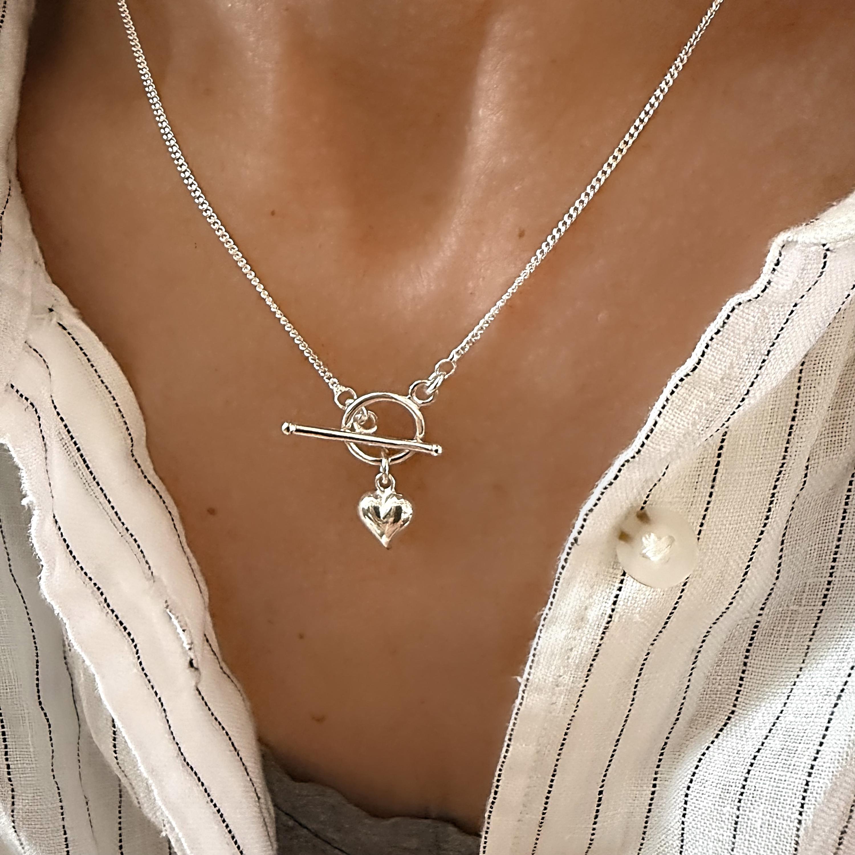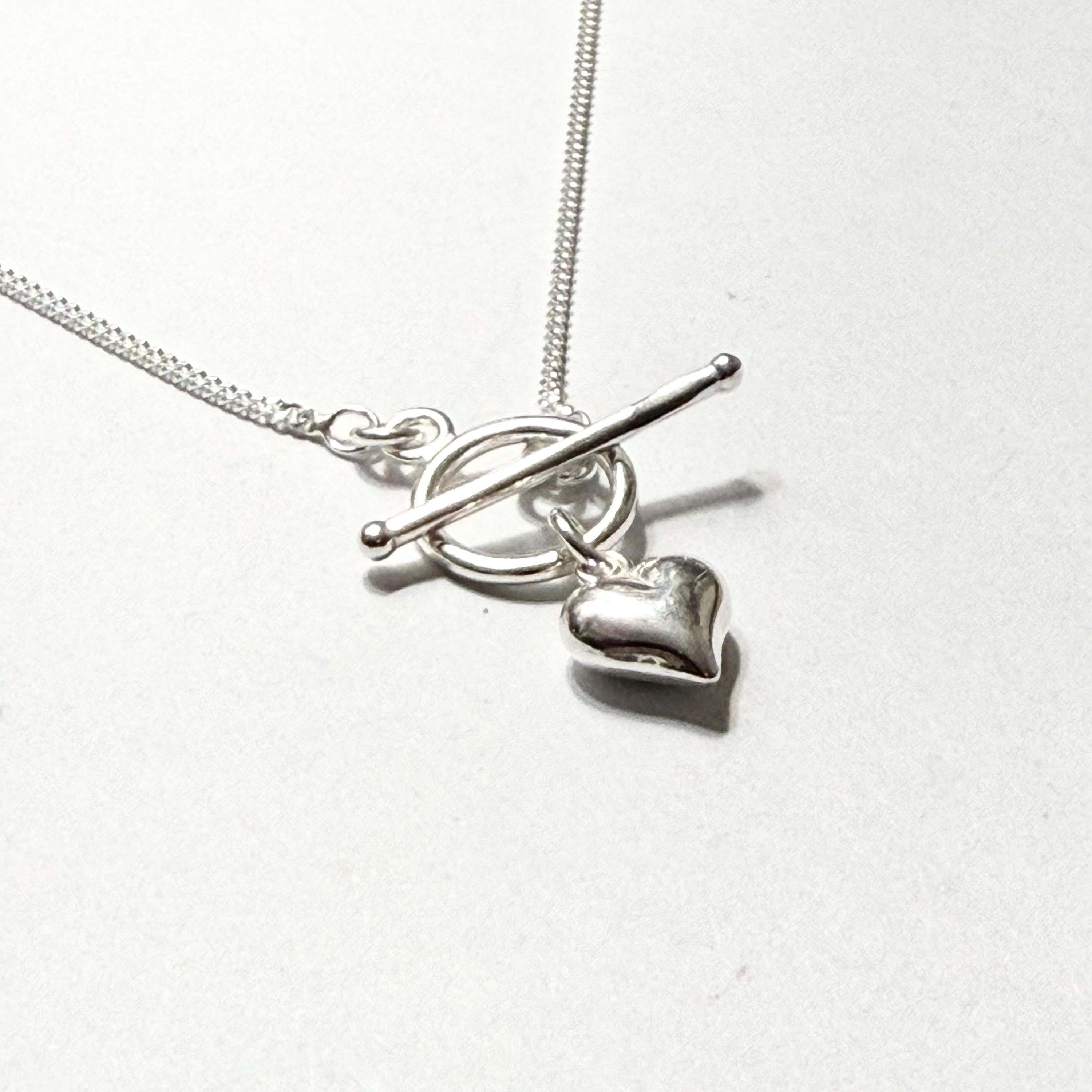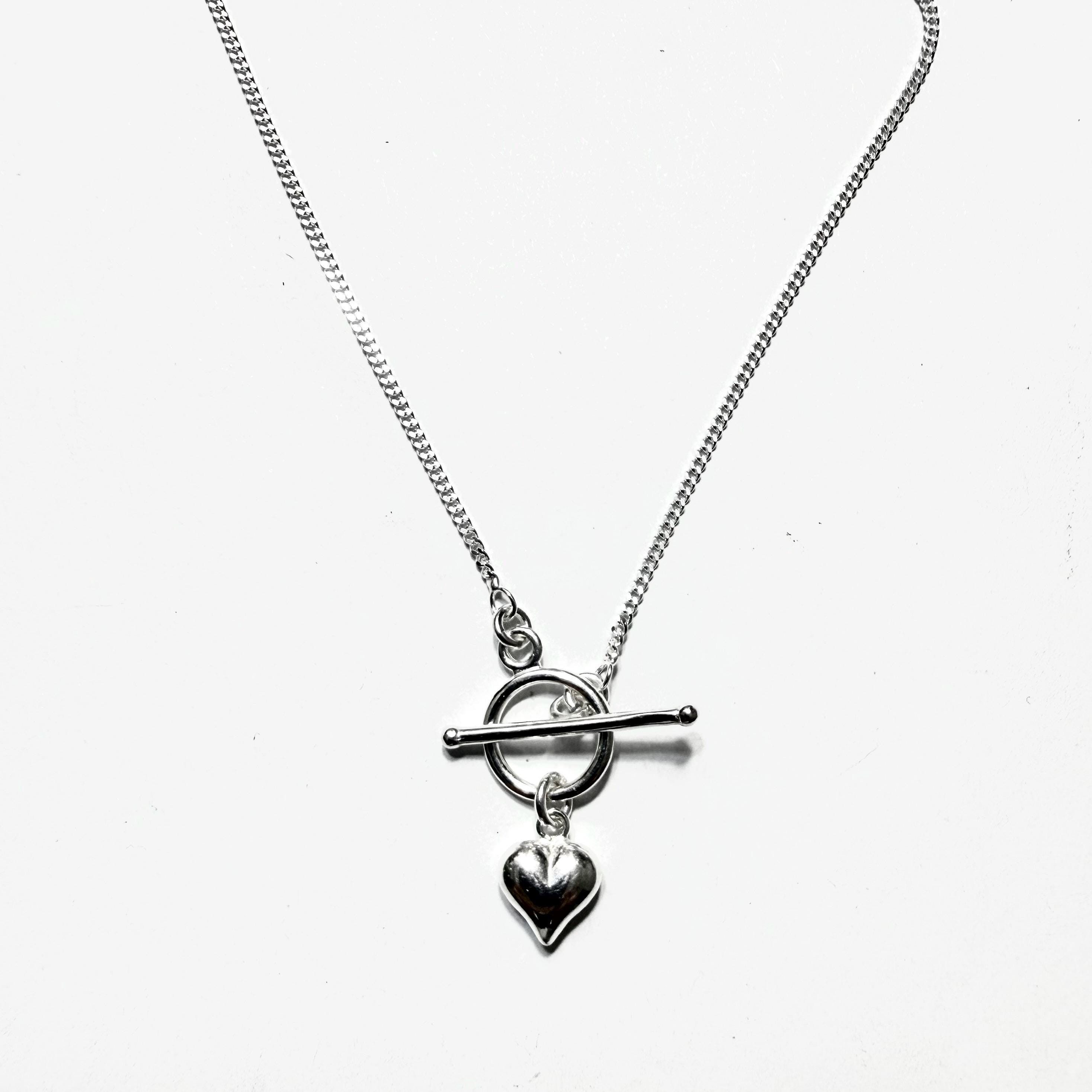 Dainty Sterling Toggle Necklace with a small puffed heart pendant.