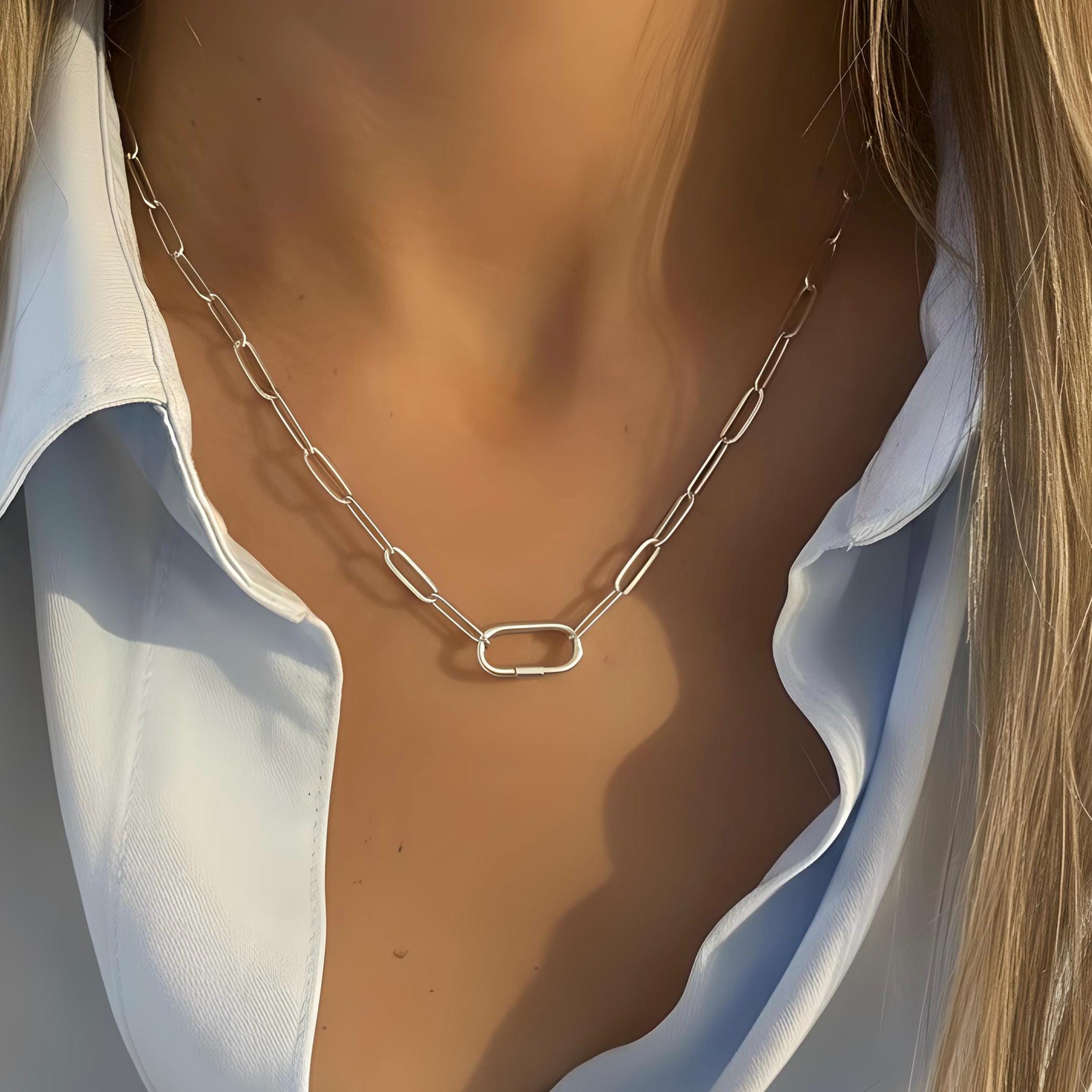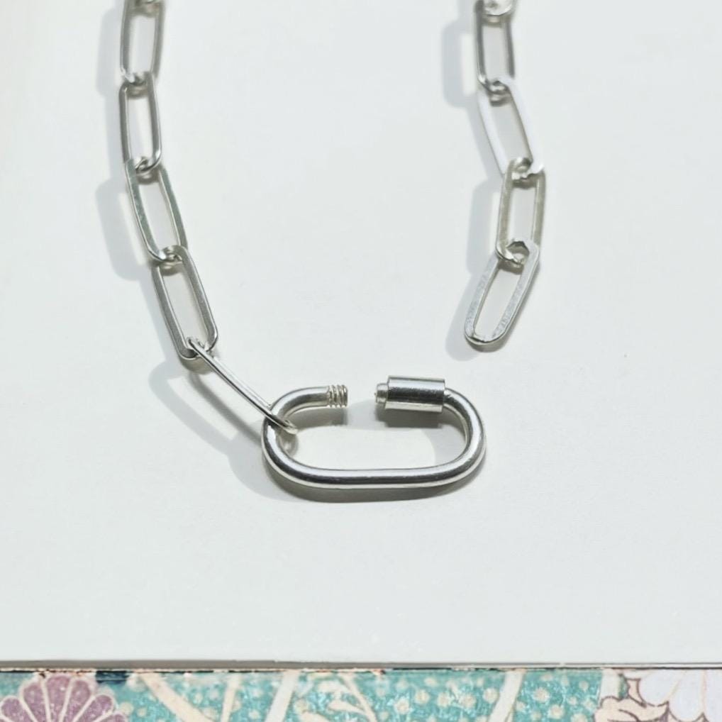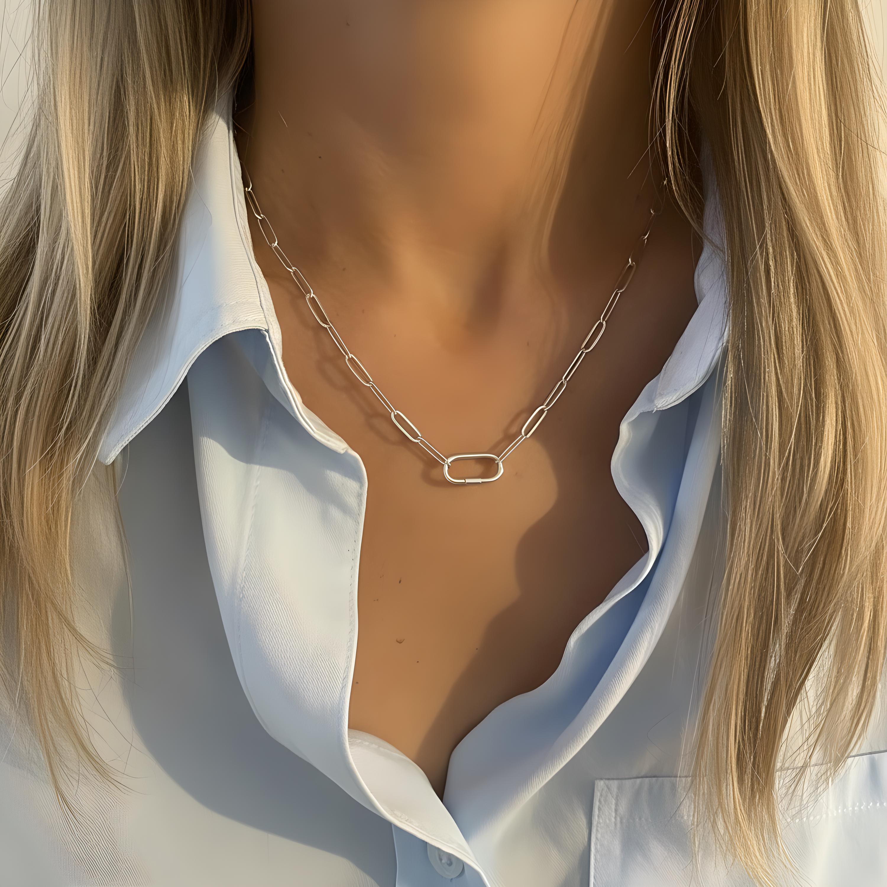 A dainty paperclip chain features an oval charm clasp at the front.