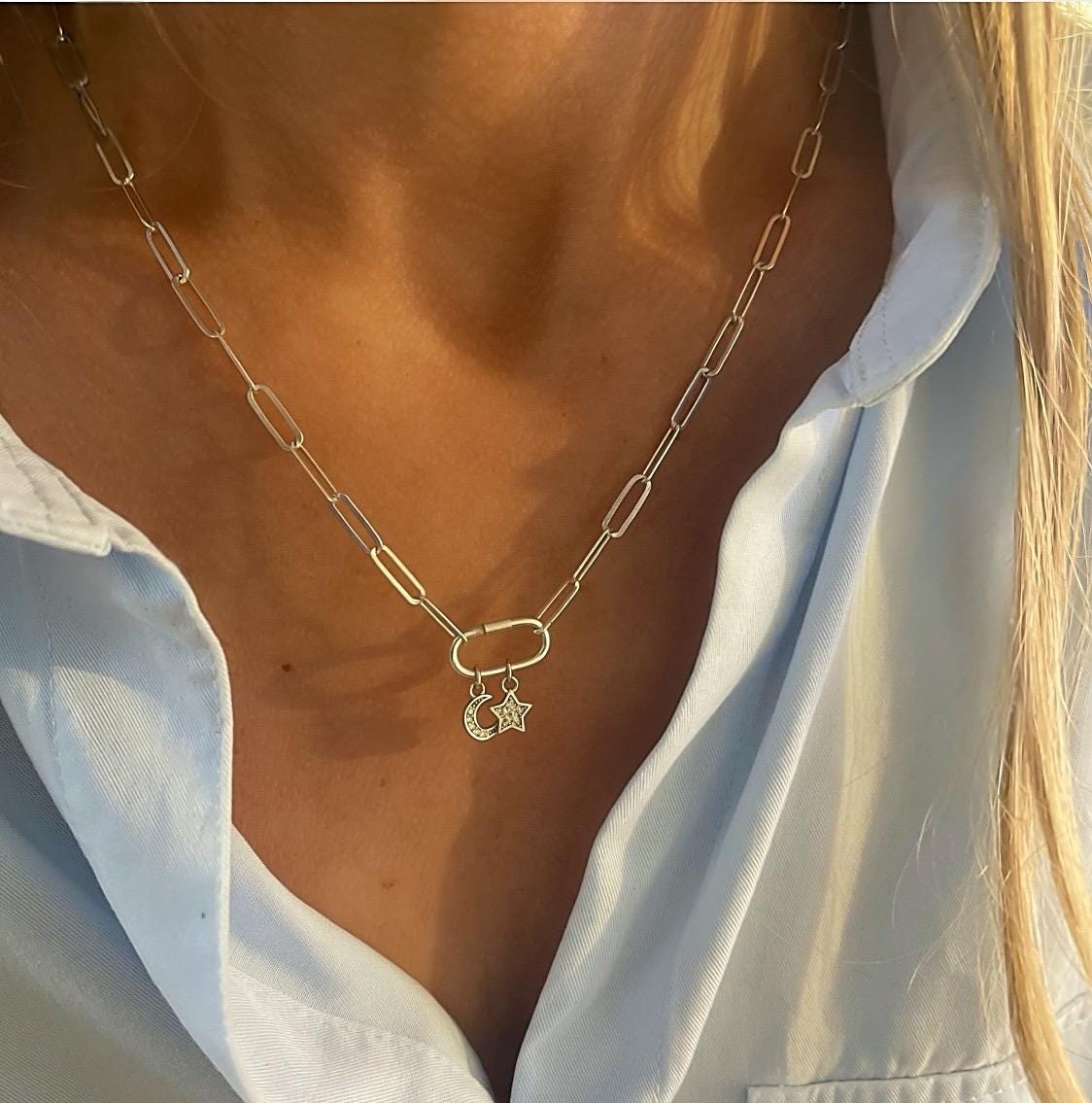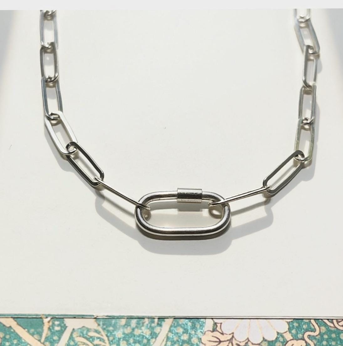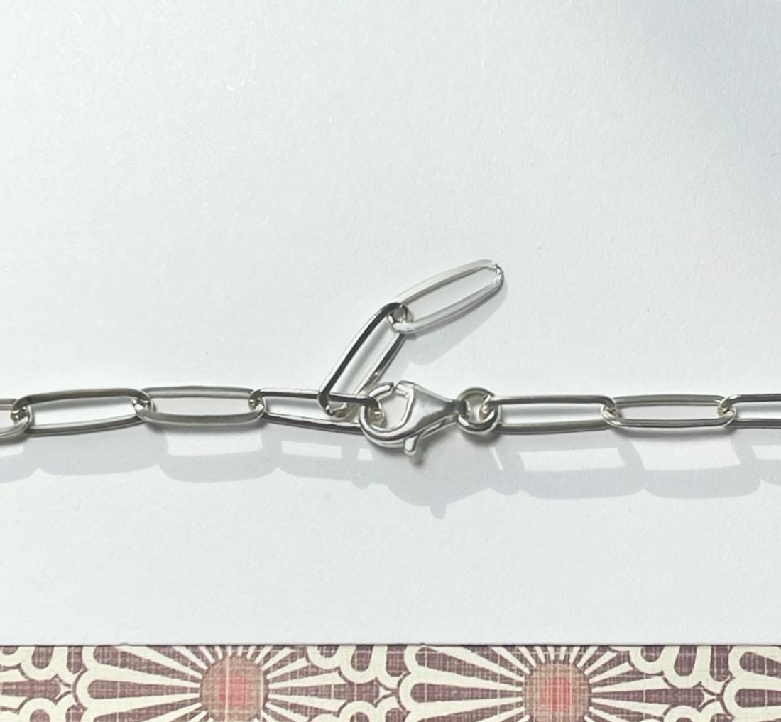 A dainty paperclip chain features an oval charm clasp at the front.