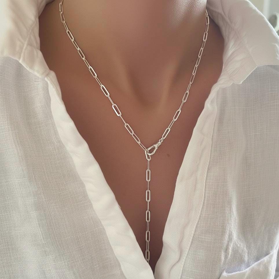 The clasp attaches anywhere along the paperclip chain allowing for a lariat style.