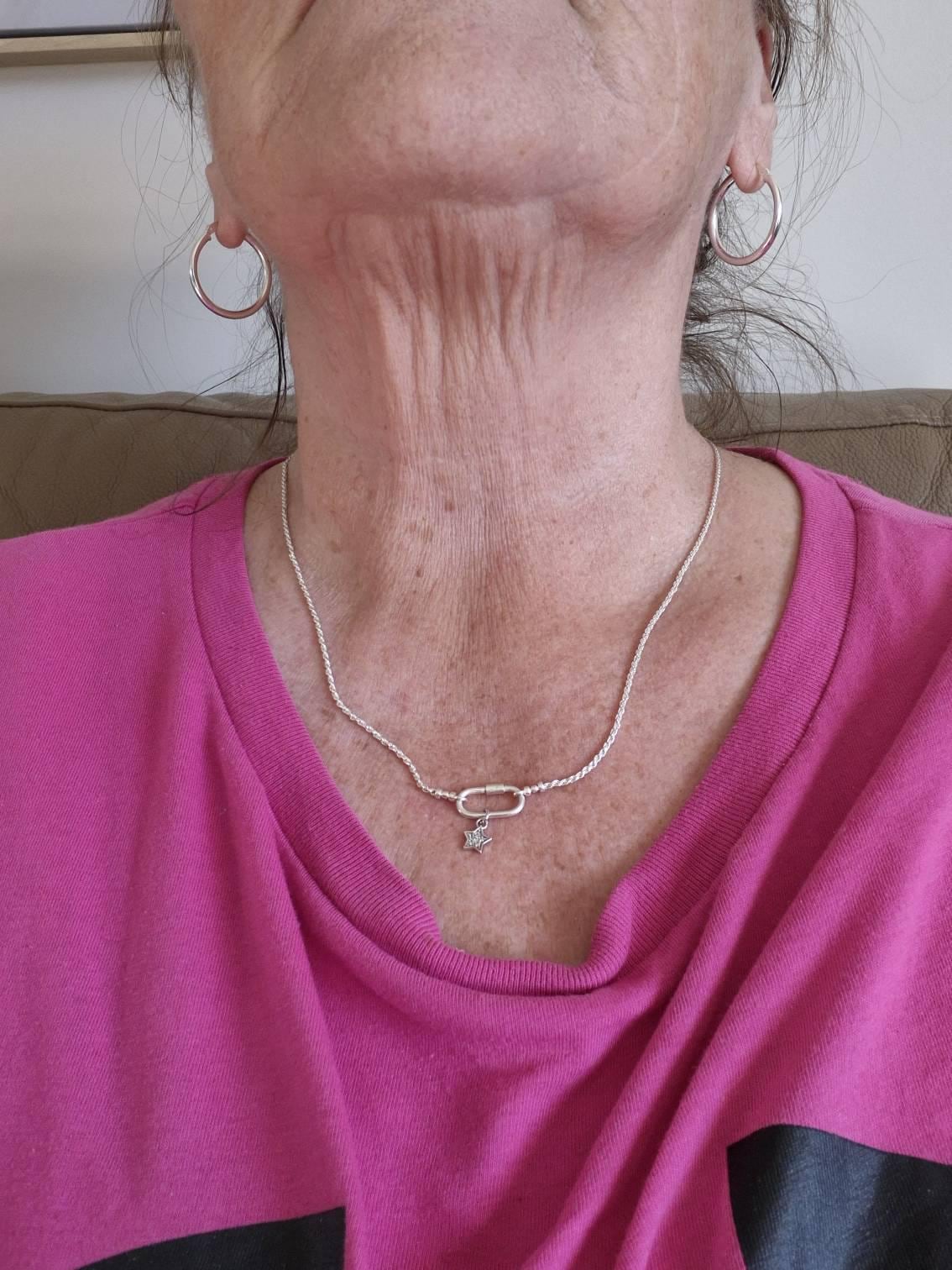 This diamond cut rope chain features a front carabiner screw clasp to add your own charms.