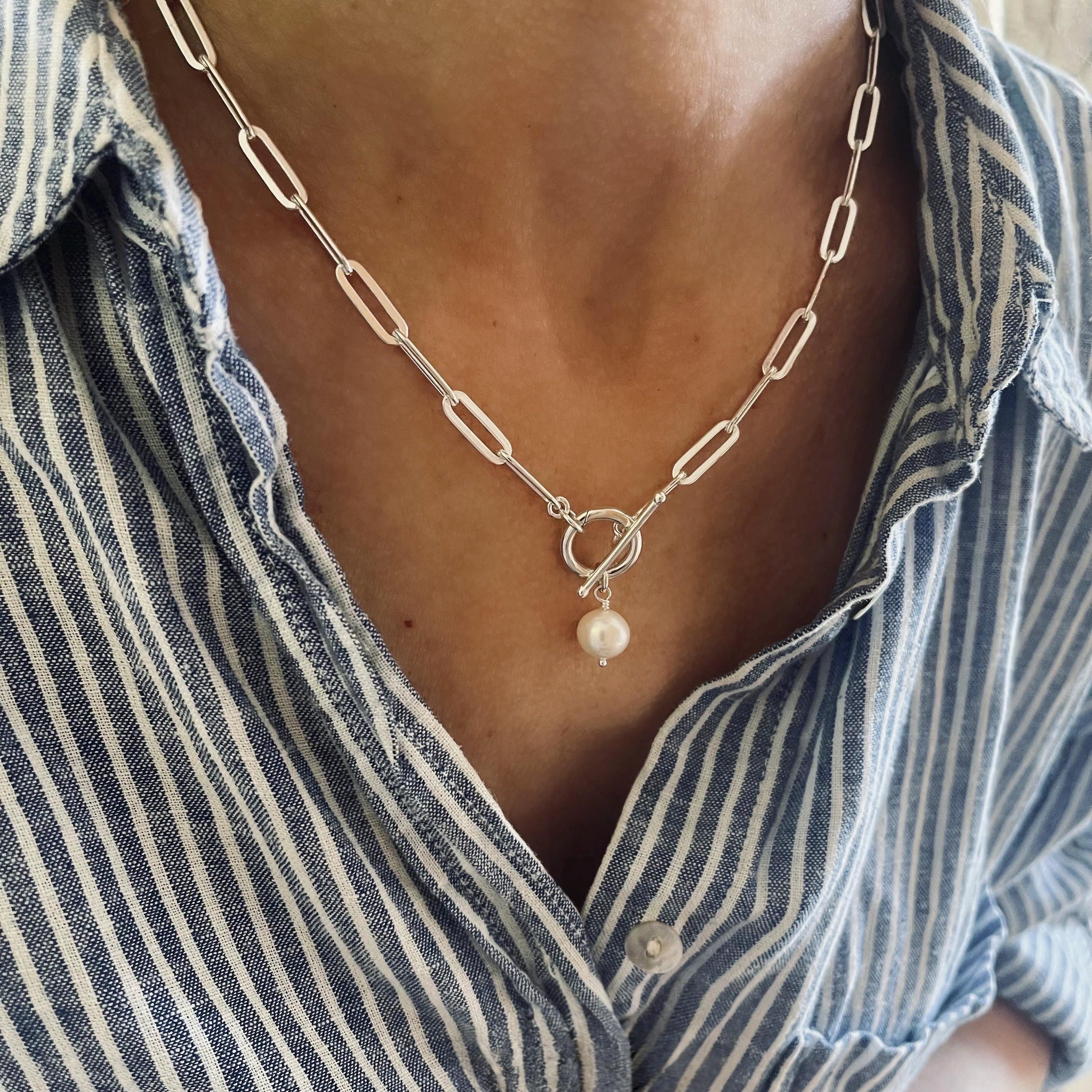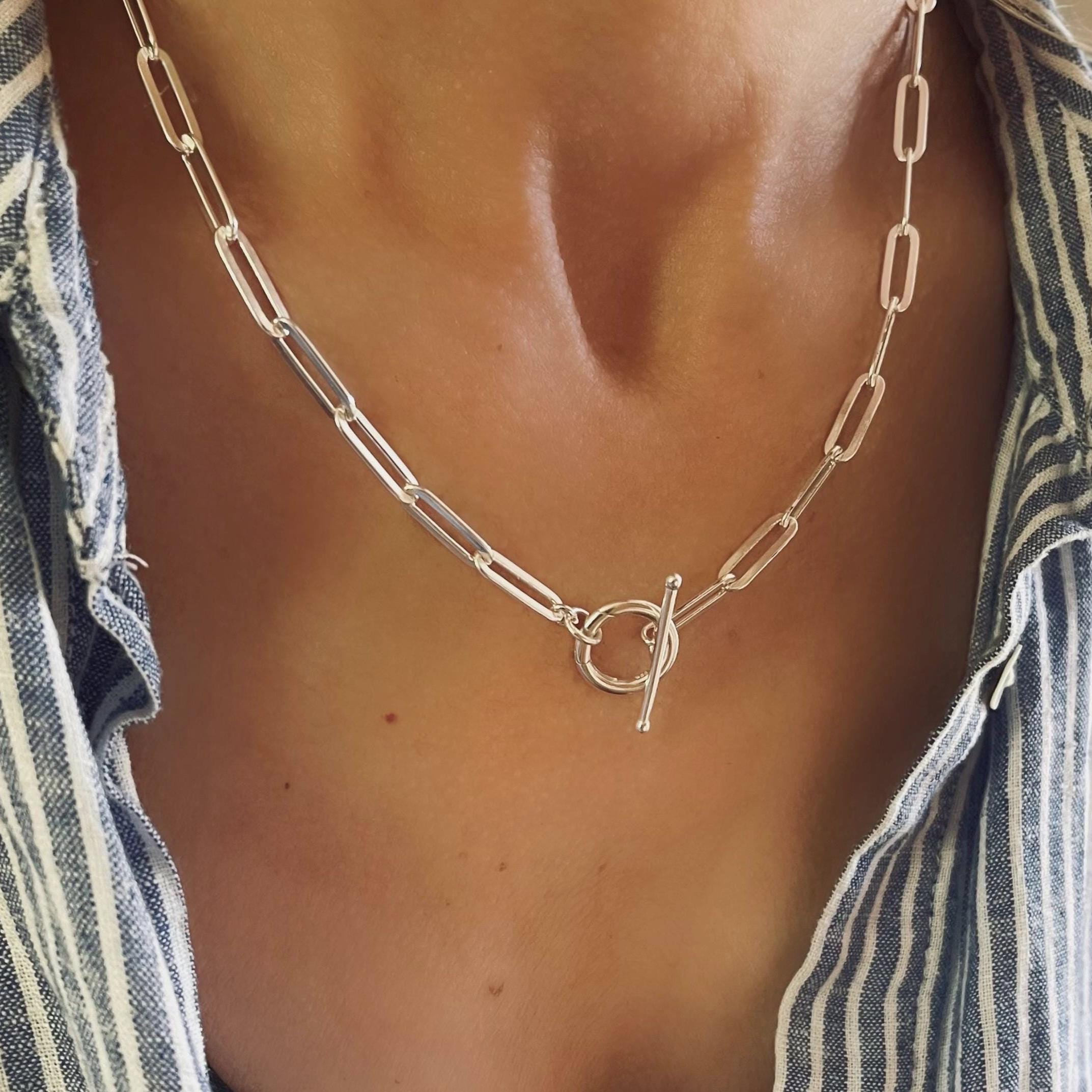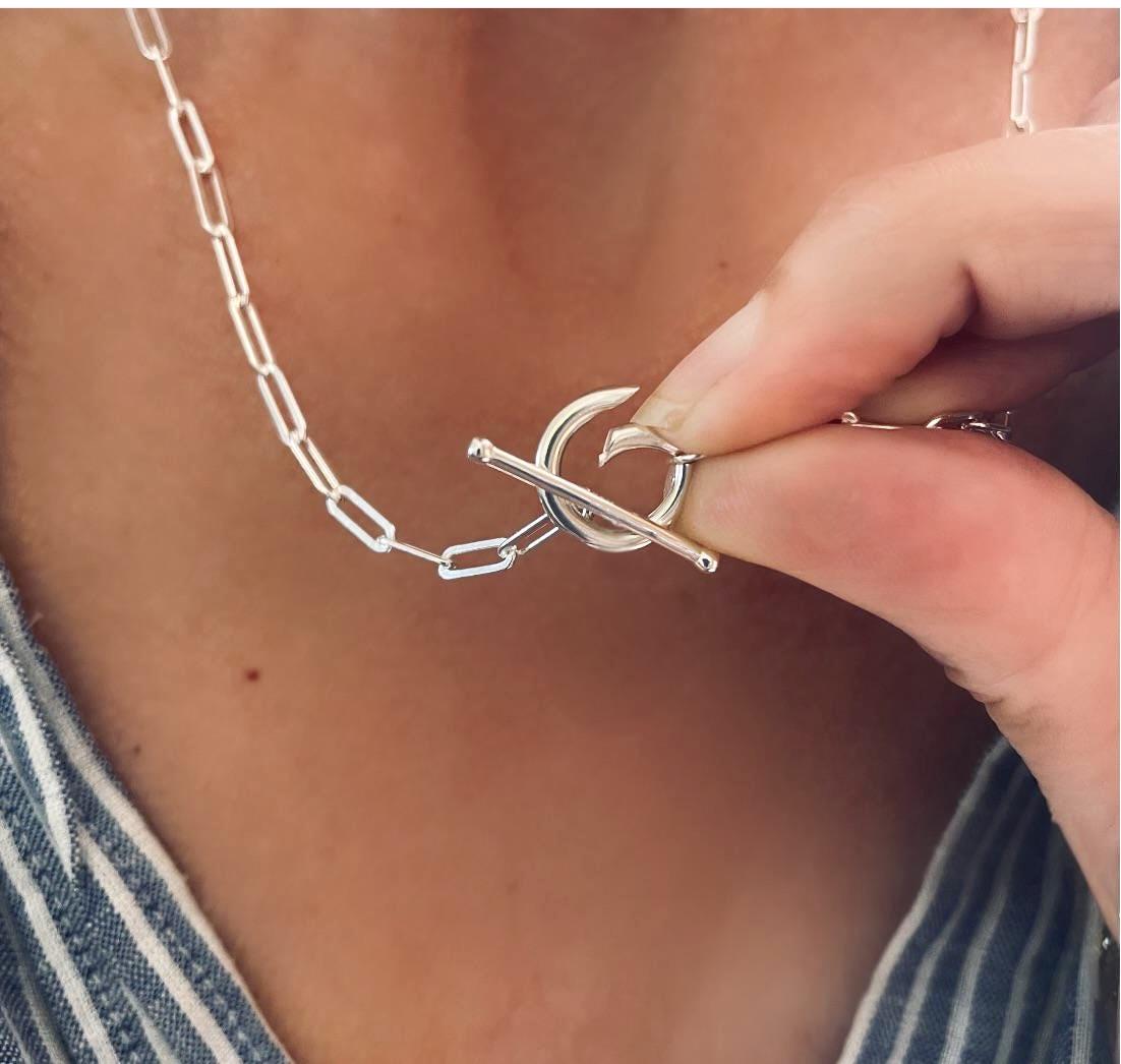 A sterling silver toggle necklace with unique combination of charm clasp and toggle make this paperclip chain a versatile piece - wear with or with or without charms .