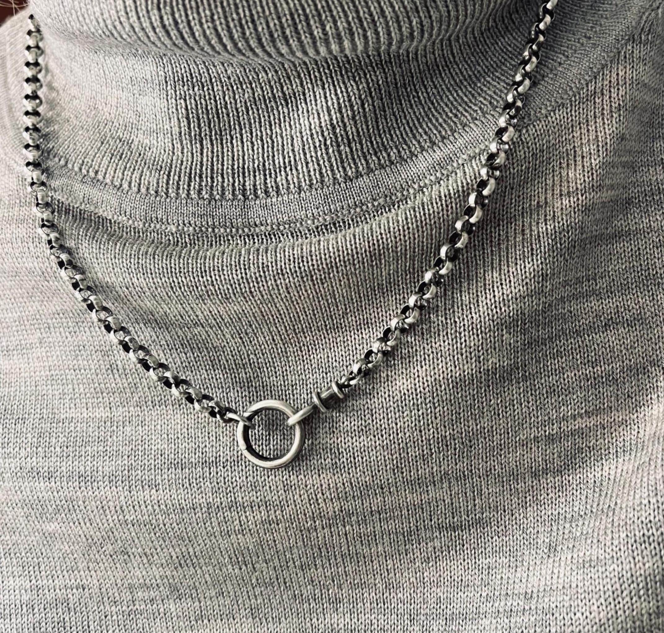 An antiqued solid 925 sterling silver Rolo chain and finished with double swivel clasps for versatile styling.