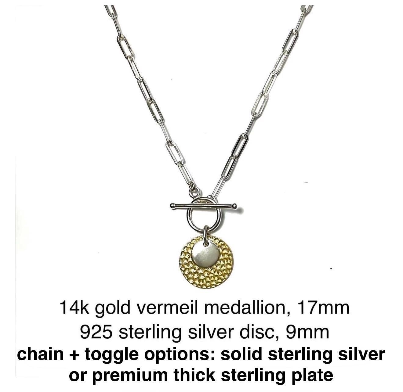 The pendant is a small sterling silver disc layered over a larger gold vermeil disc.