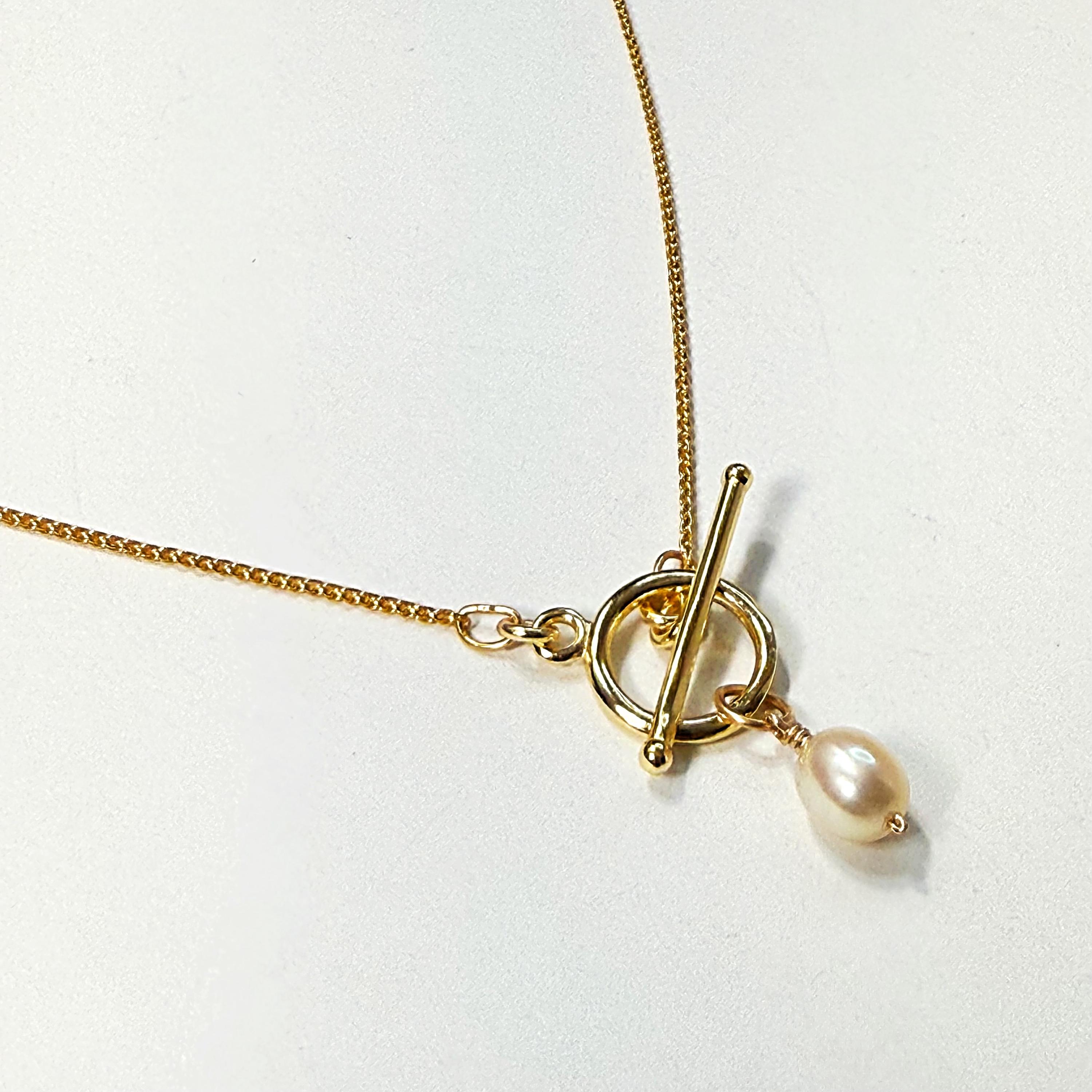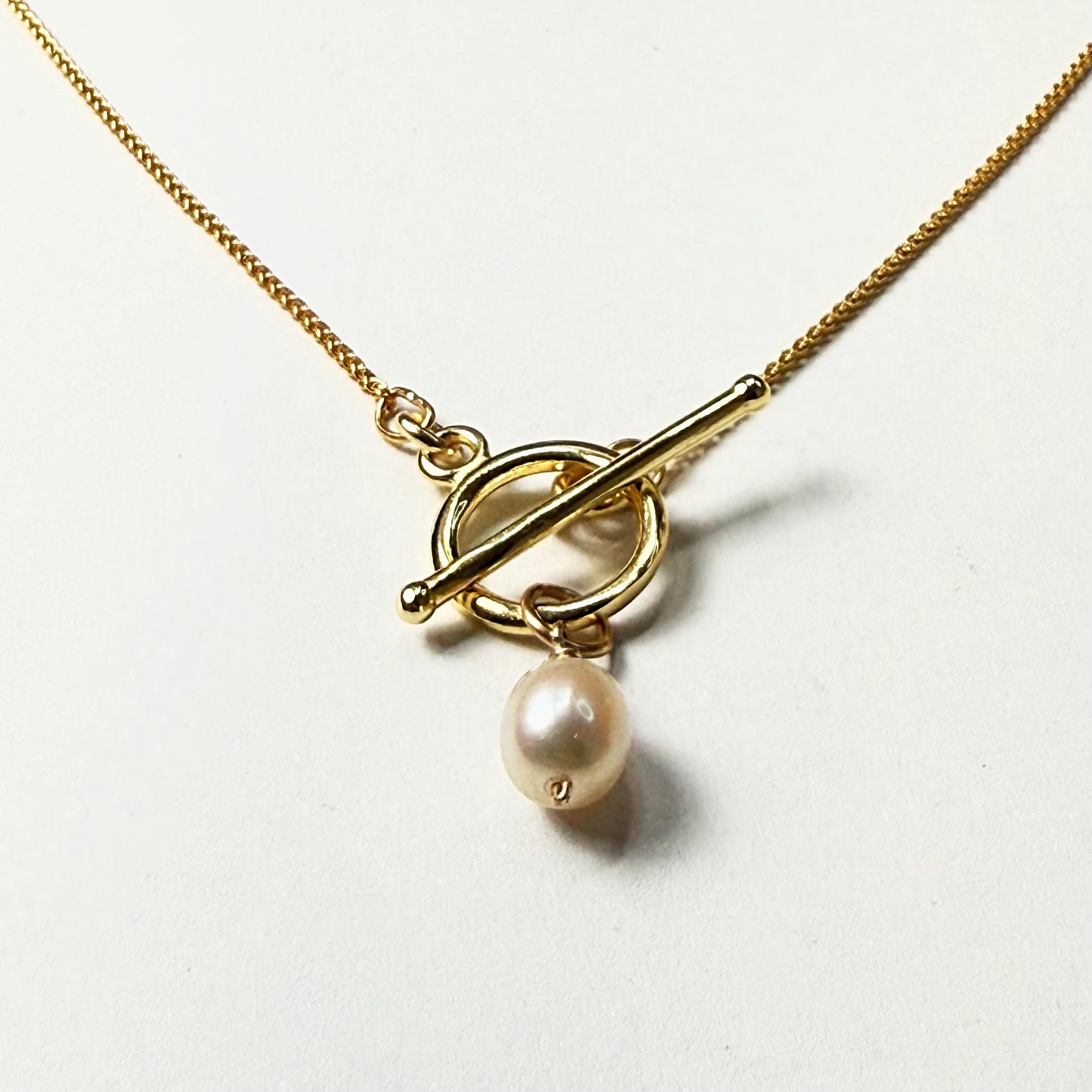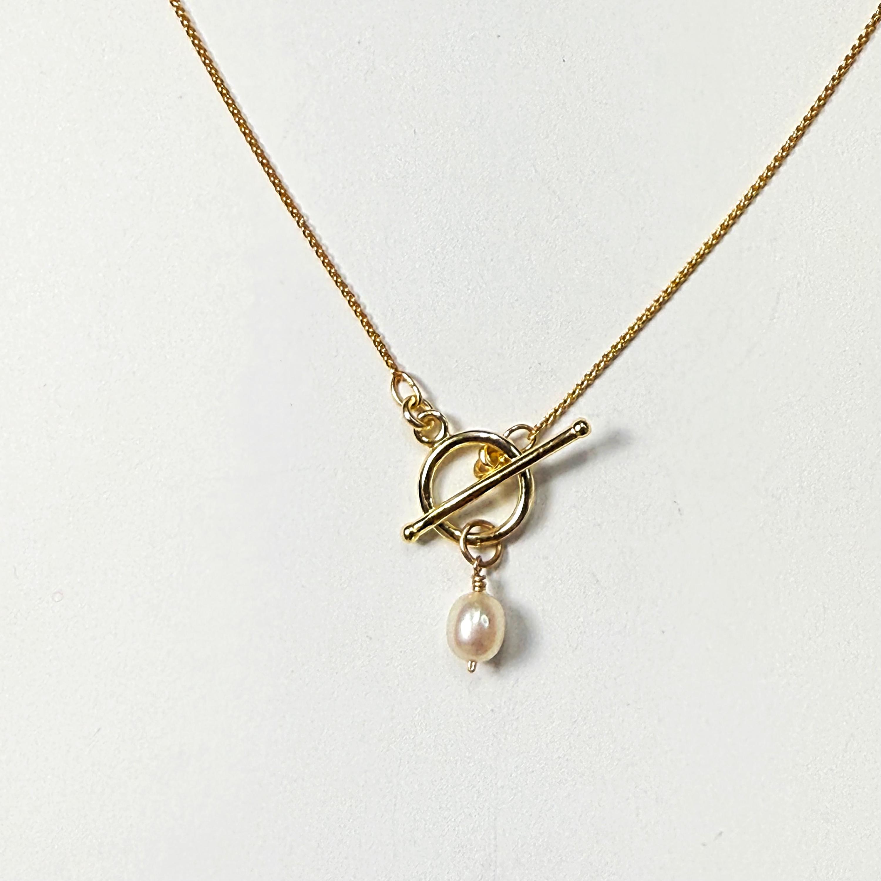 A dainty 14k gold-filled “wheat” chain necklace featuring a toggle clasp and pearl charm.