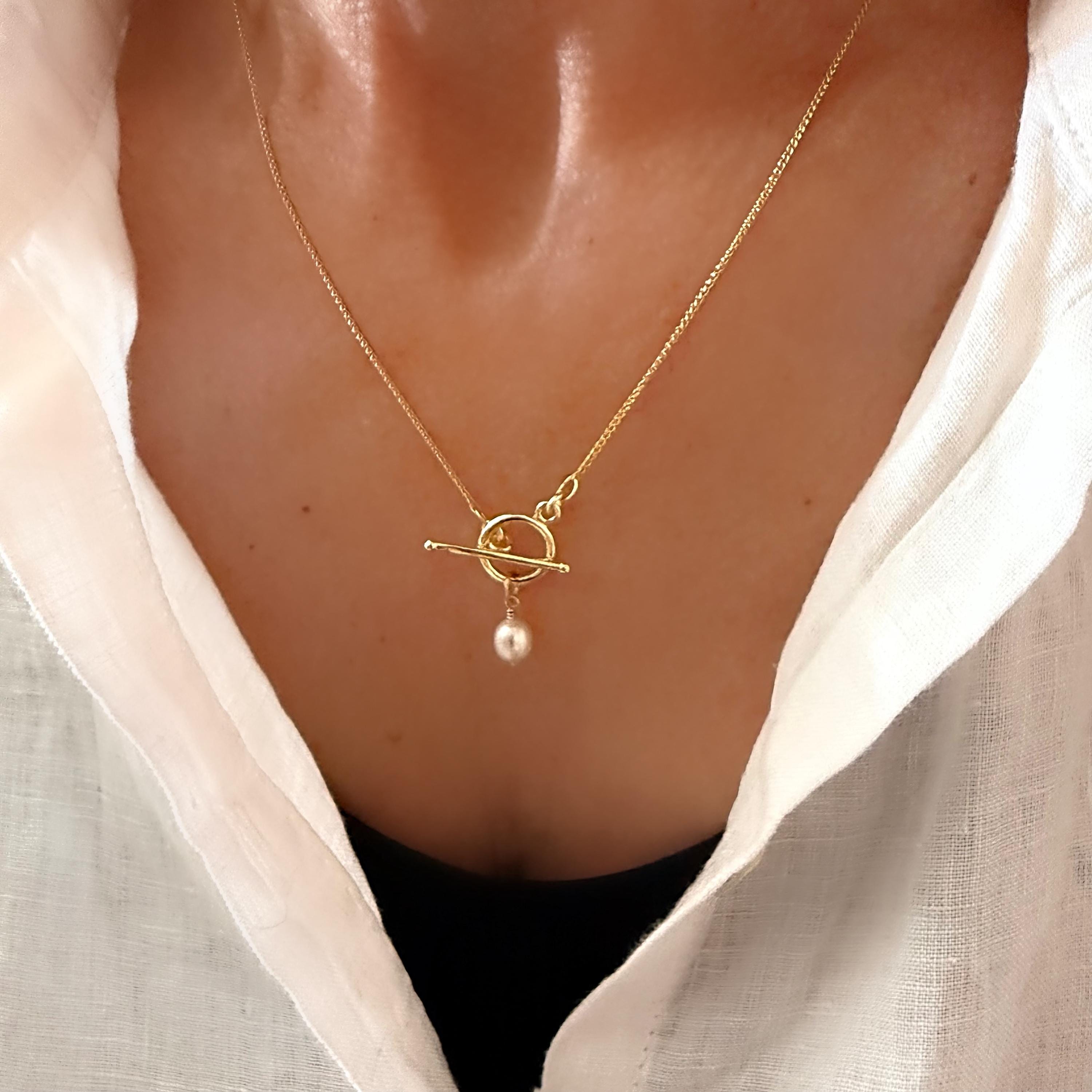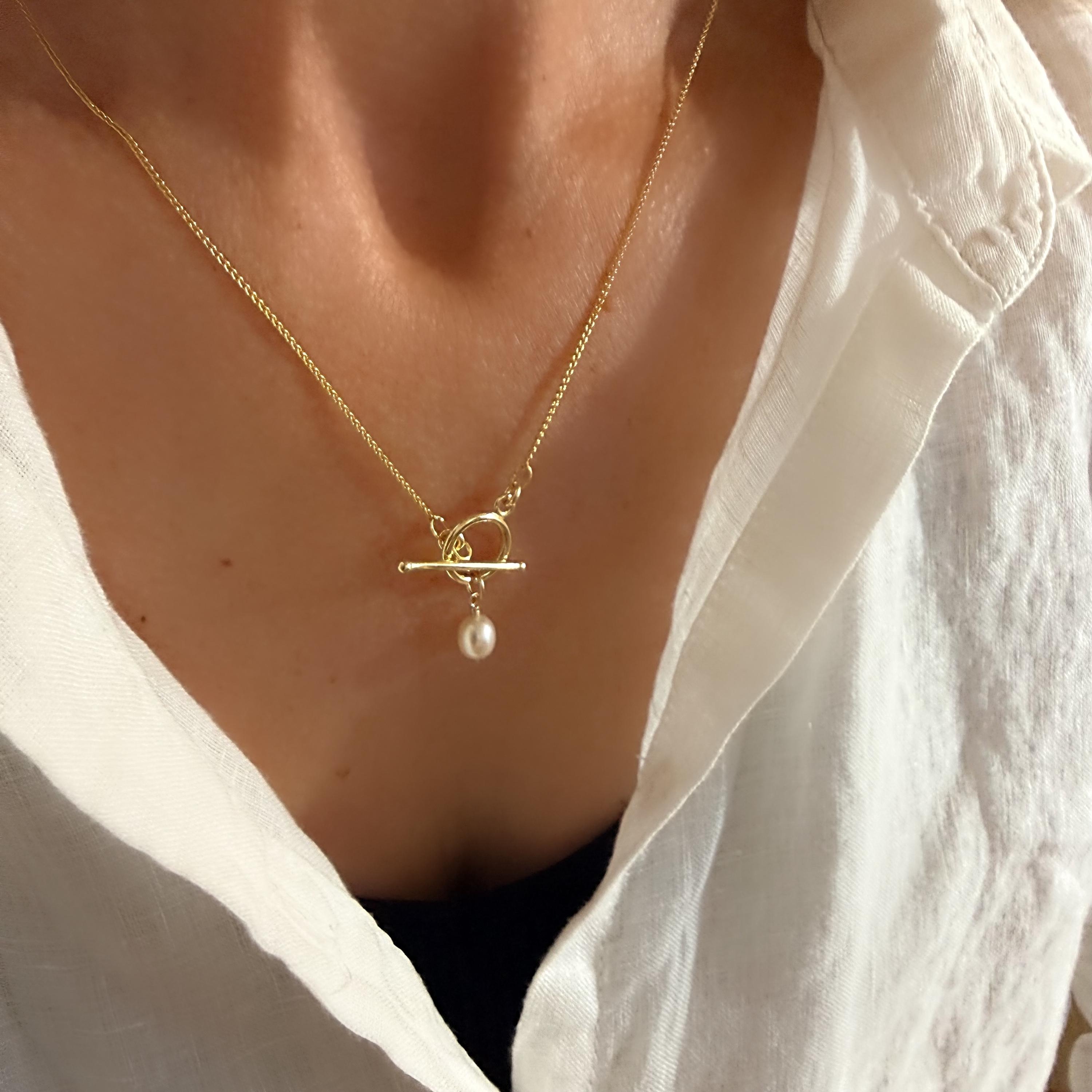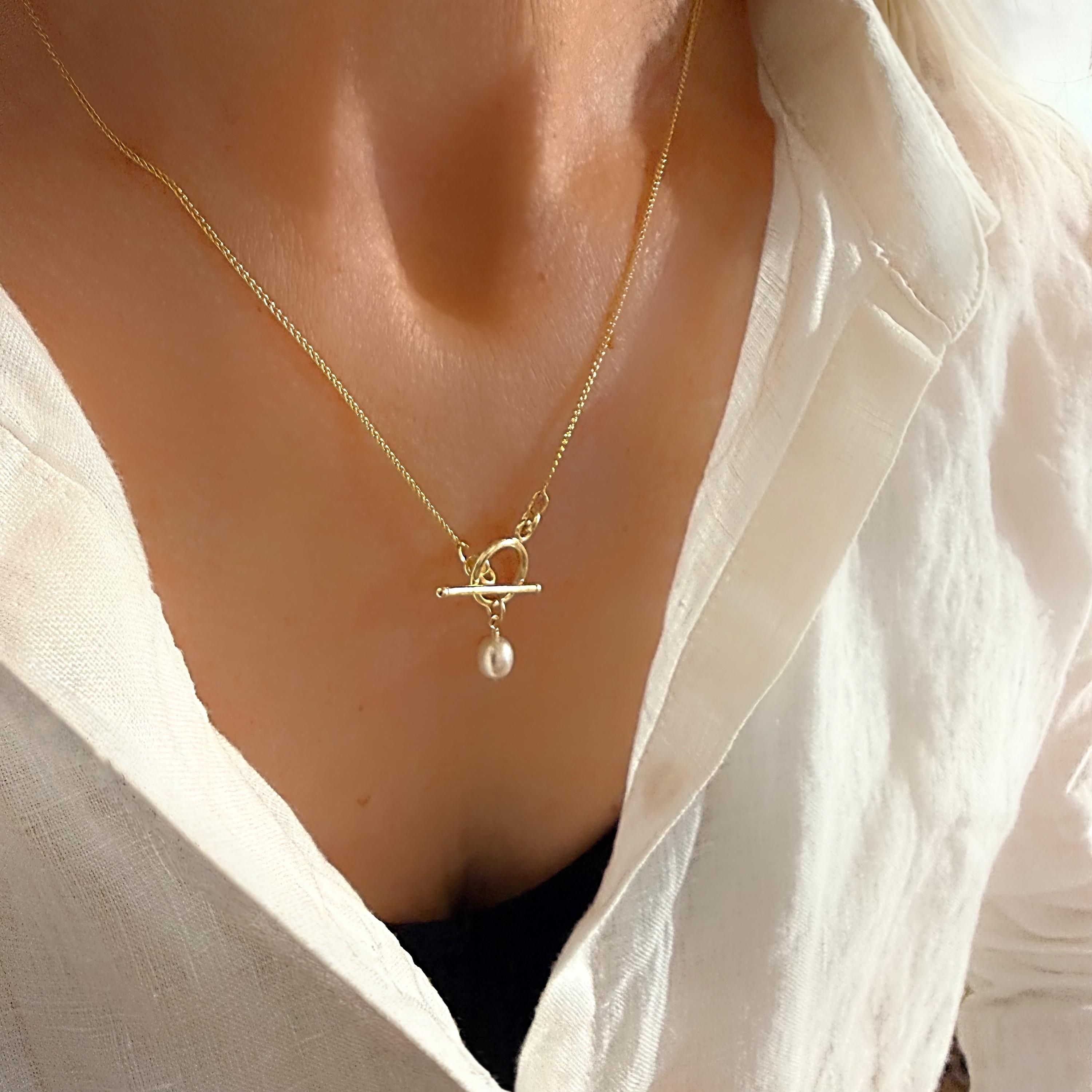 A dainty 14k gold-filled “wheat” chain necklace featuring a toggle clasp and pearl charm.