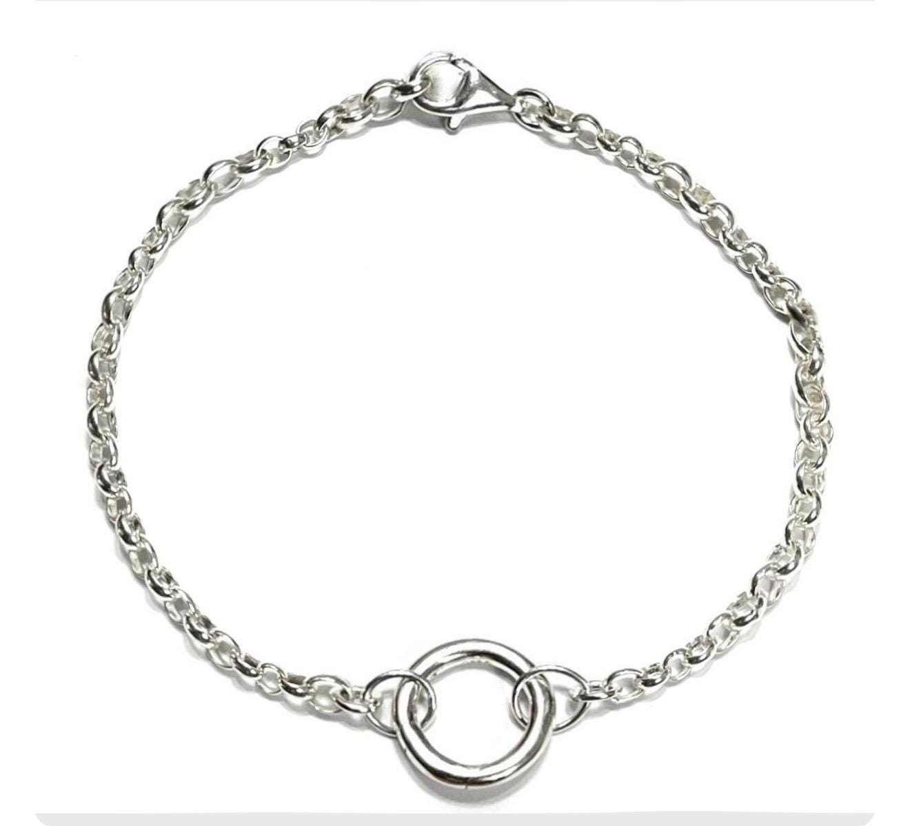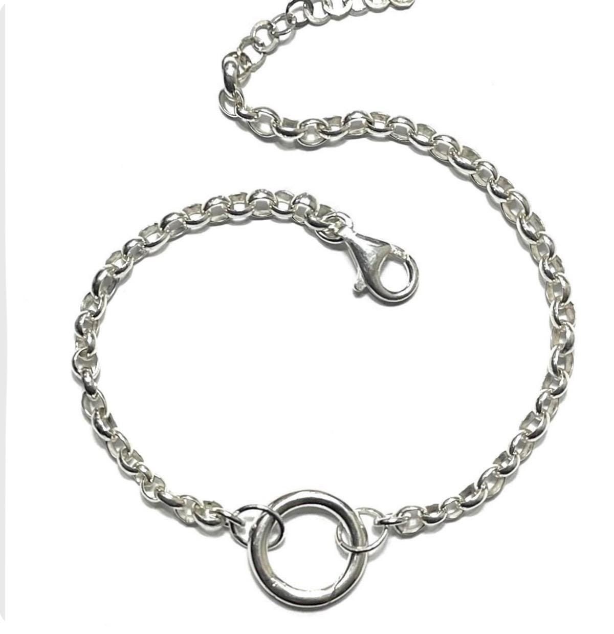 A sterling silver Rolo chain bracelet with a round charm clasp.