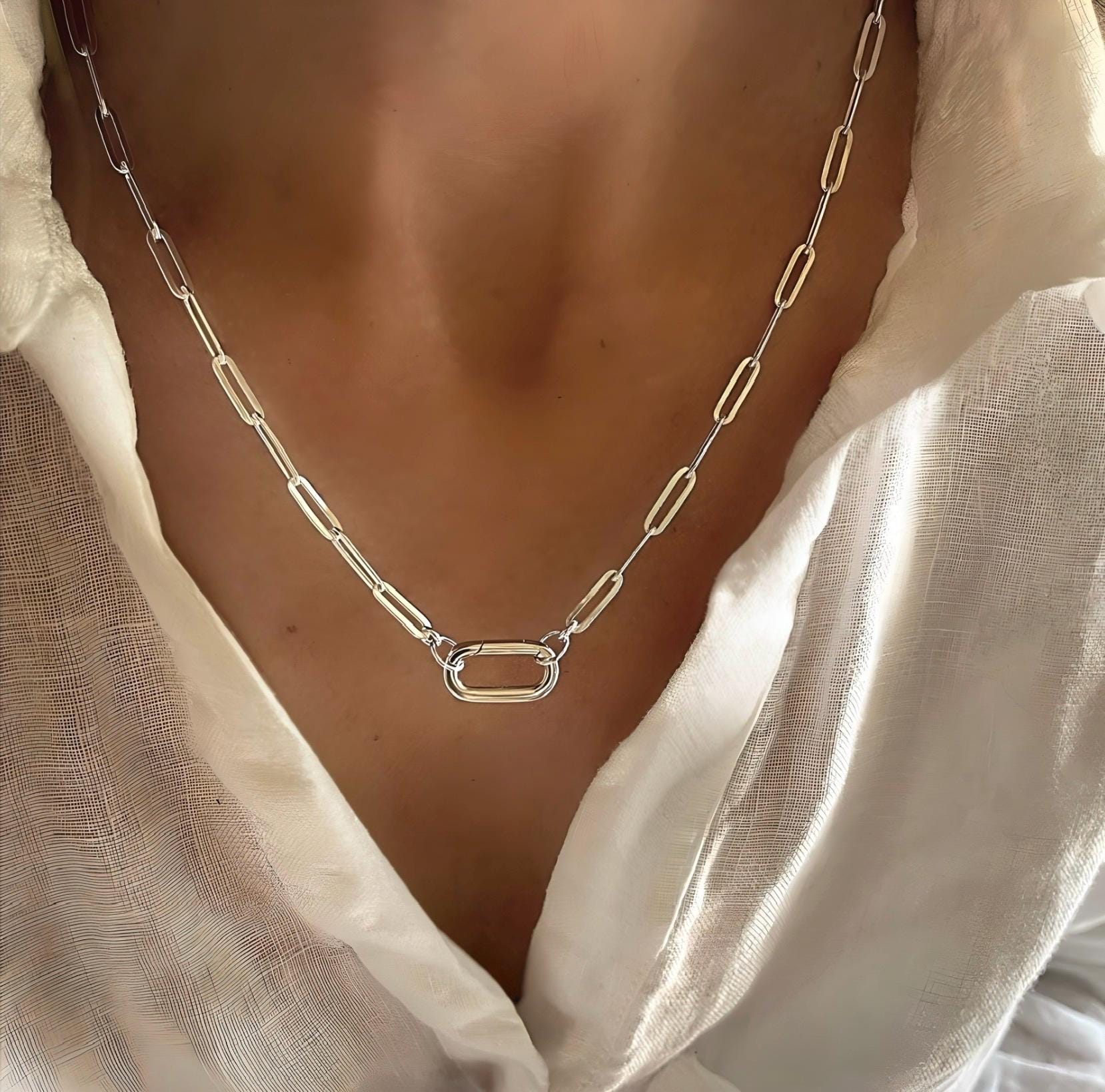 A Flat Paperclip Necklace features an oval carabiner charm collector clasp.