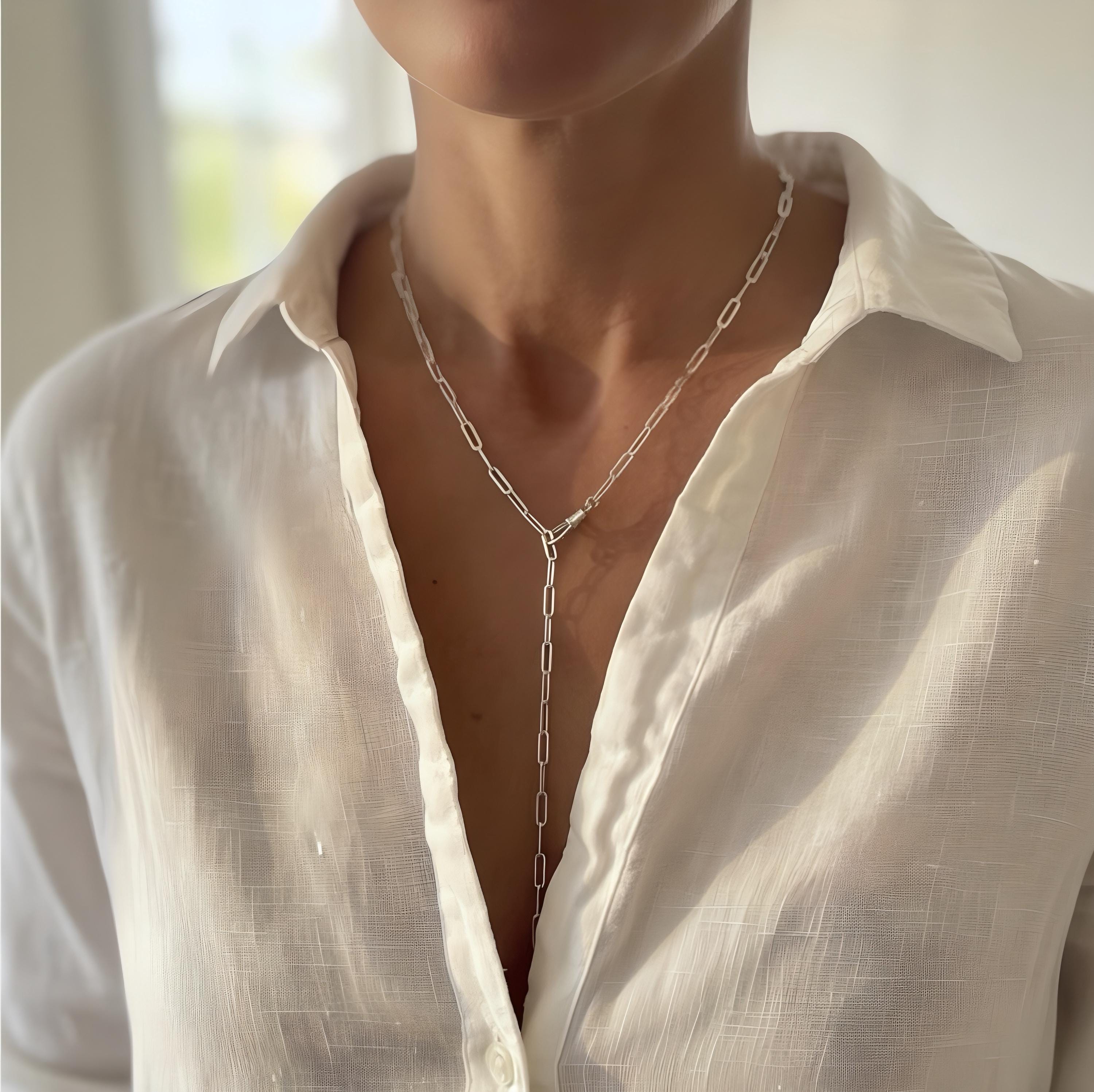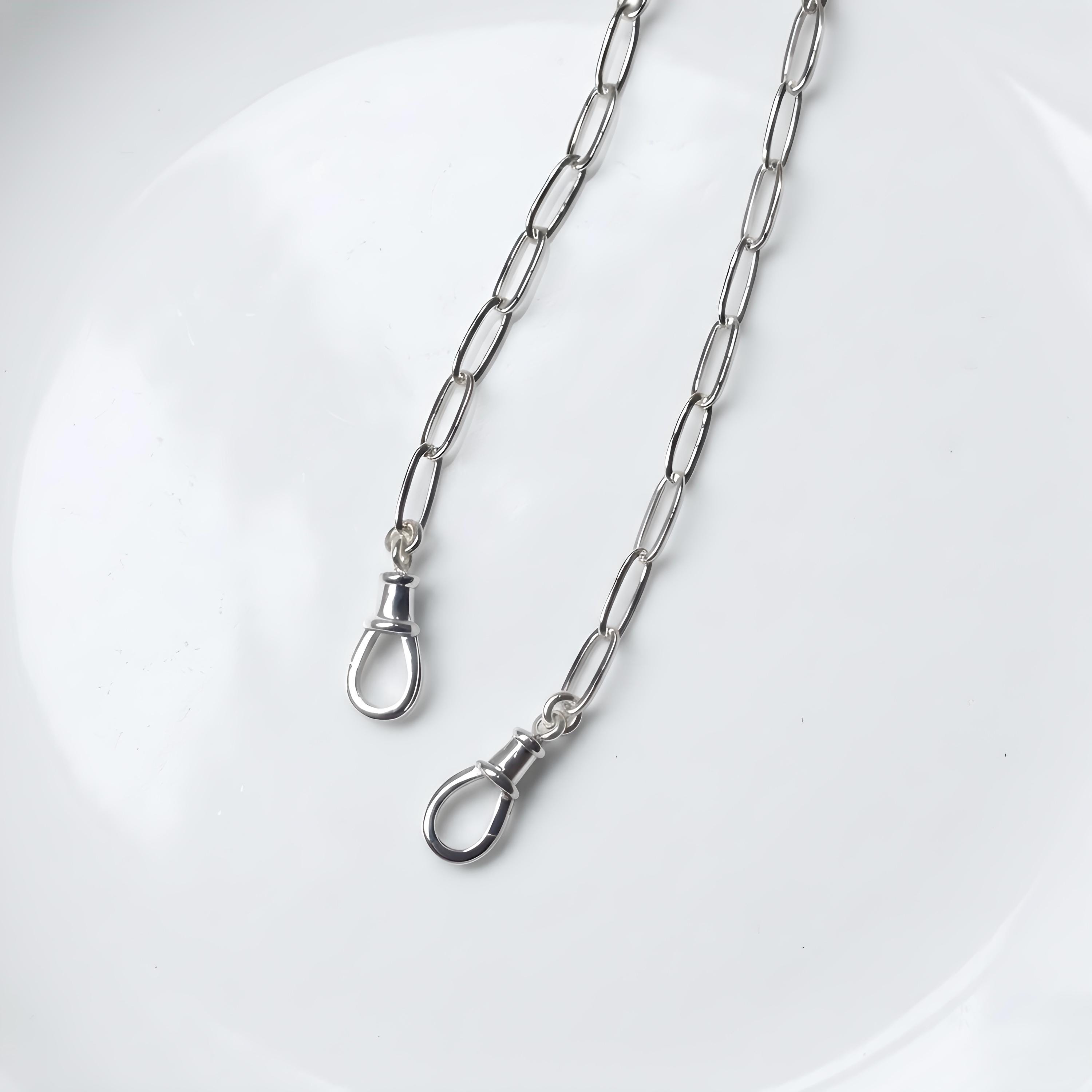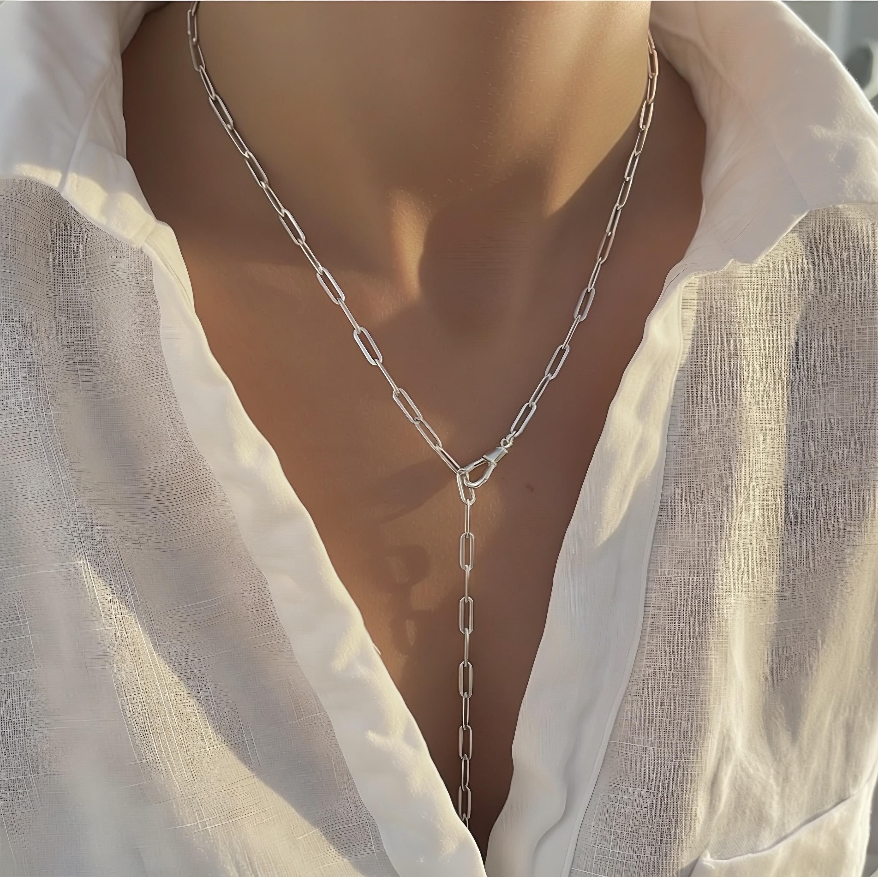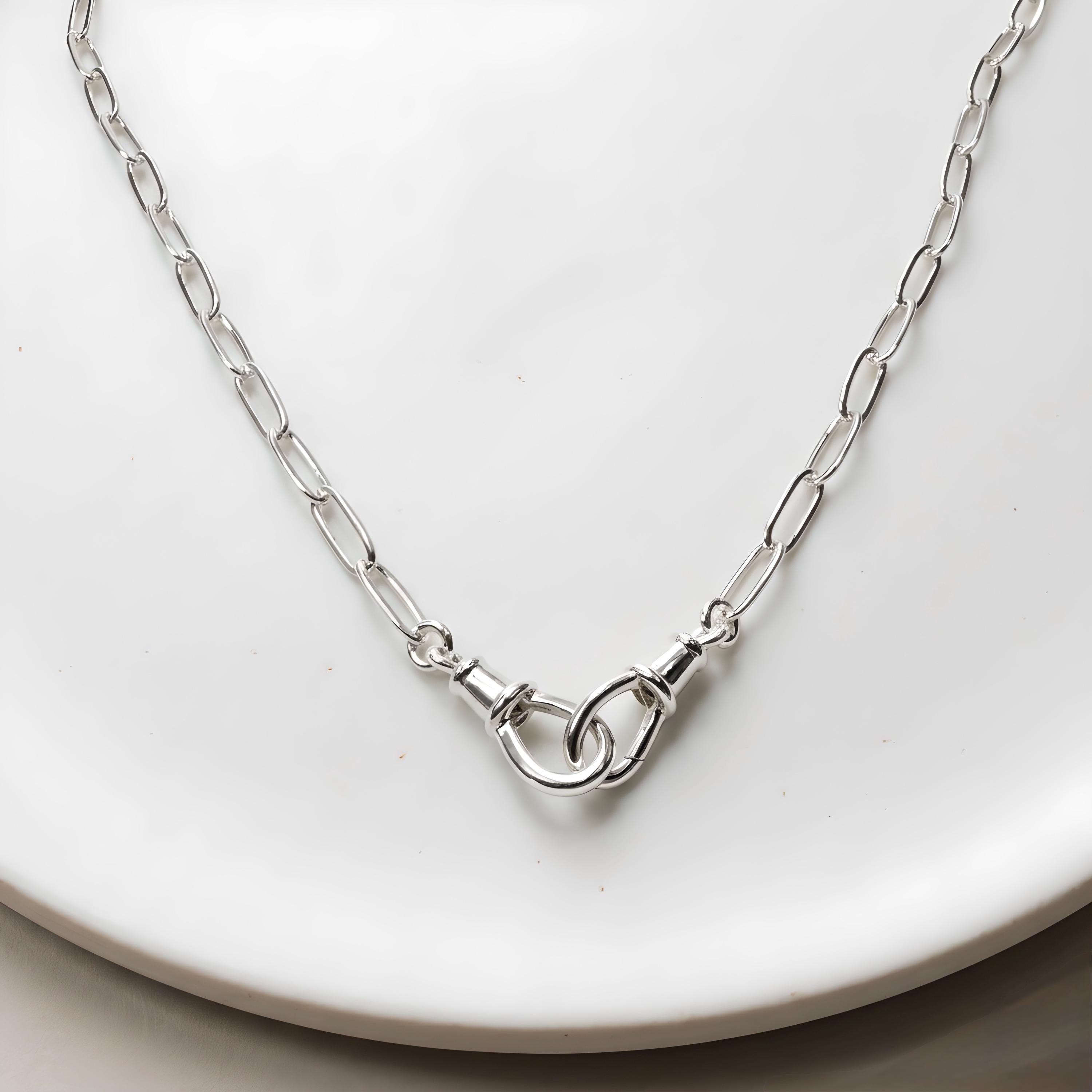 A versatile silver paperclip chain necklace designed to be worn multiple ways. With two swivel Albert watch clasps, this chain can be styled as a charm holder necklace, lariat necklace, or modern layering chain.