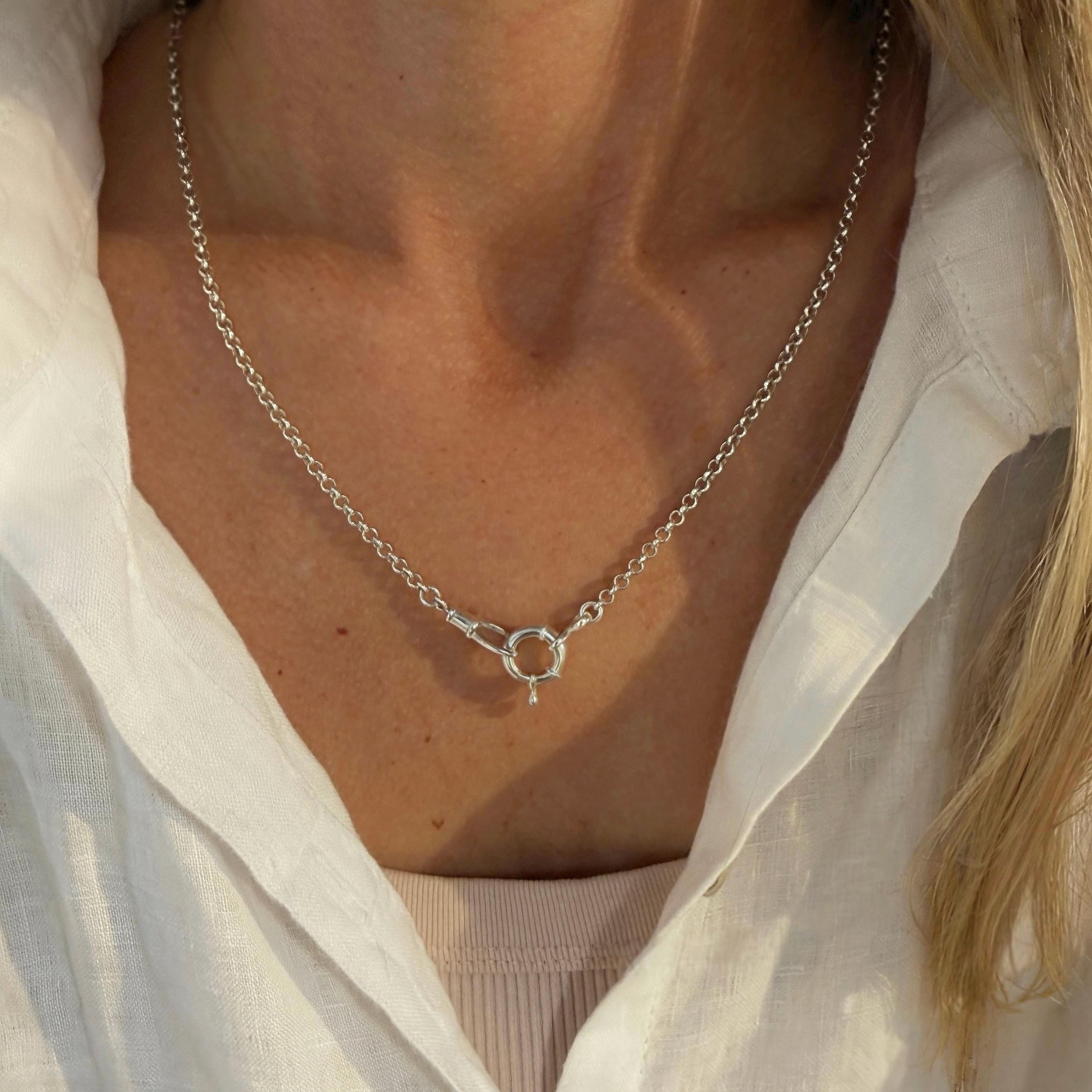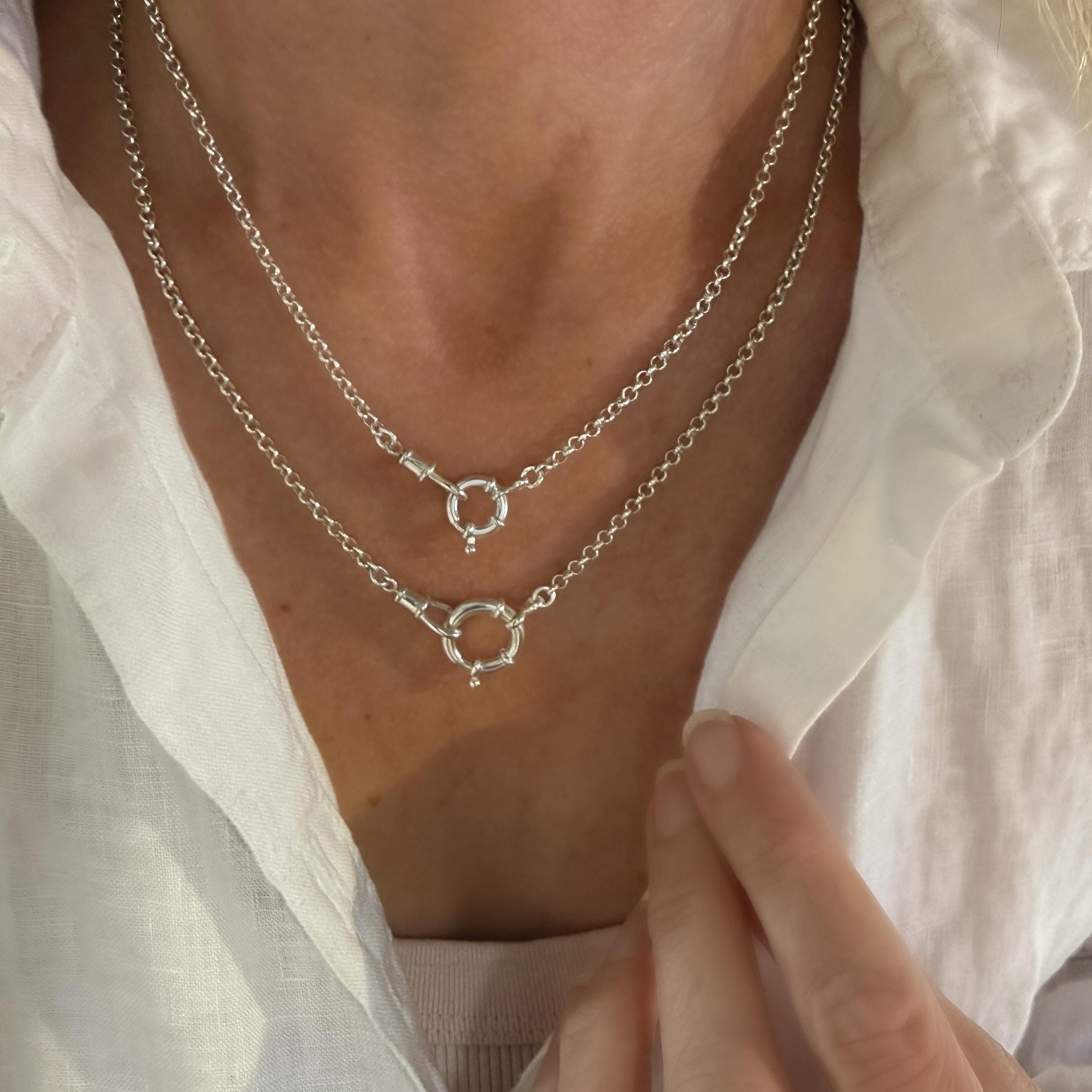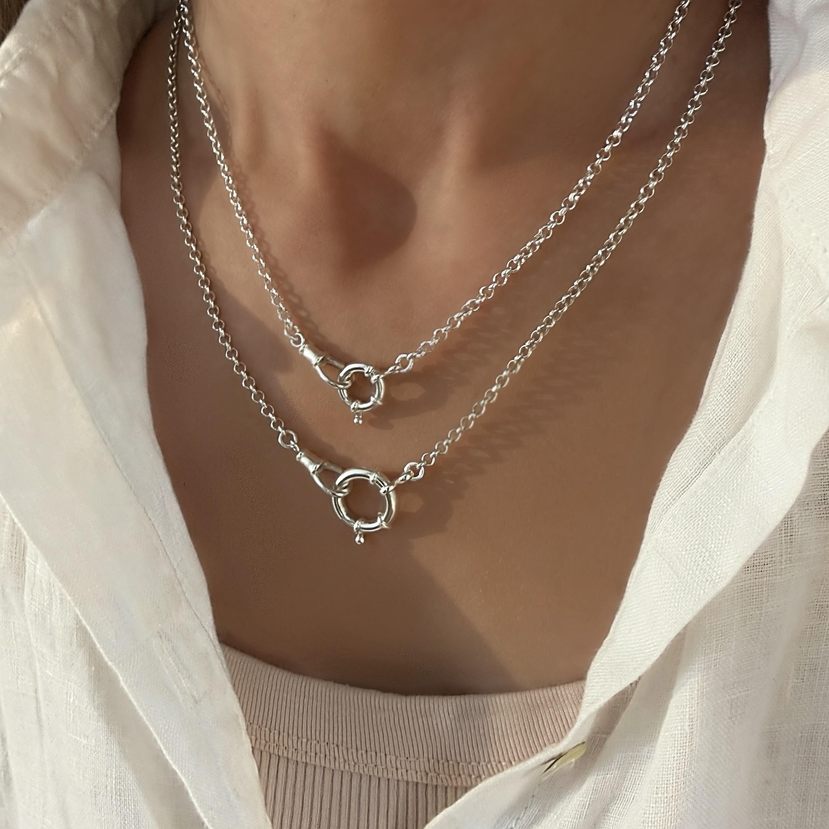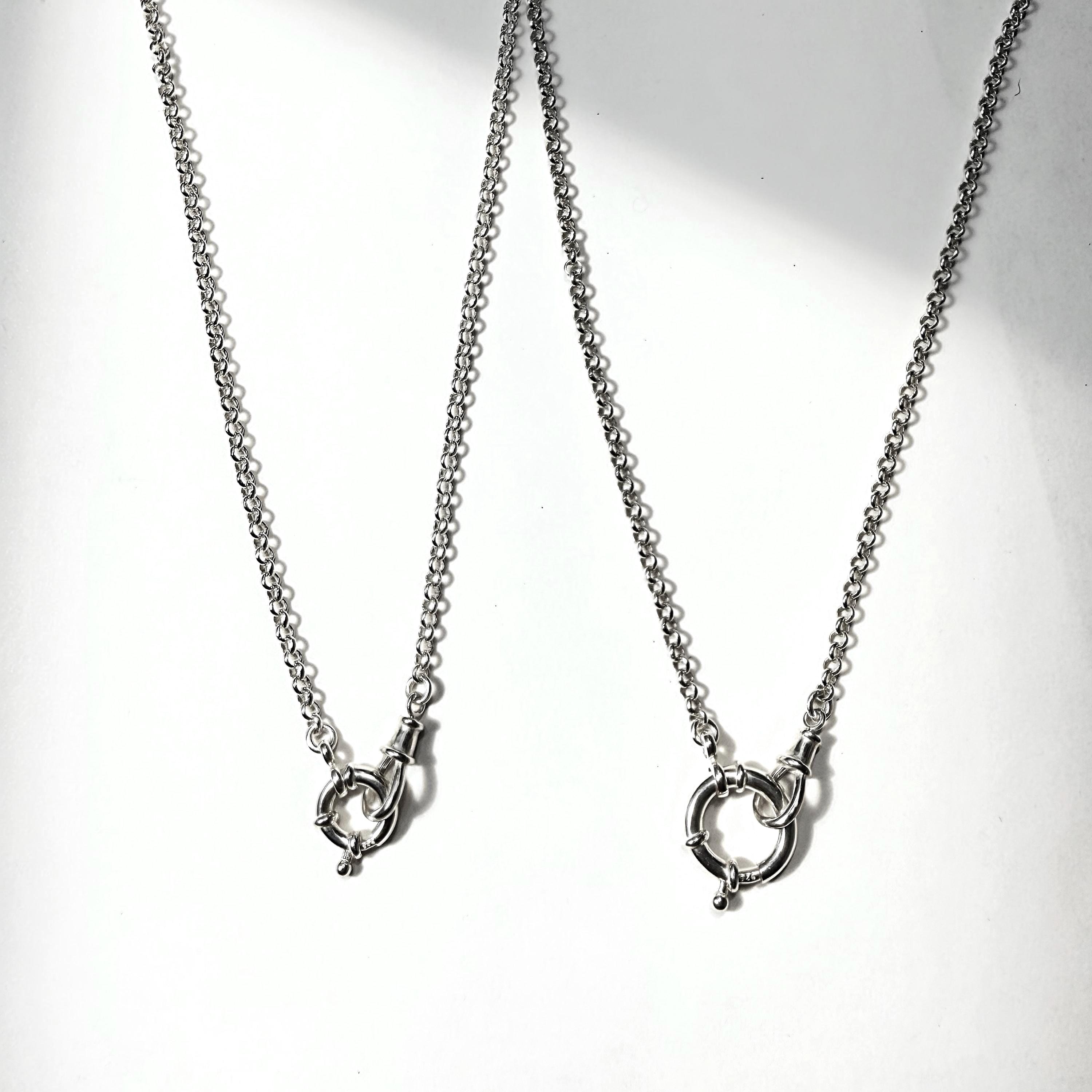 A mariner clasp and an Albert swivel clasp are the feature of this sterling rolo chain necklace.