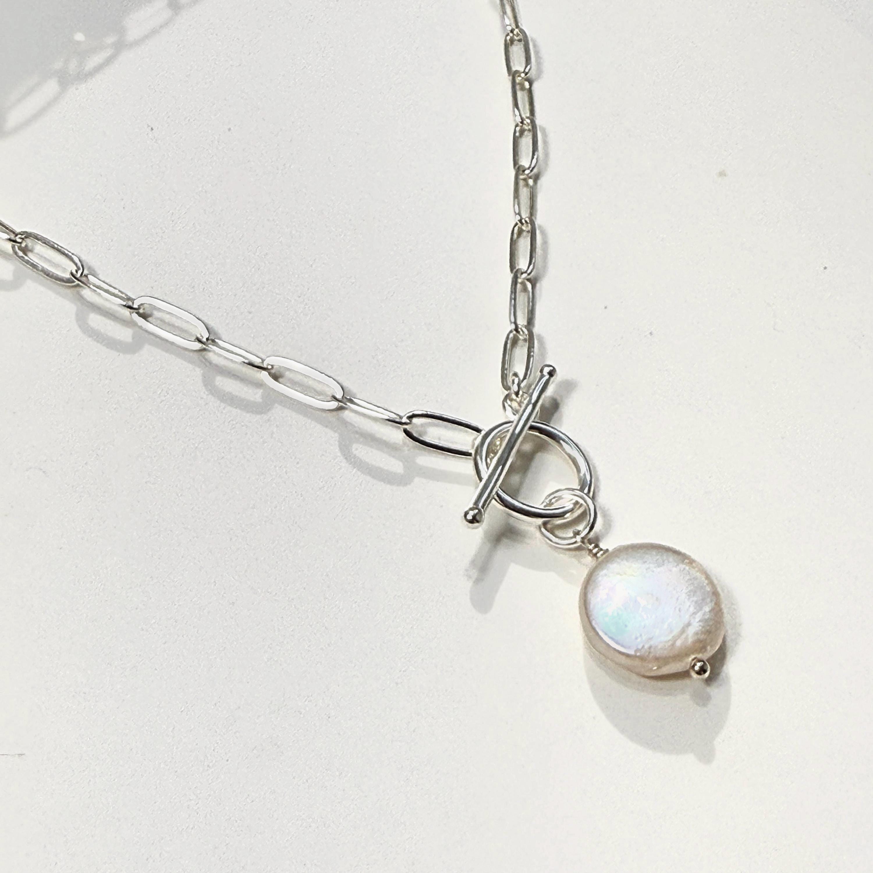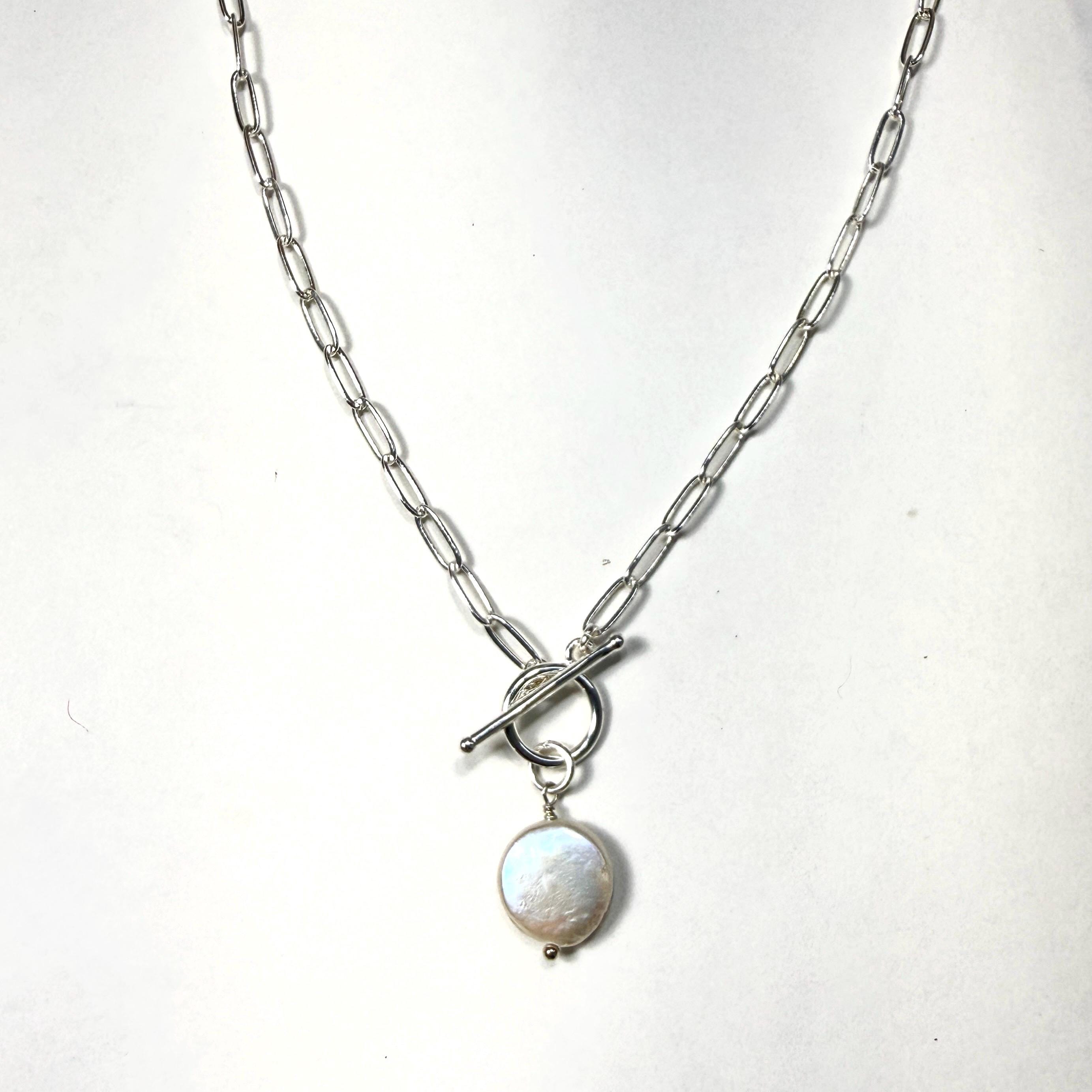 A toggle clasp and coin pearl are the focal point of this classic paperclip necklace.