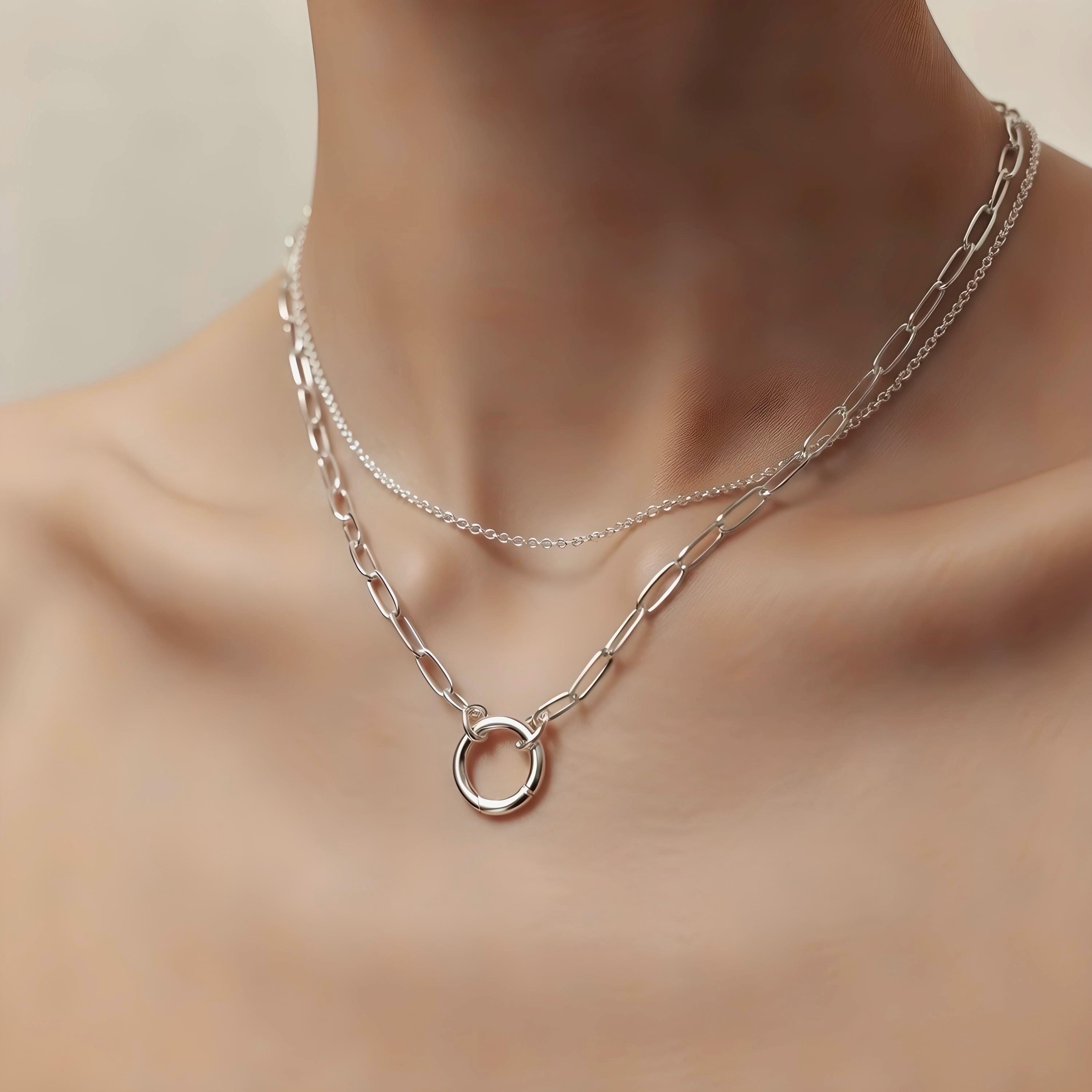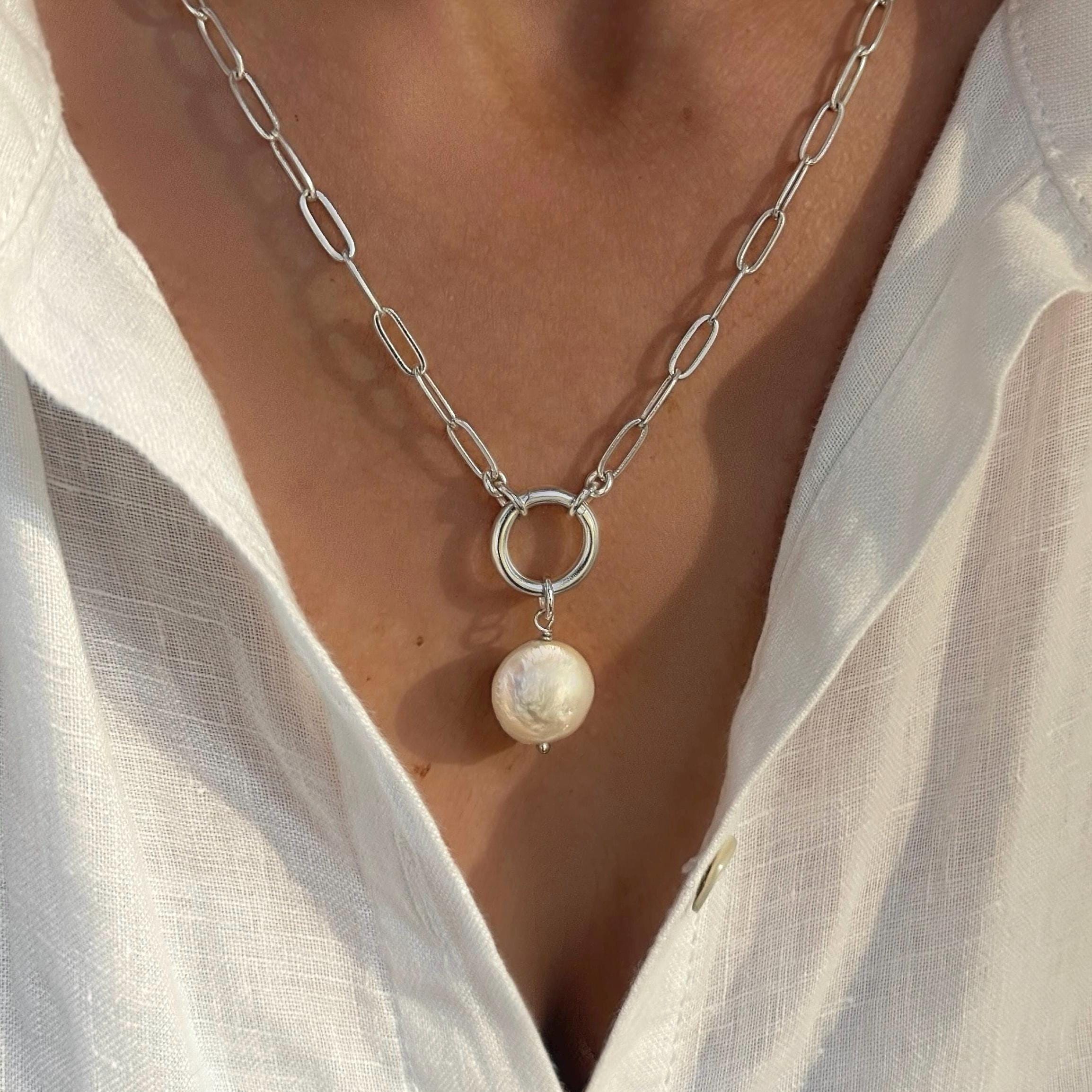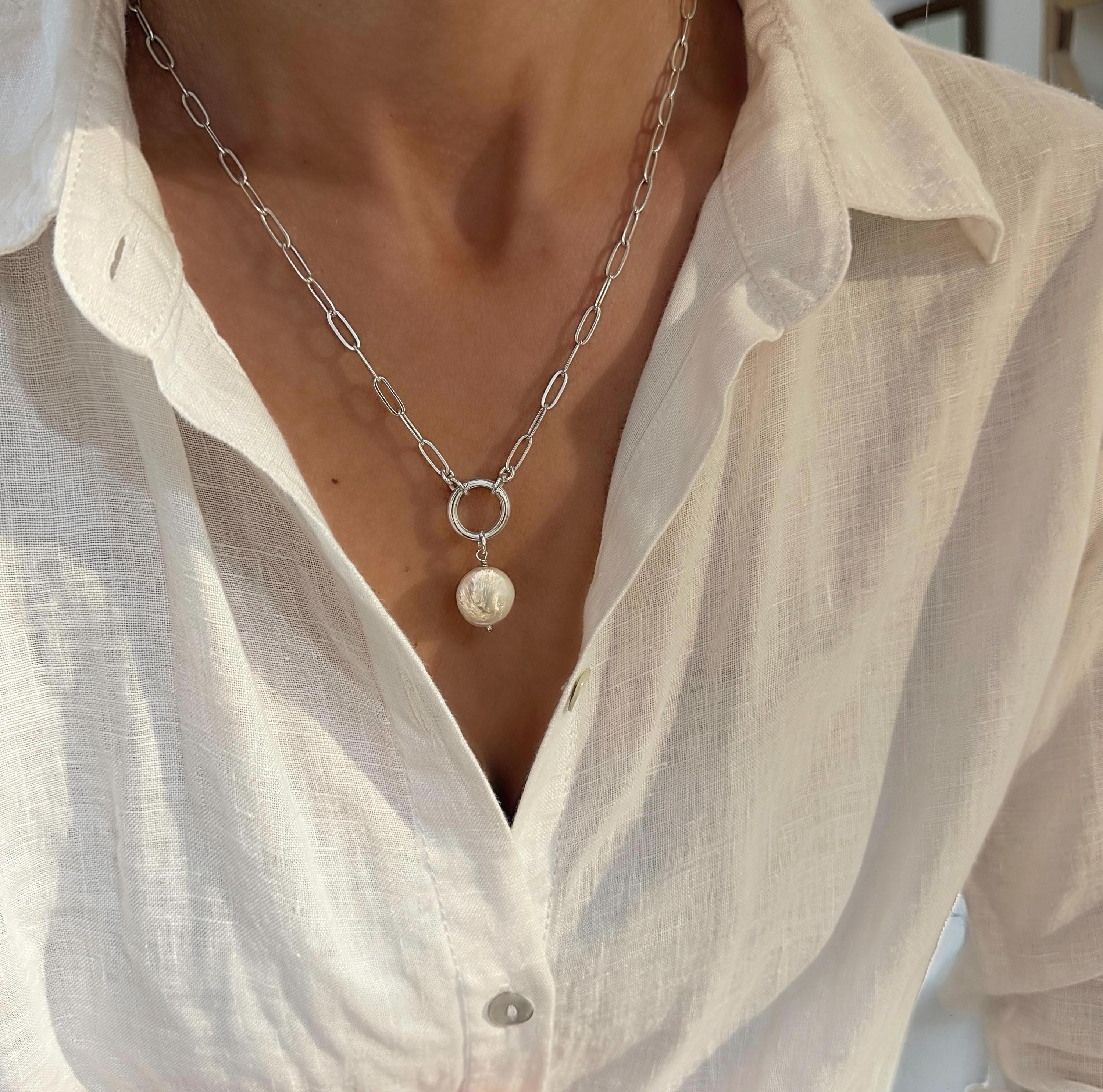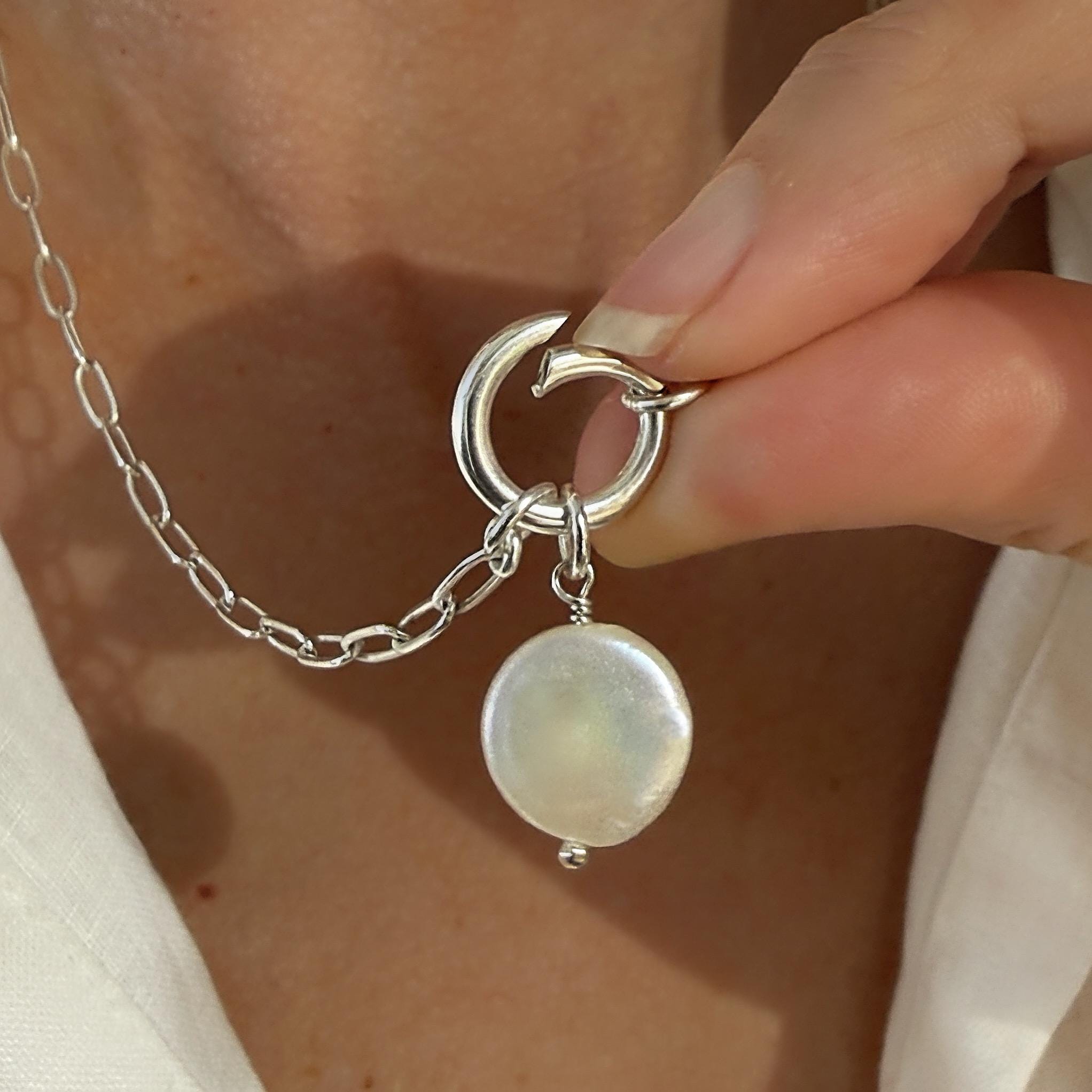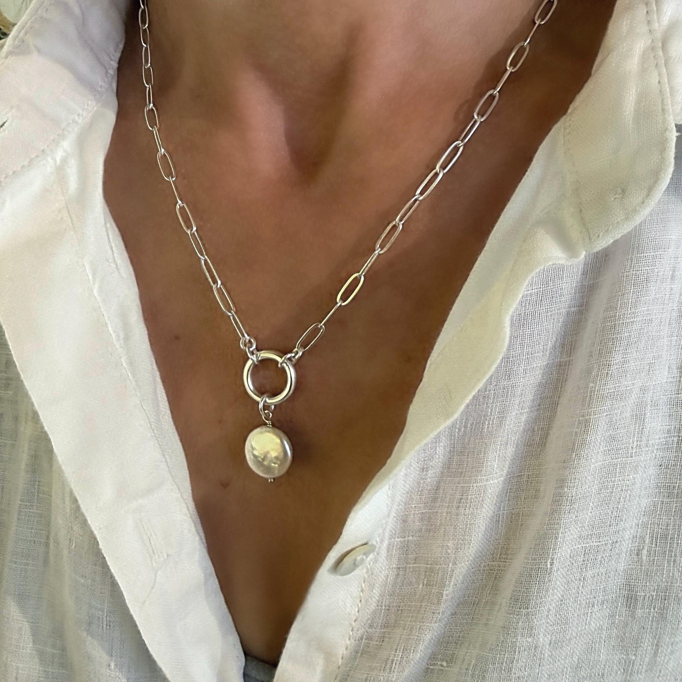 A modern silver paperclip chain necklace designed for versatility, this piece features a front-facing charm clasp and a removable coin pearl pendant—perfect for creating your own layered, personalized look.