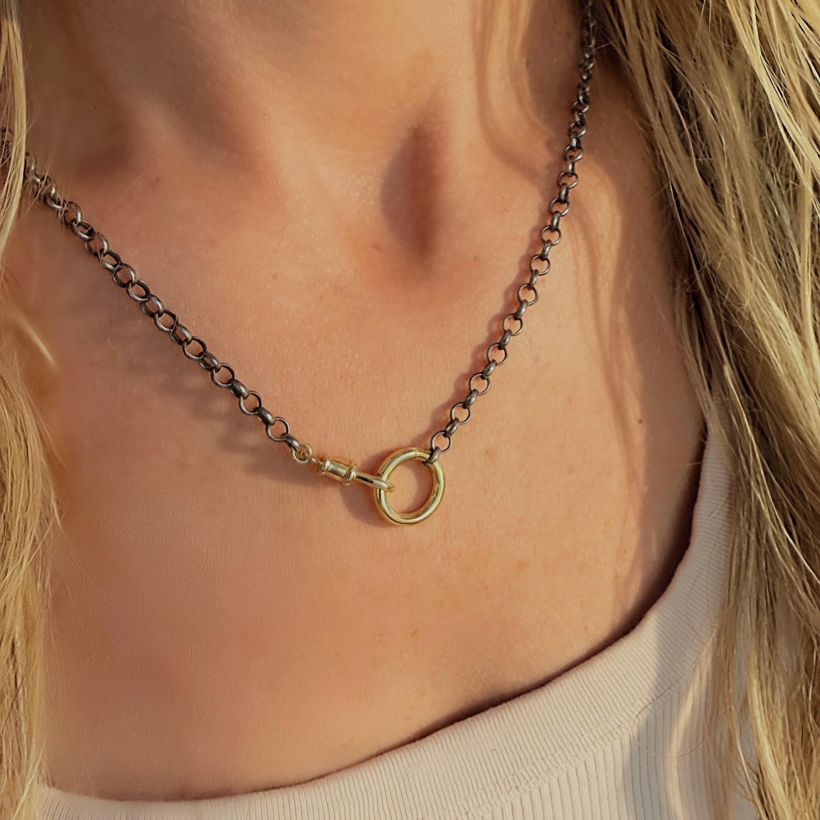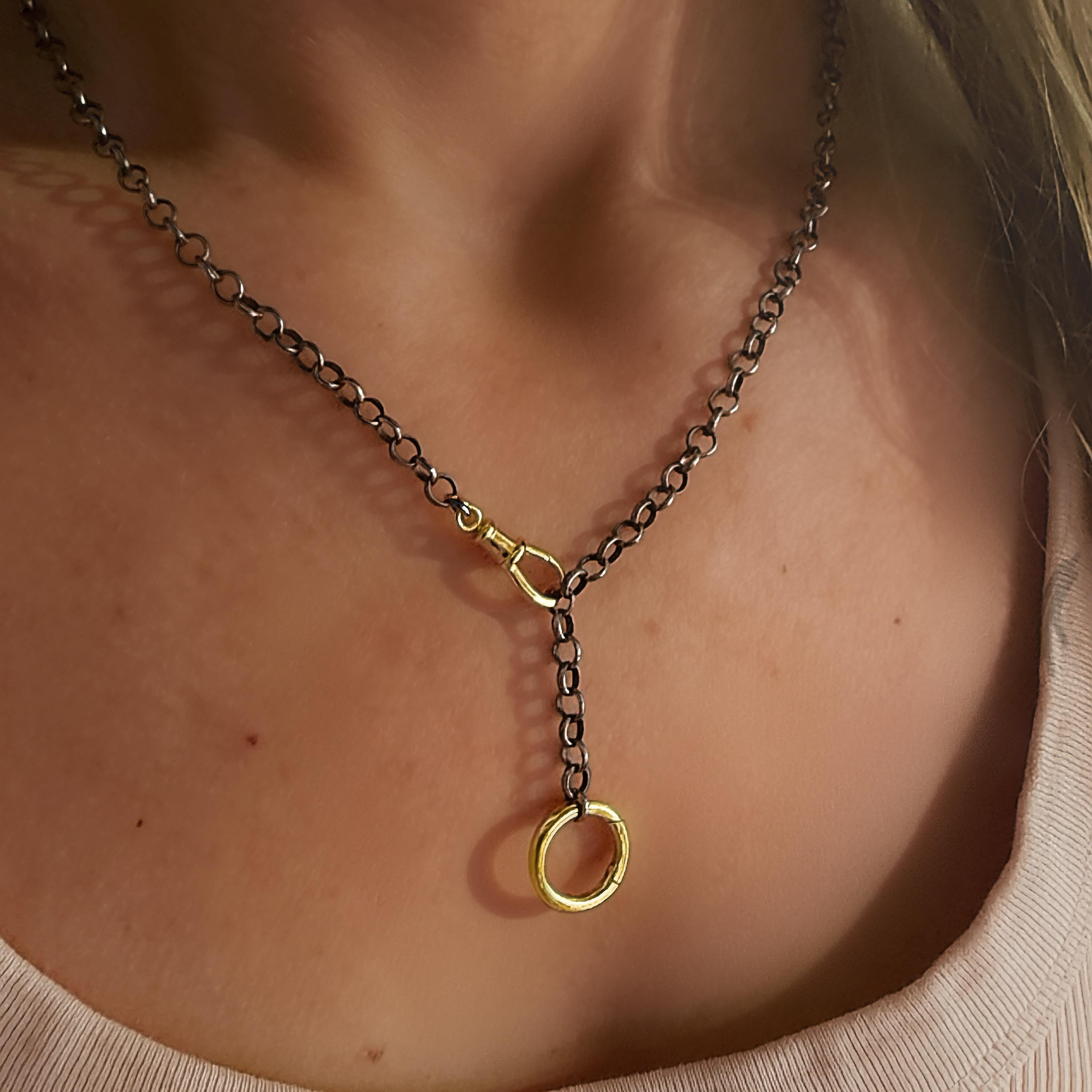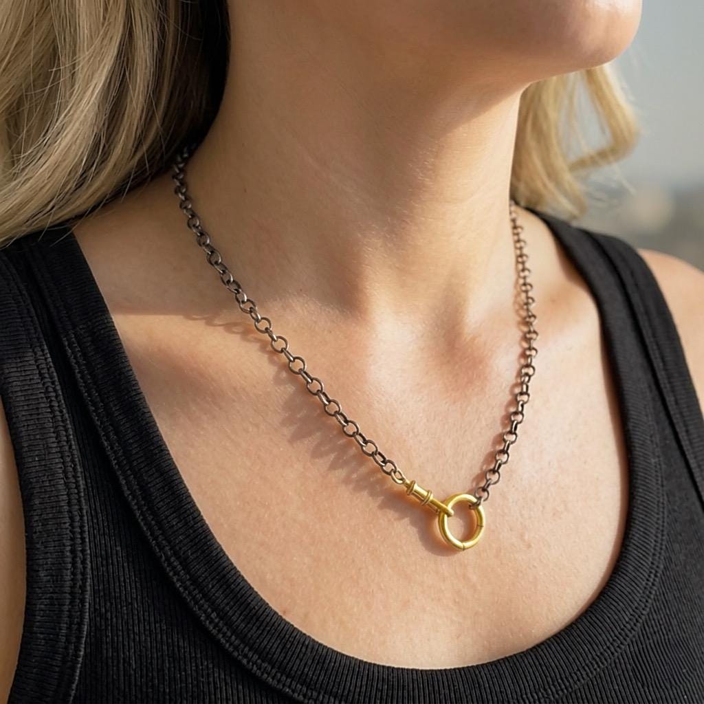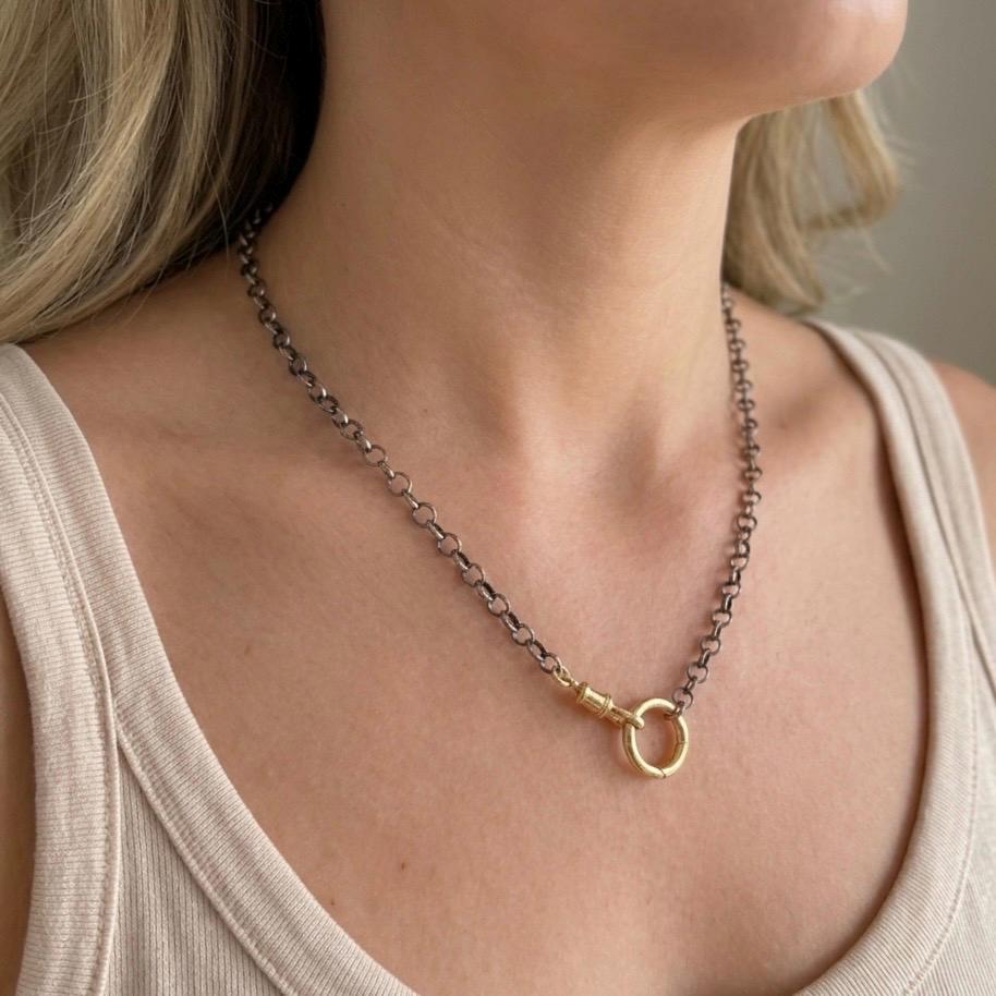 An oxidized Rolo Chain with 2 gold clasp - a swivel clasp and a round charm holder clasp - allow for many styling options: