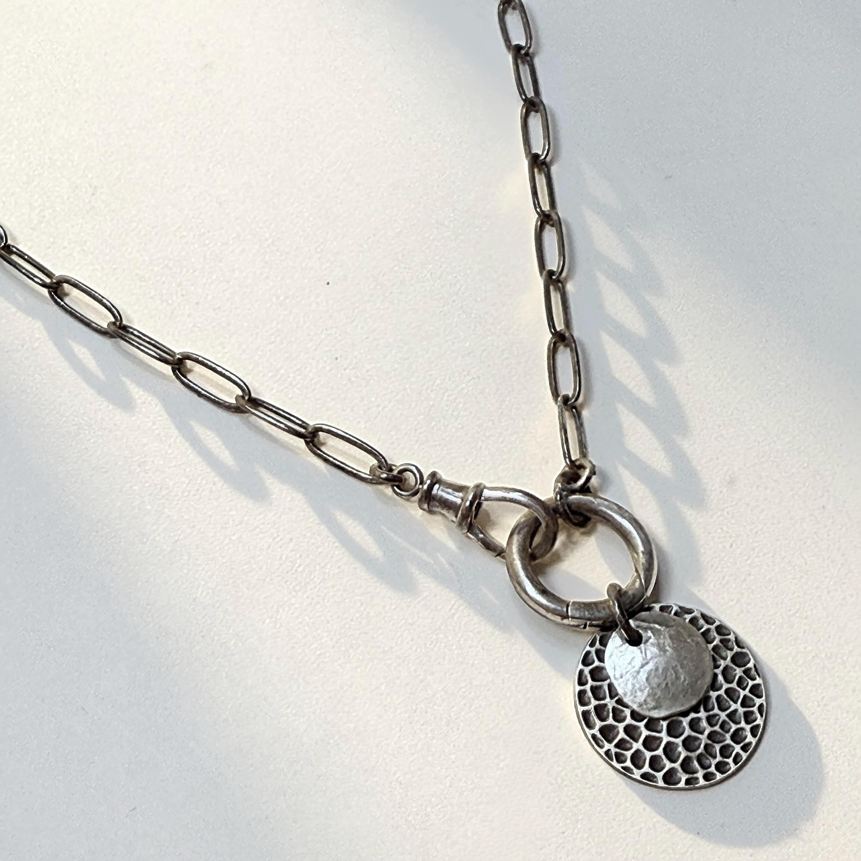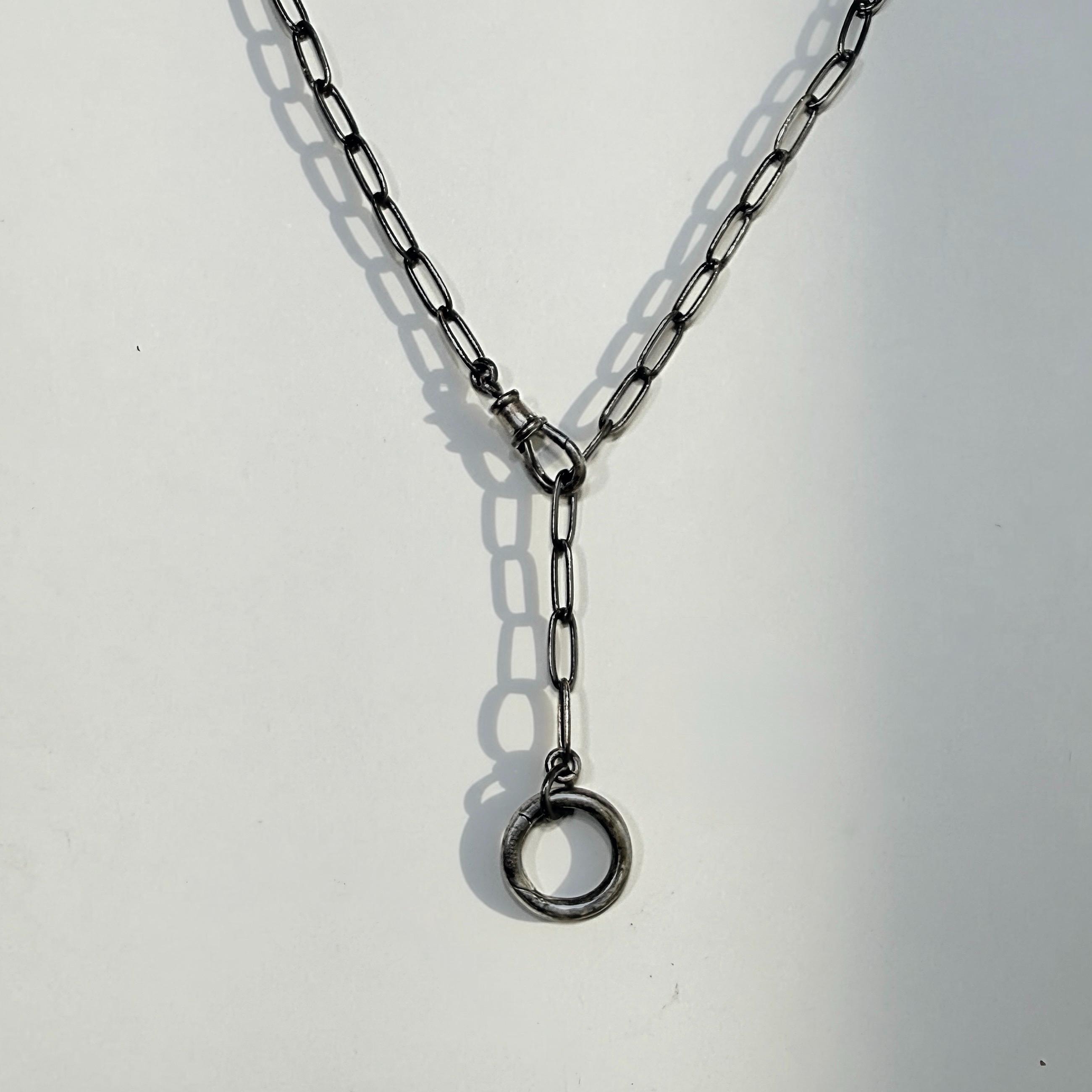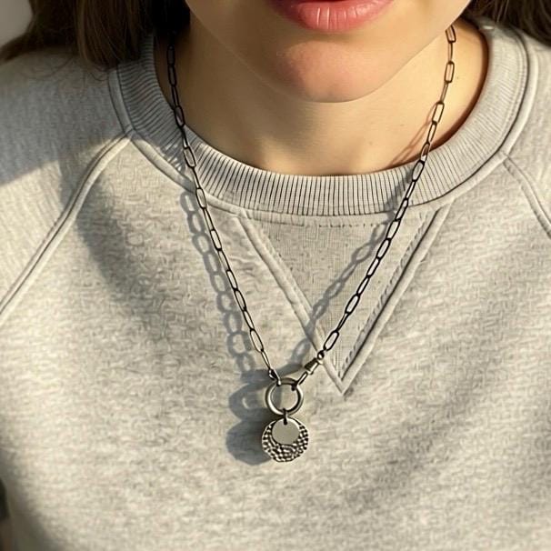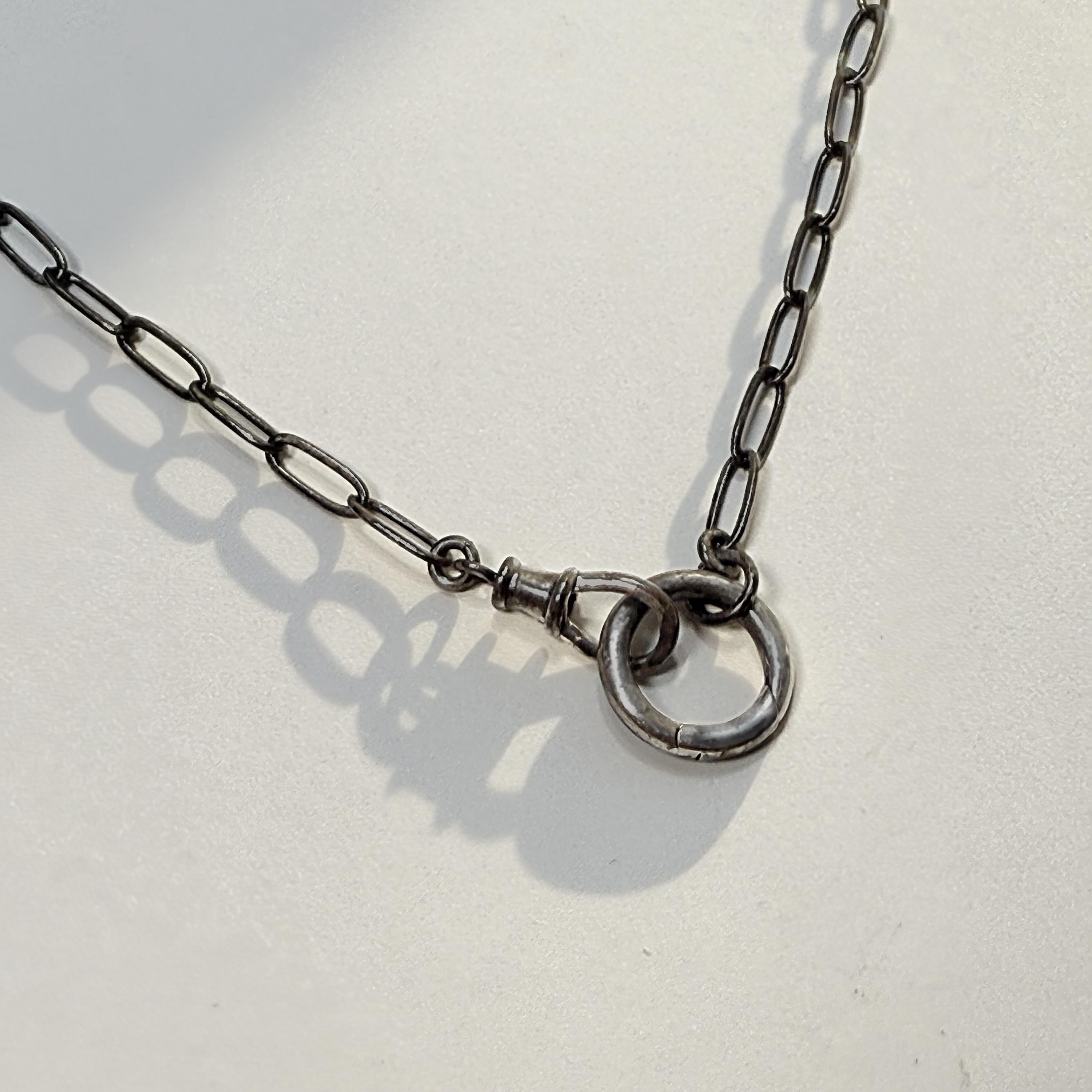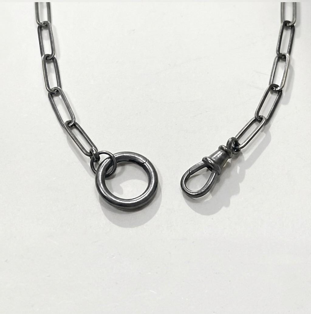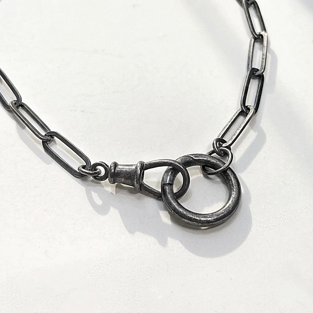 An oxidized paperclip necklace with 2 interlocking clasps.