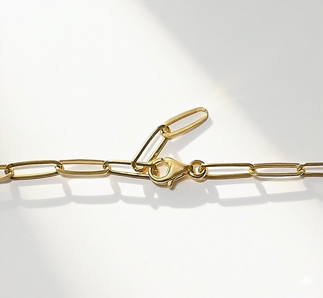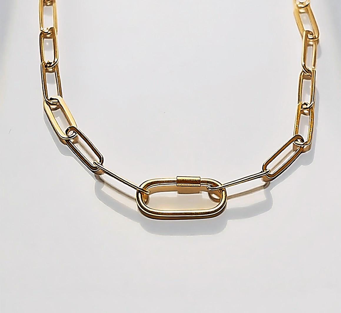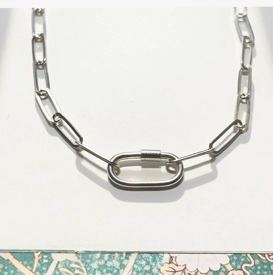 A minimalist paperclip necklace features an oval screw carabiner charm clasp at the front.