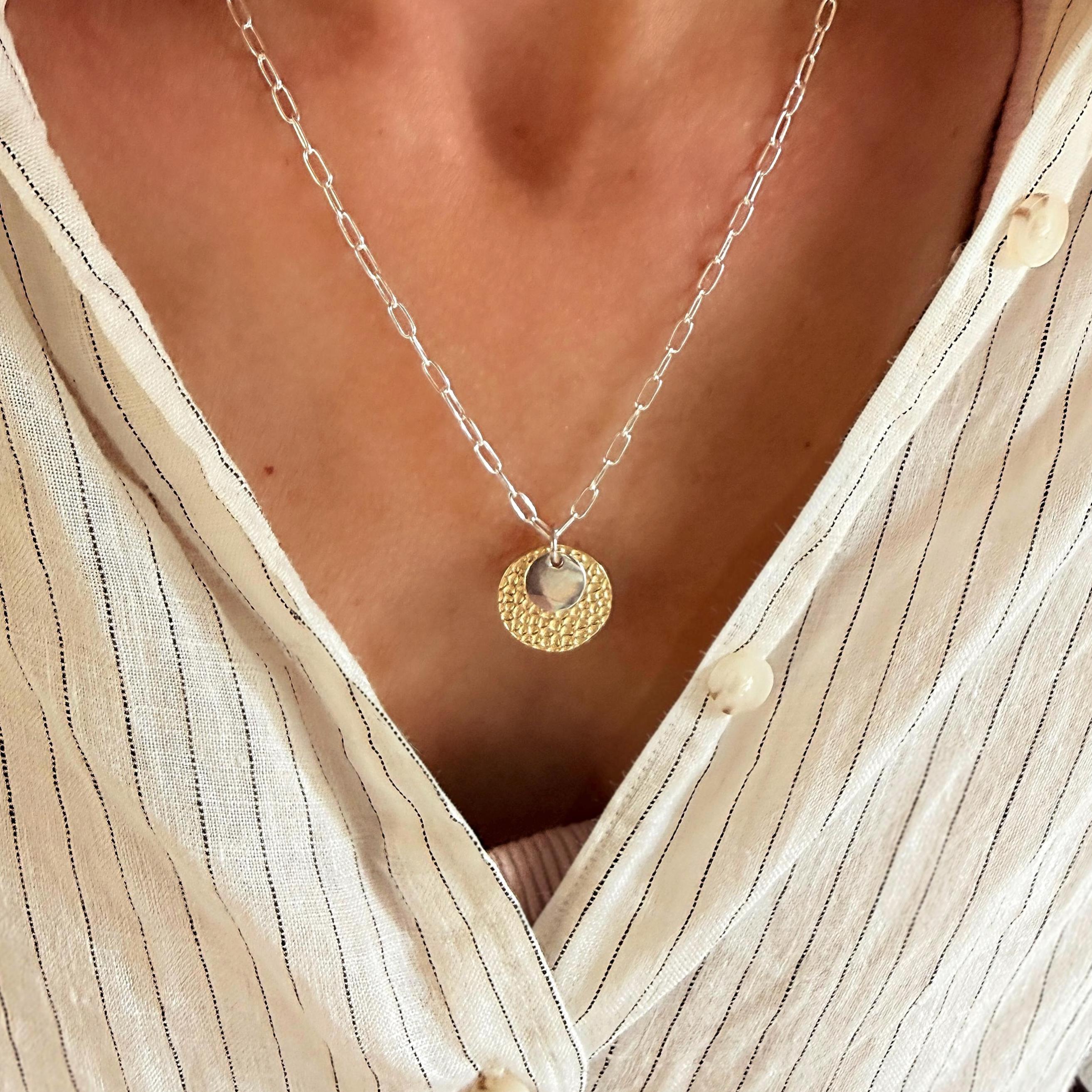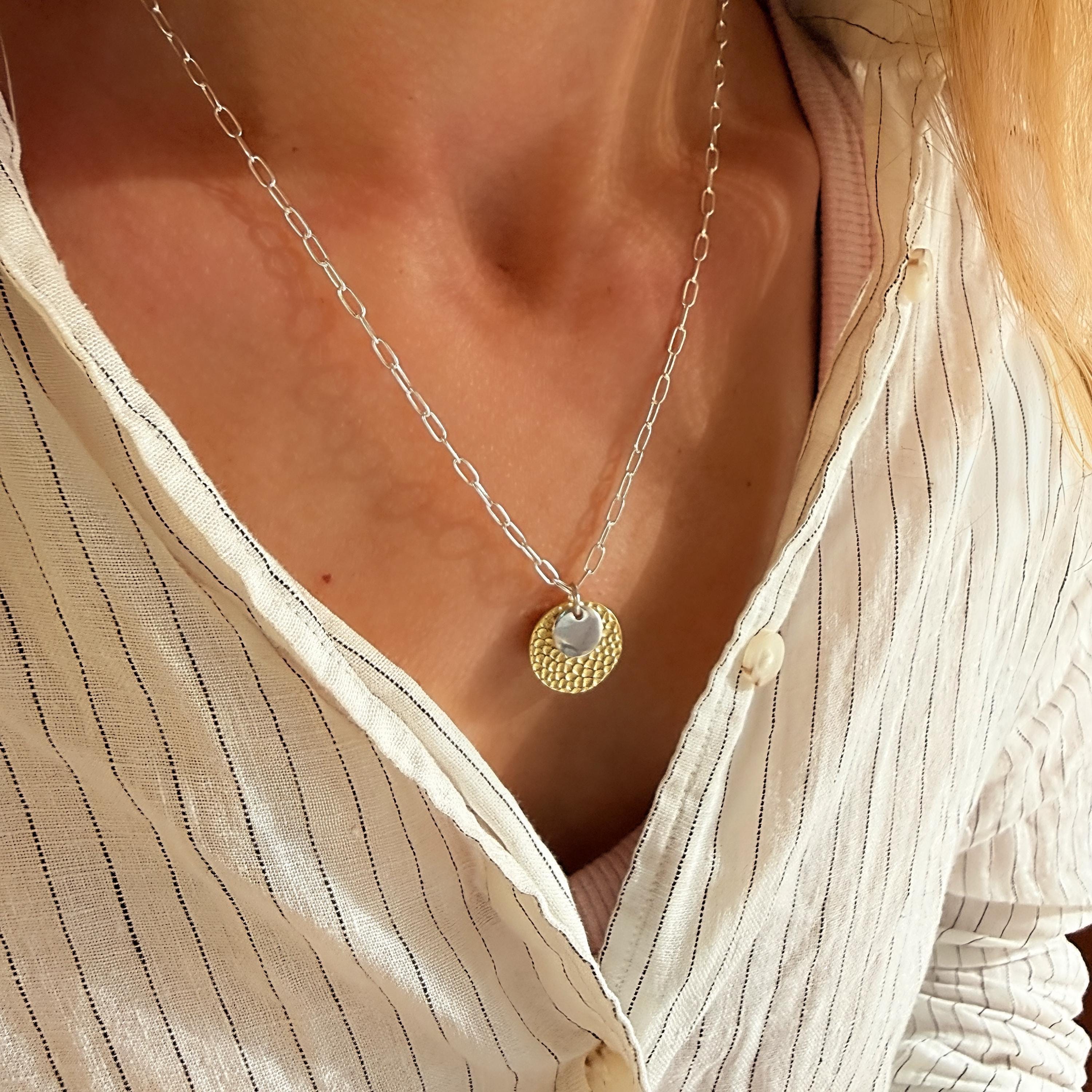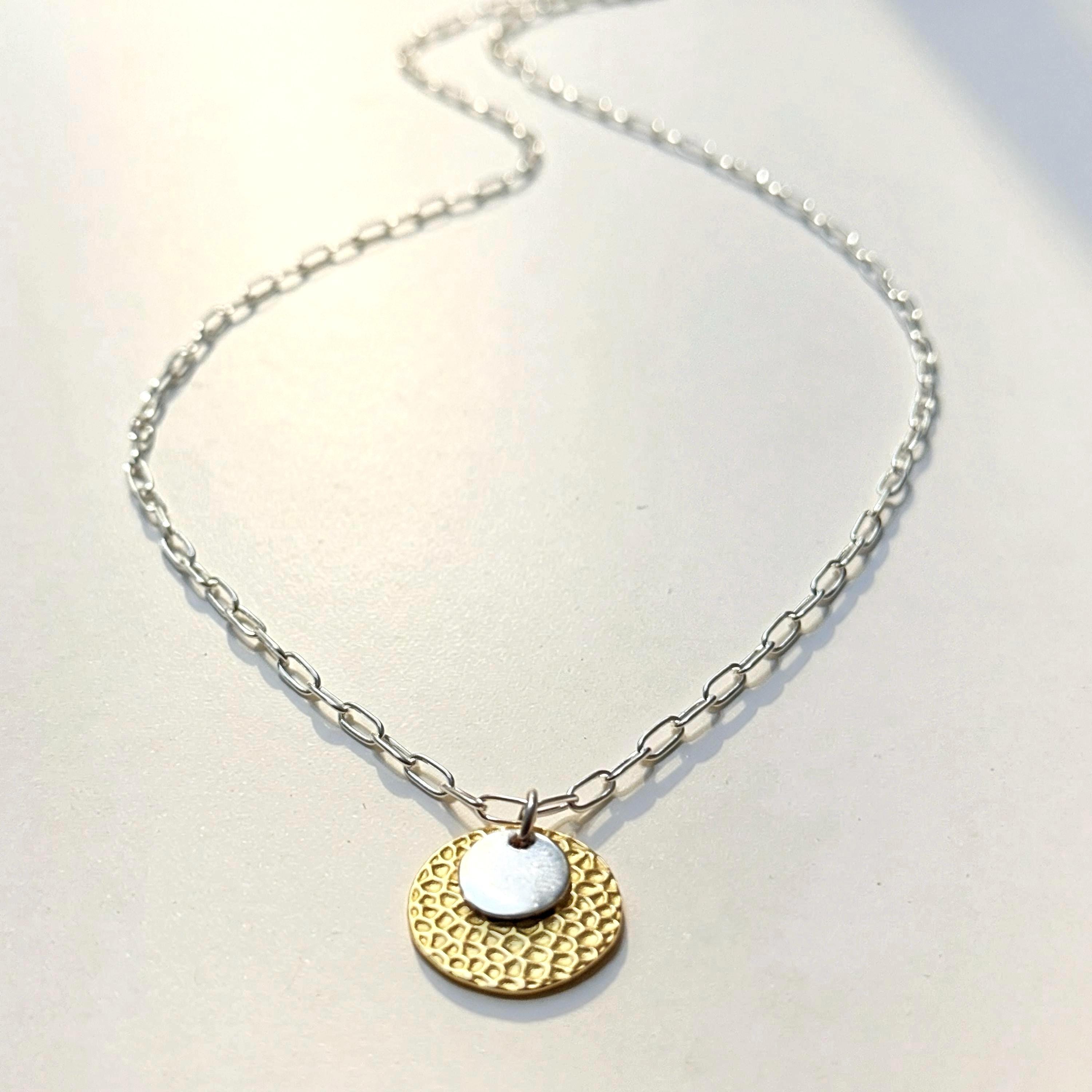 The pendant is a small sterling silver disc layered over a larger gold vermeil disc.